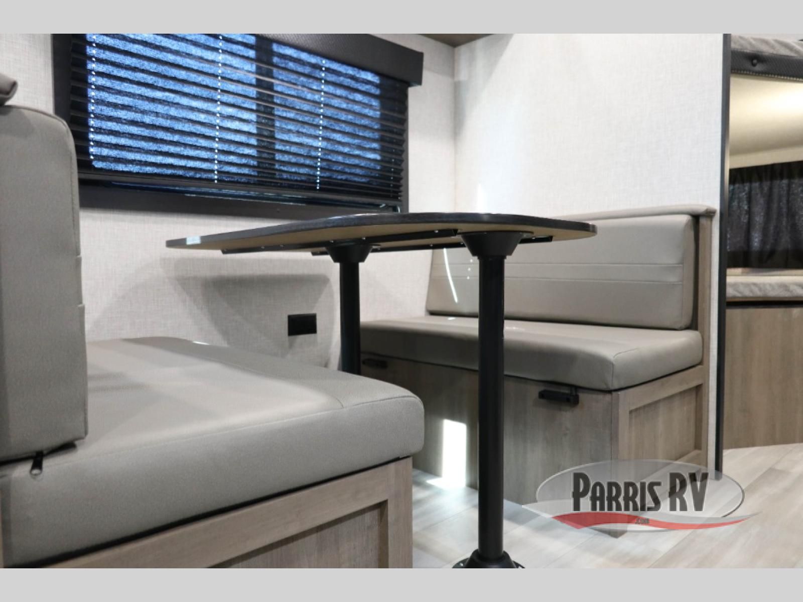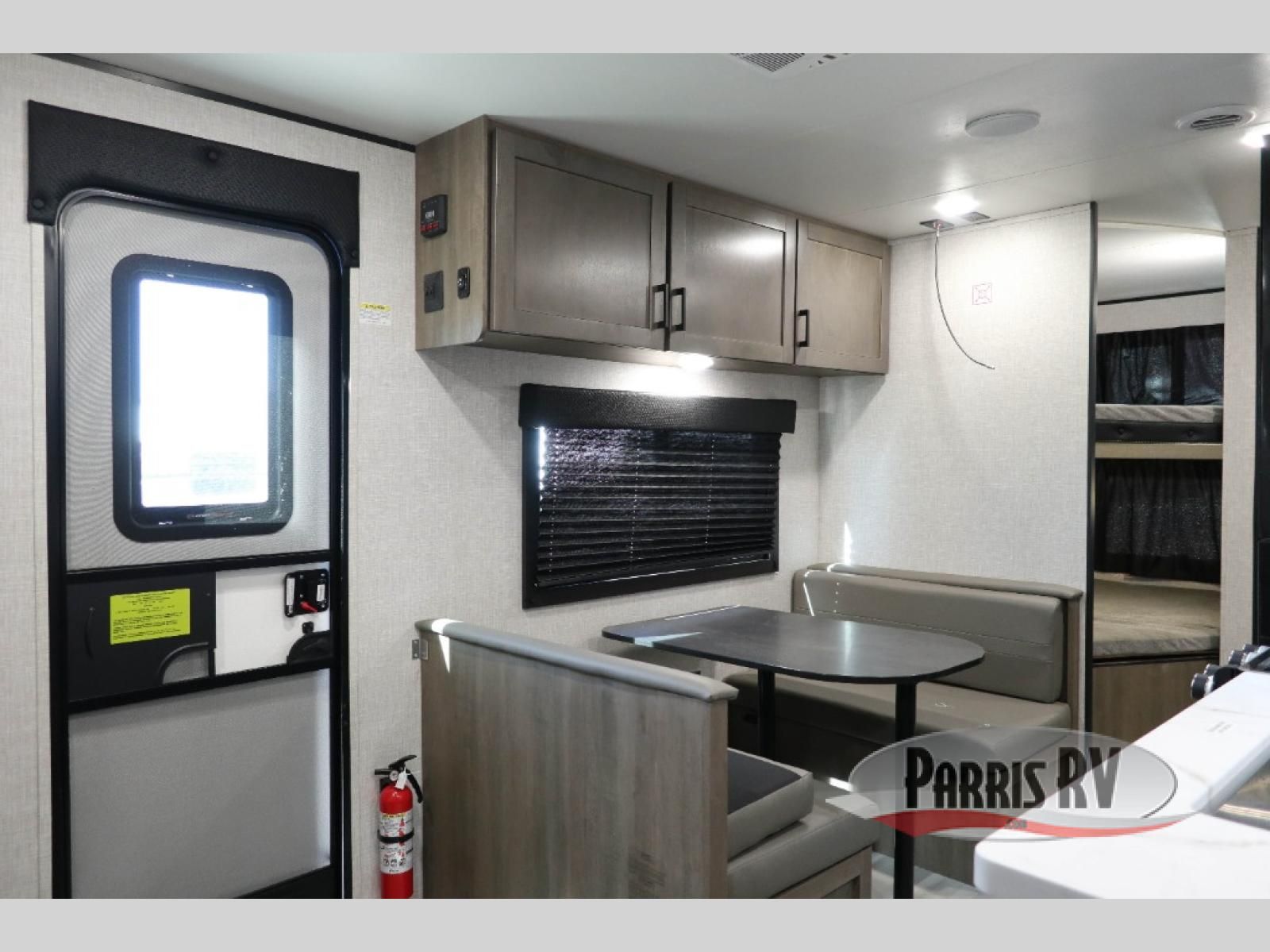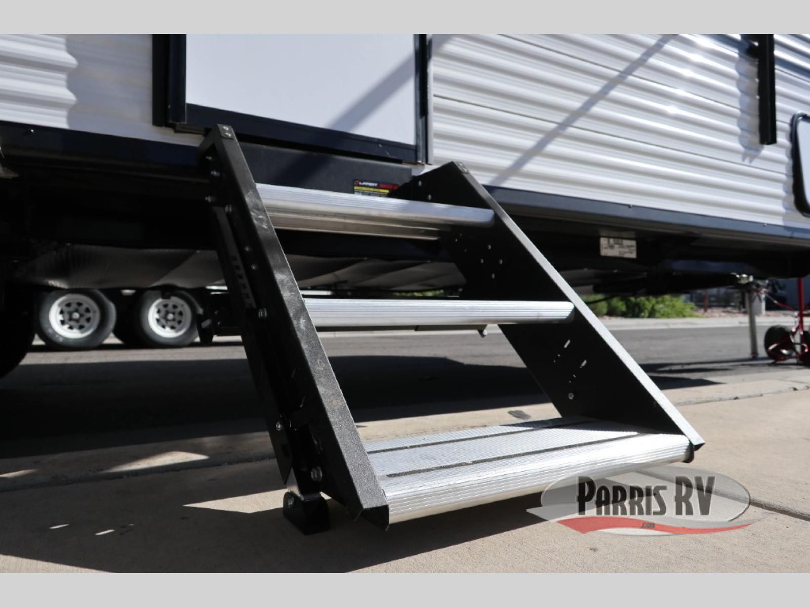 This dual-axle travel trailer can sleep eight people each night, so invite your family or friends along. You will enjoy the private bedroom up front with dual wardrobes to keep your clothes tidy. While the chef of your group is preparing lunch on the three burner cooktop, everyone else can visit on the jack-knife sofa or play a game at the booth dinette. You will also find a large 18' power awning with LED lights outdoors which is where you may usually find everyone. The private bath is right next to the double-size bunks for convenience, and the sink is just outside of this room so two people can freshen up at once.