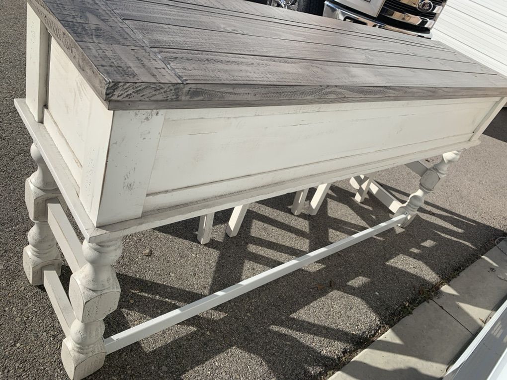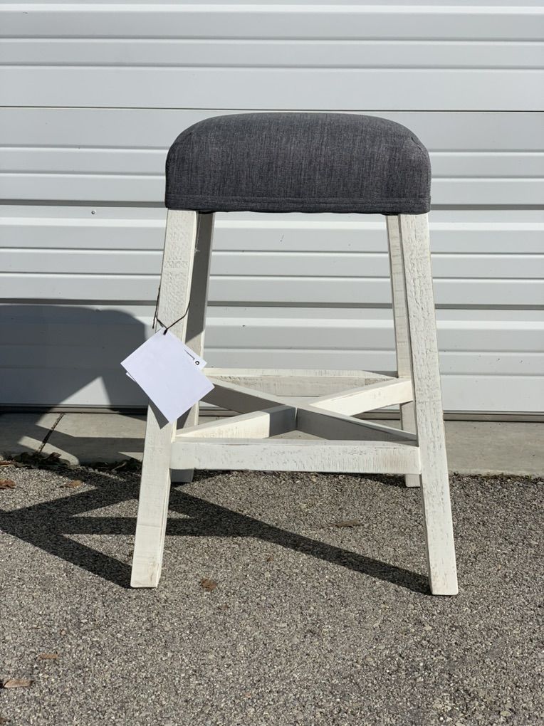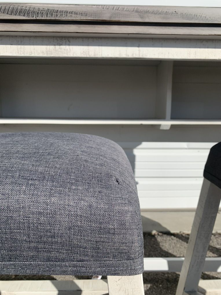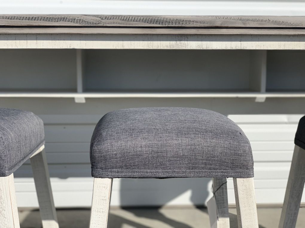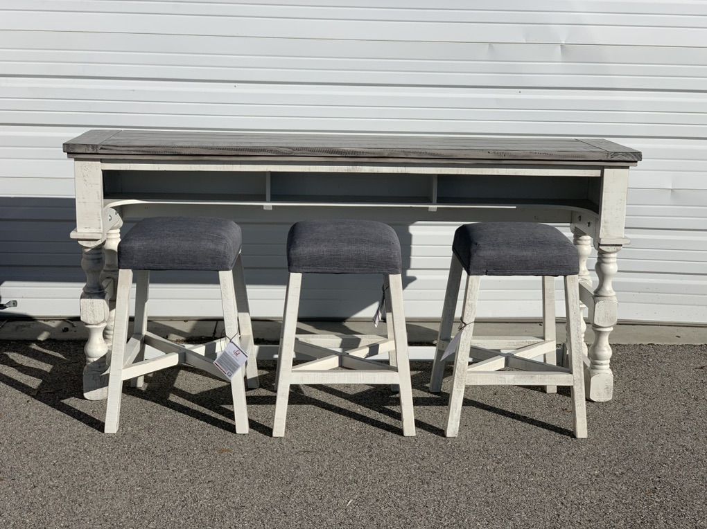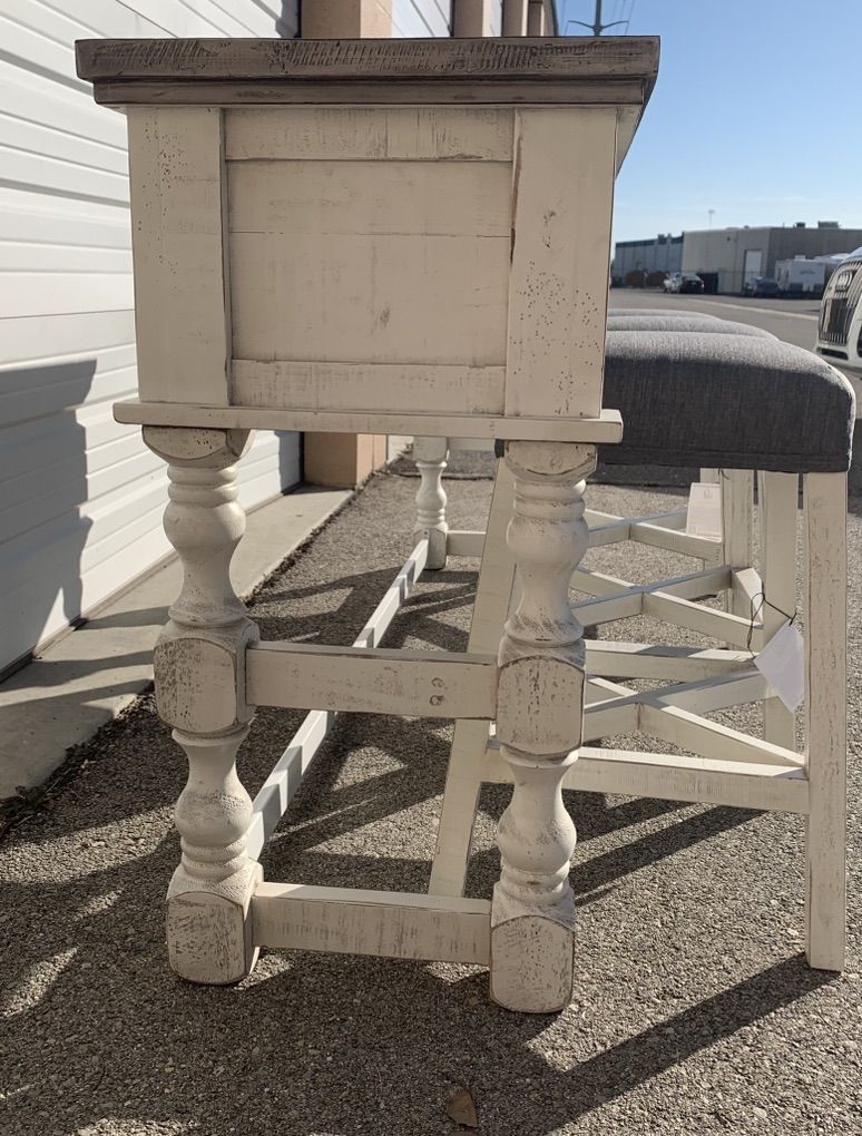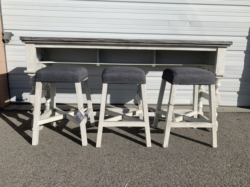 ApplePay• Special construction on top featuring 1/4” solid wood planks on engineered board to help prevent seasonal cracks and warping. • Six-step, hand applied ivory finish on body of console and warm gray on the top. • Mortise and tenon construction ensure stability and durability. • Fixed shelf all across for additional storage. • Matching stools with upholstered seat ship one per box, fully assembled. One sofa table with three stools. MEASUREMENTS: Sofa table: Counter Height Sofa/Console Table w/Shelf and Levelers Dim: 76 x 19 x 36-1/2 STOOL: 24 Stool w/fabric seat & Ivory Finish This is a great add to your space to create extra seating when needed. Leave out as is or put the stools away unless company comes over. Great place for kids homework. Set up a bar area for when watching games or tv events Dim: 18 x 18 x 26