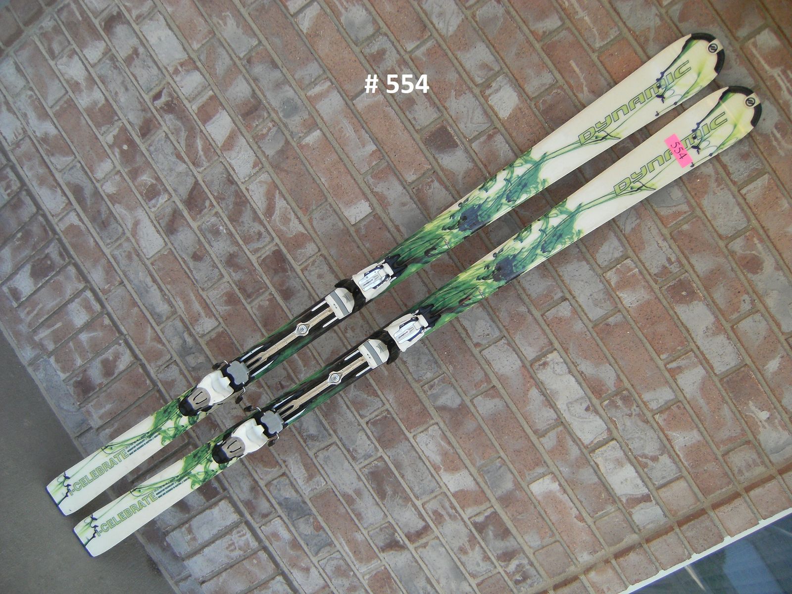 175CM (177), DYNAMIC, I-CELEBRATE, CRÈME / GREEN., TIP-WAIST-TAIL: 110-66-95, R=15M, W/ ATOMIC 310 4Ti BINDINGS DIN 3-10, FITS MOST BOOT SIZES, EXCELLENT CONDITION ITEM 554 $69