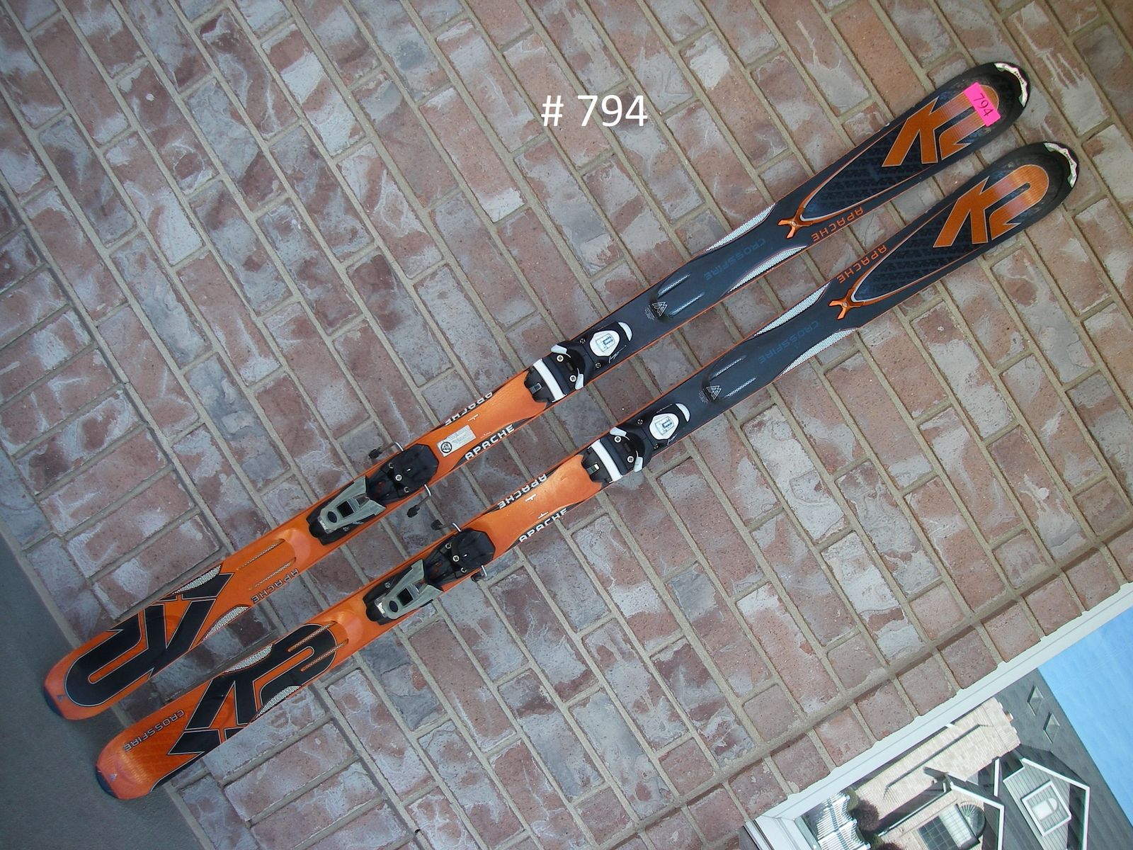 175CM (177), K2 APACHE CROSSFIRE, BLACK / ORANGE, TIP-WAIST-TAIL: 117-70-101, R=16 M, W/ ROSSIGNOL AXIUM 120 BINDINGS DIN 3.5-12, FITS BSL APRX 315-353MM, VERY GOOD CONDITION ITEM 794 $79