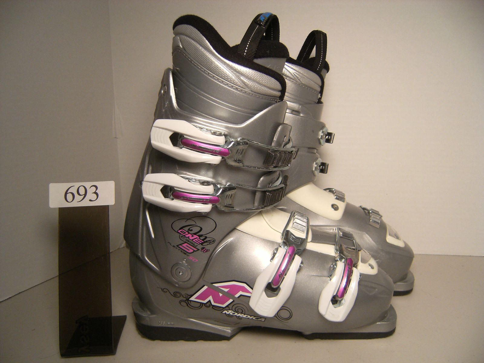 MONDO 23.5 WOMENS US SZ 6.5 NORDICA ONE EASY FIVE, FLEX 50 SILVER 285 MM BSL VERY GOOD CONDITION ITEM 693 $49