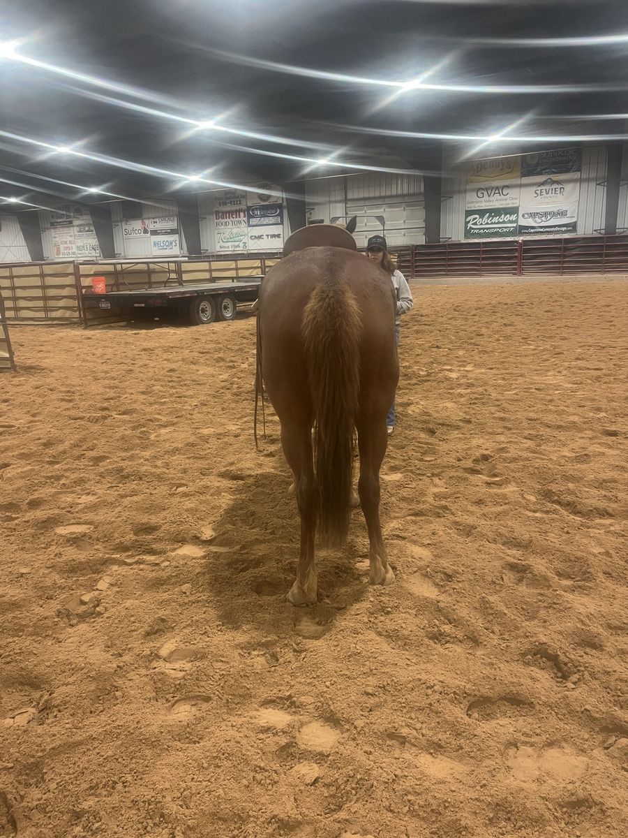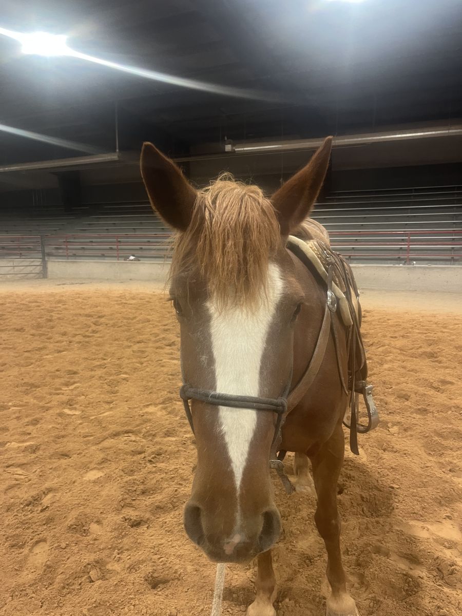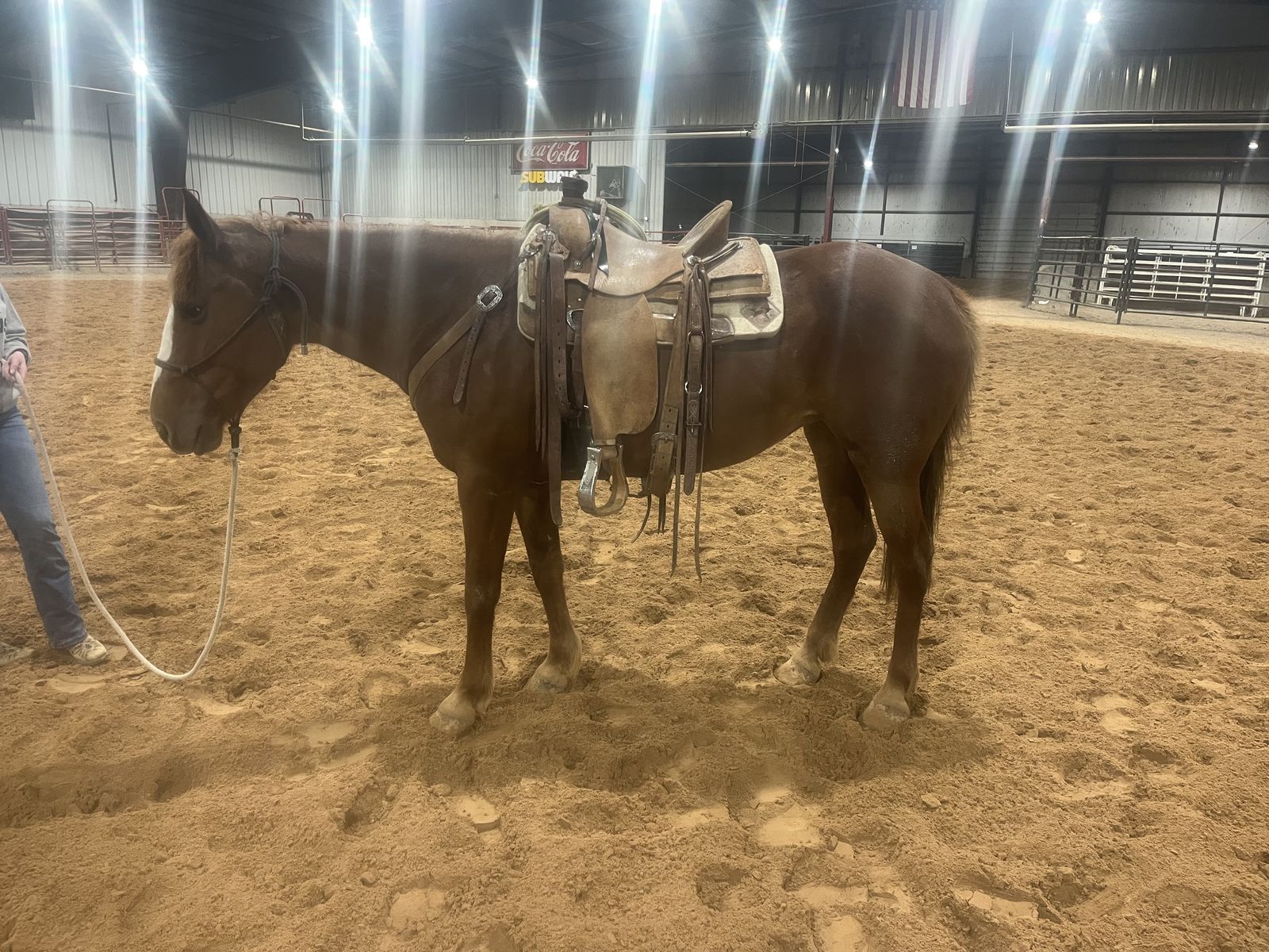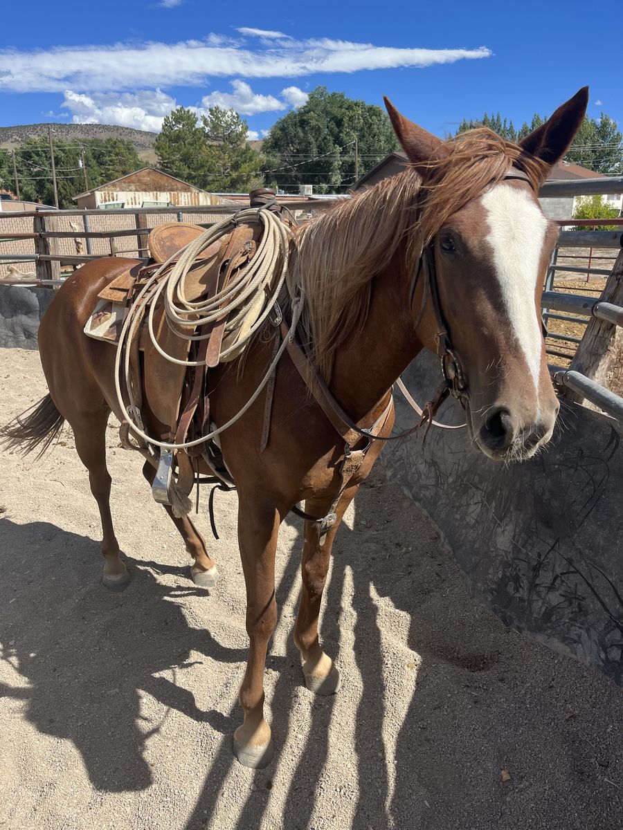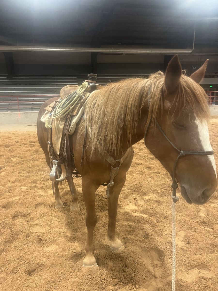 5 year old. Cute flaxy mane mare. Had 15 days on her when I got her a year and a half ago. I put a few more days on her and then had another guy put 30 days on her. I got her back and rode her for a 6 months or so and then she got put on the back burner with a kid showing up any day. With the kid being here any day she’s not going to get touched and she’s too good to stand around. My wife and her family adore this horse. She meets everyone at the gate and loves to get loved on. Stands for the farrier. She has bucked twice before but it wasn’t anything exciting. I’ve used her on the hills, feedyard, and sale barn pushing cattle around. Haven’t roped anything but have swung a rope. She’s been rode in an indoor arena with sleds being pulled around. She is a sweetheart and I hate to get rid of her but she’s too good to stand around. Text me with questions.