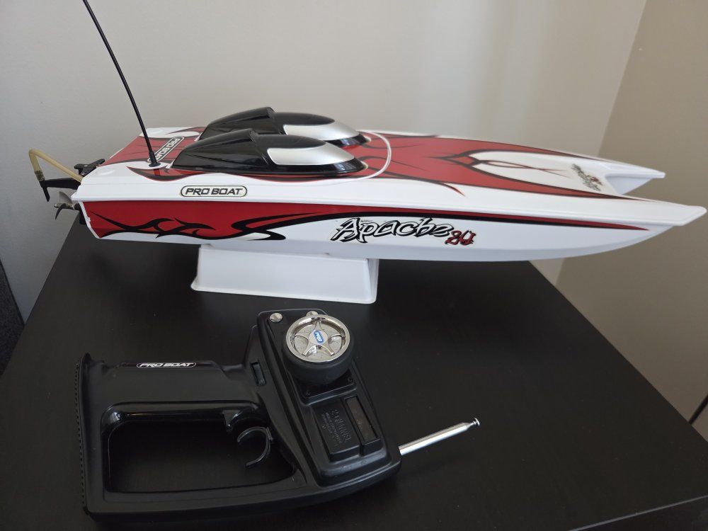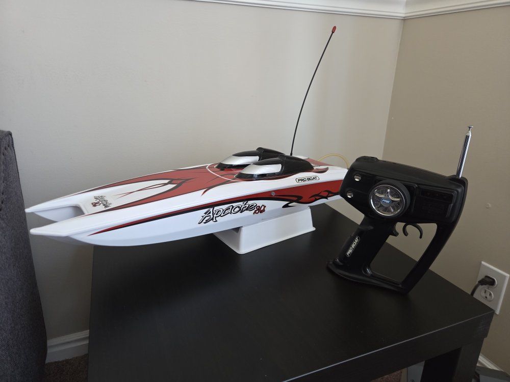 Proboat Apache 24 with brushless motor, 90 AMP ESC and metal prop. Comes with radio and stand. This is a fast fun boat