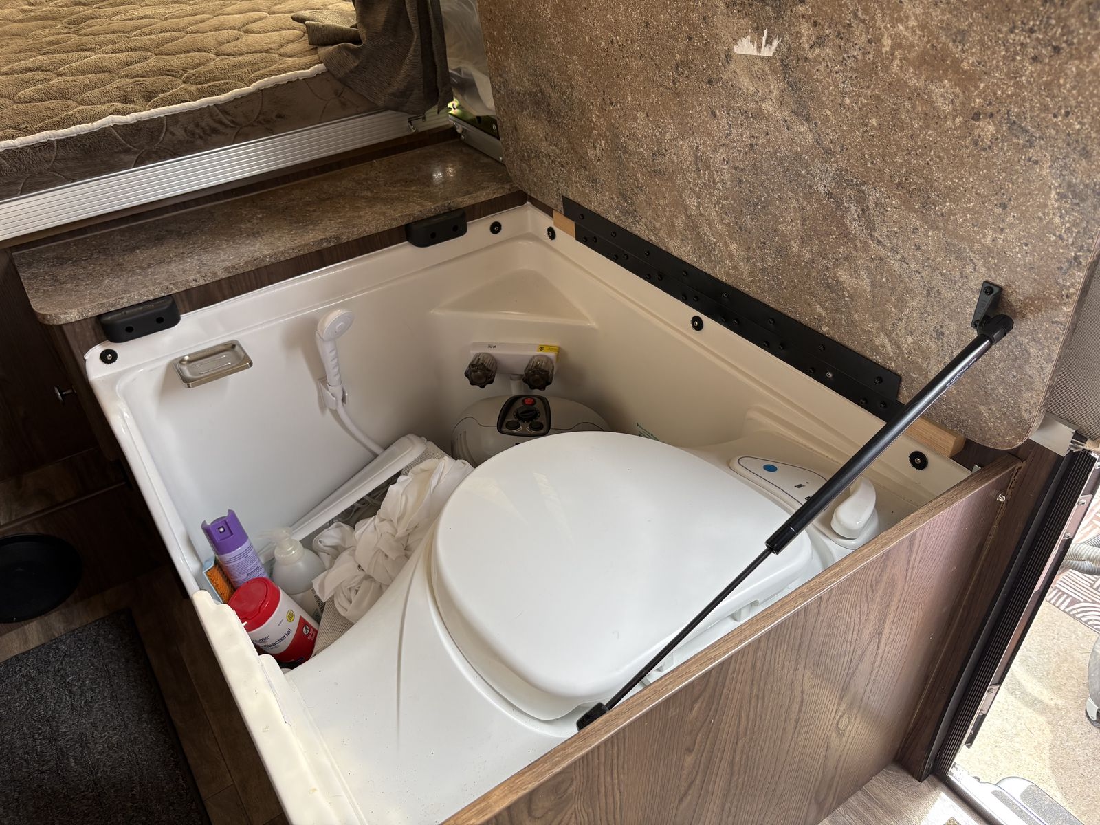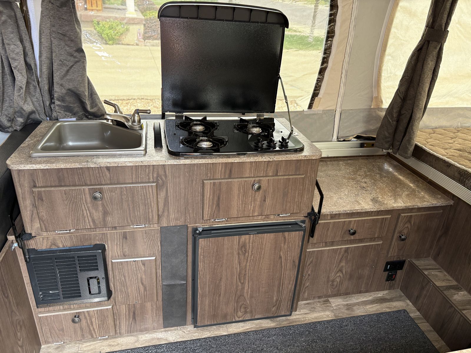 Seldom used beautiful pop up trailer in great condition. This has too many extras to mention them all. King bed on one side a queen bed on the other, two other convertible beds and can sleep 8 (six comfortably), cabinet area with shower and toilet, three burner stove, refrigerator, 26 gallon water tank, water heater, two propane tanks, solar panel, outdoor grill, LED lighting, awning, front deck storage, Bluetooth stereo. Other extras included: Storage cover, kayak racks, wheel chocks, power cord for electrical connection, solar charge controller and more. This is the ESP package with high ground clearance and offroad tires for those who like to get off the main roads.
