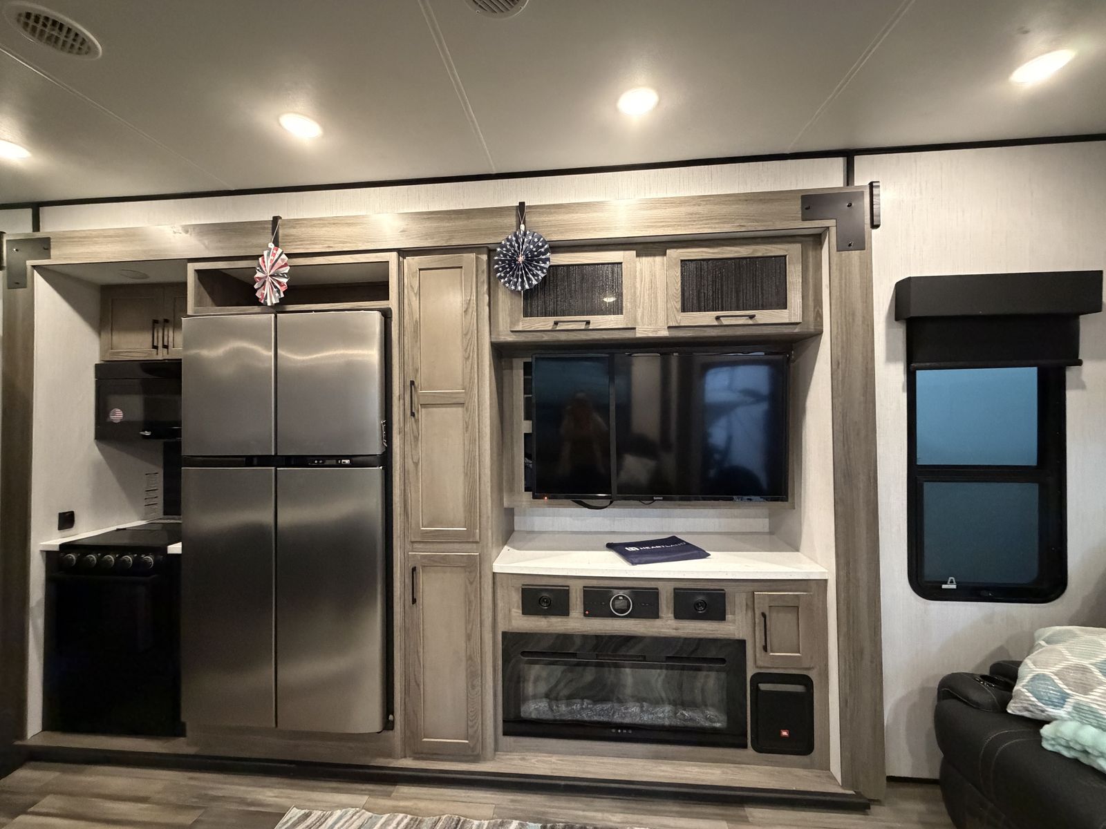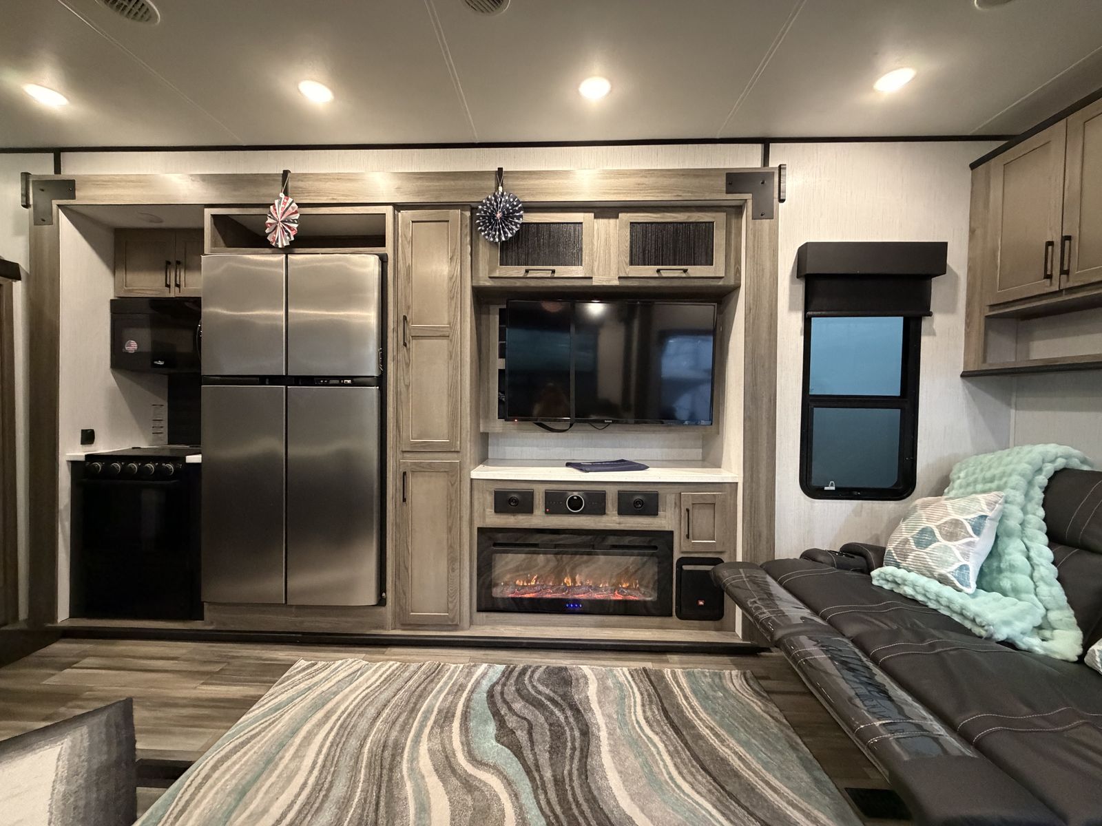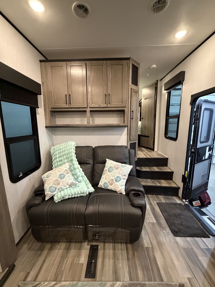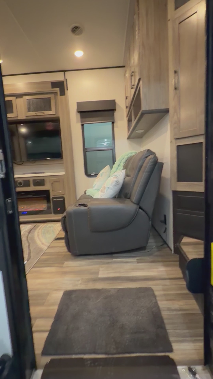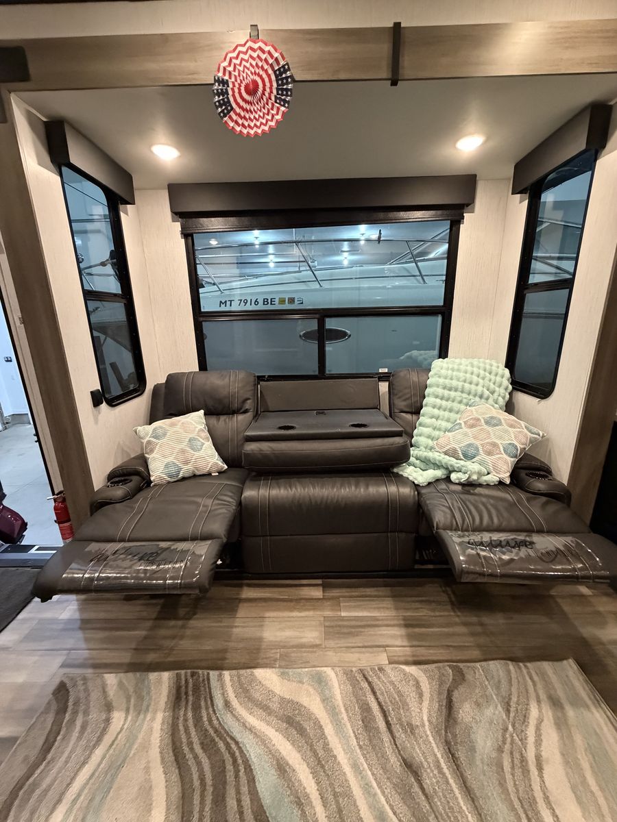 Living Area: Features a large slide-out with a large reclining sofa w/charging station, an additional reclining sofa we/charging station cup holders. An opposing kitchen slide, and a loft area above the kitchen/garage hallway for addition sleeping or storage. Large TV, amazing sound/speaker system for inside and out! Cozy fire place. Large floor space.