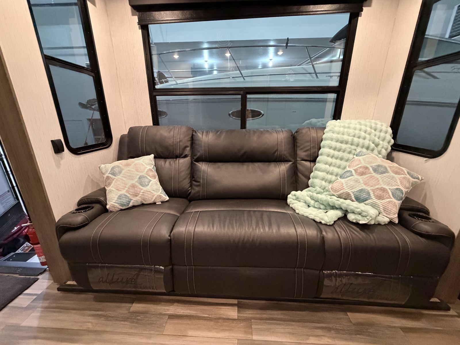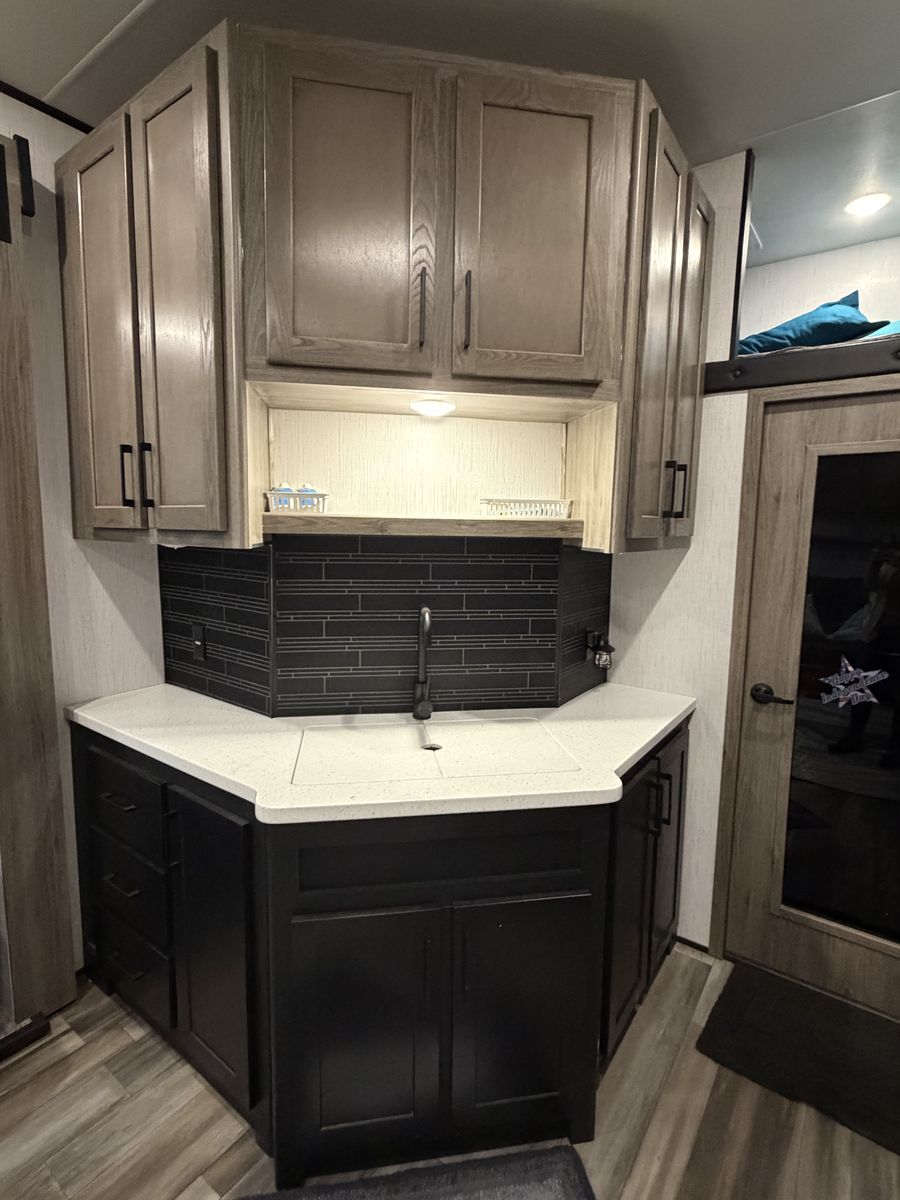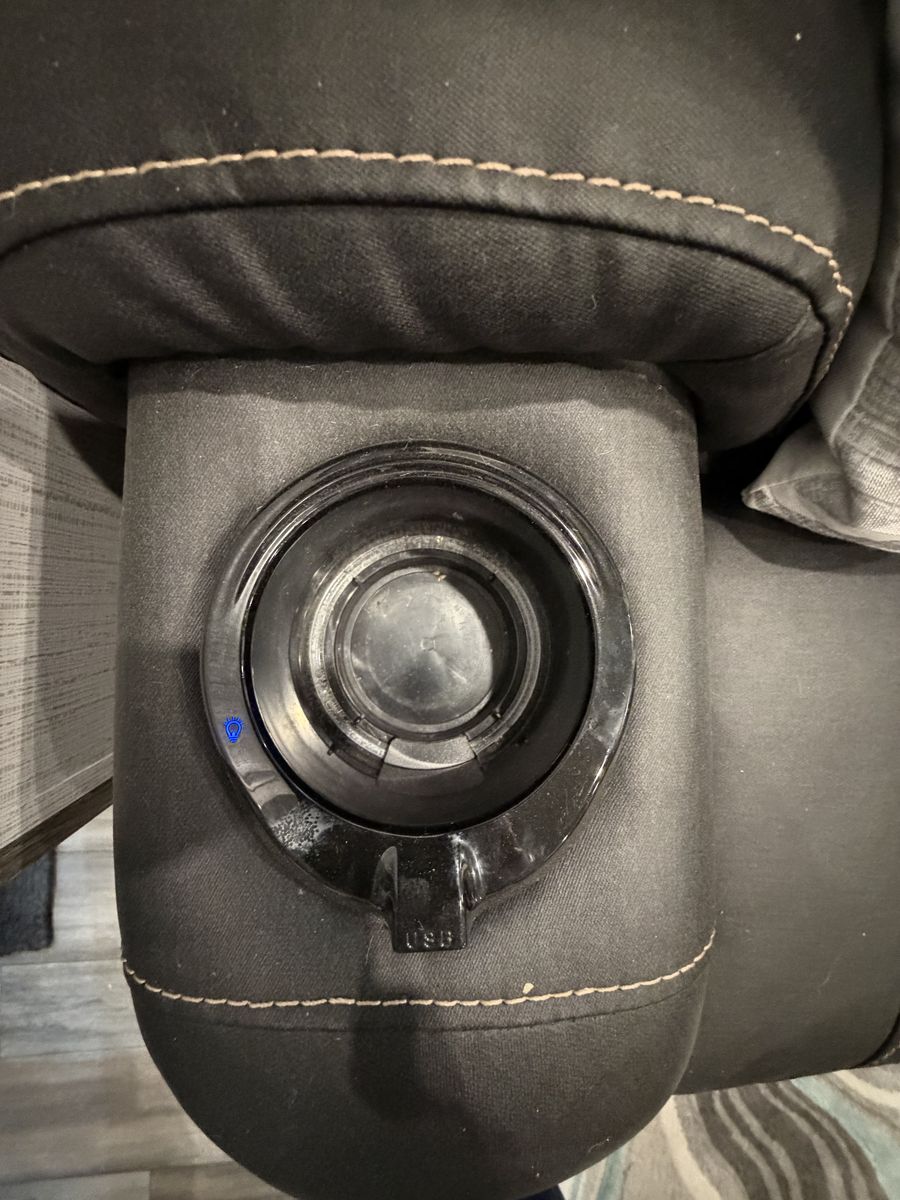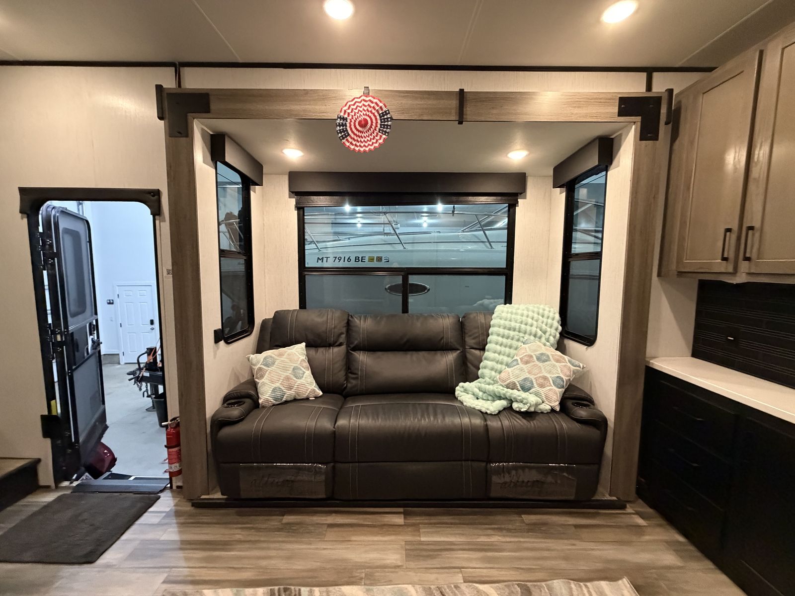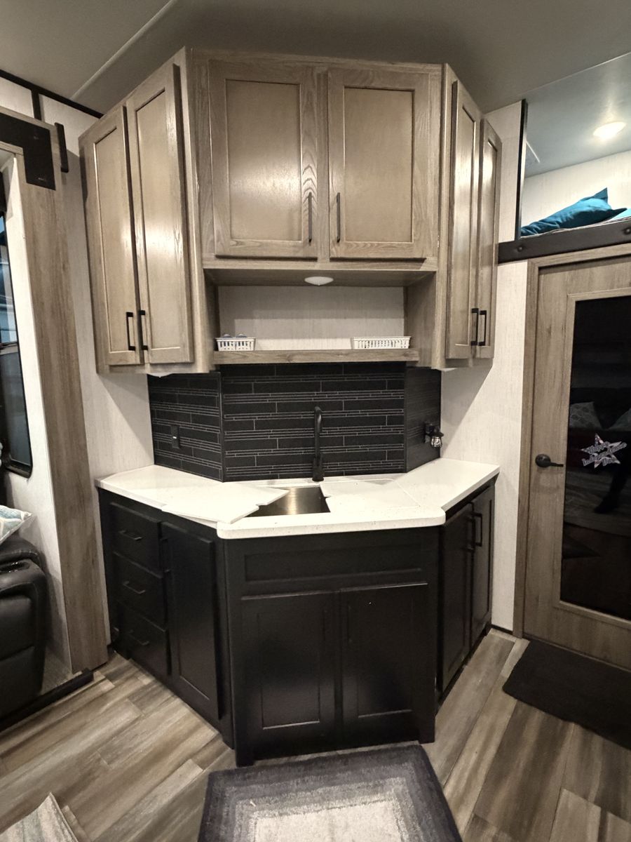 Living Area: Features a large slide-out with a large reclining sofa w/charging station, an additional reclining sofa we/charging station cup holders. An opposing kitchen slide, and a loft area above the kitchen/garage hallway for addition sleeping or storage. Large TV, amazing sound/speaker system for inside and out! Cozy fire place. Large floor space.