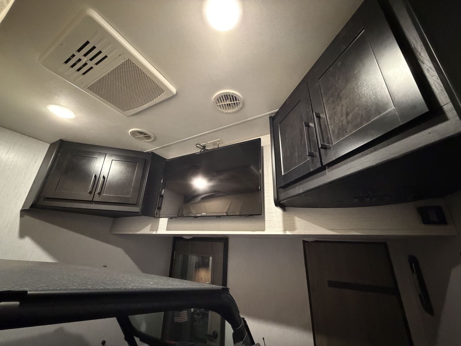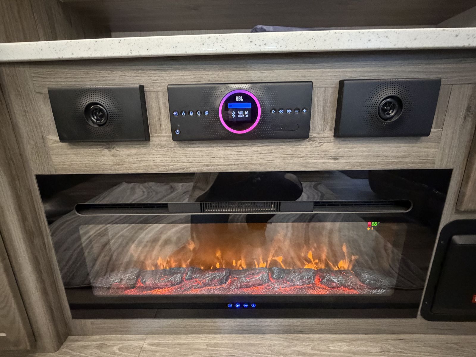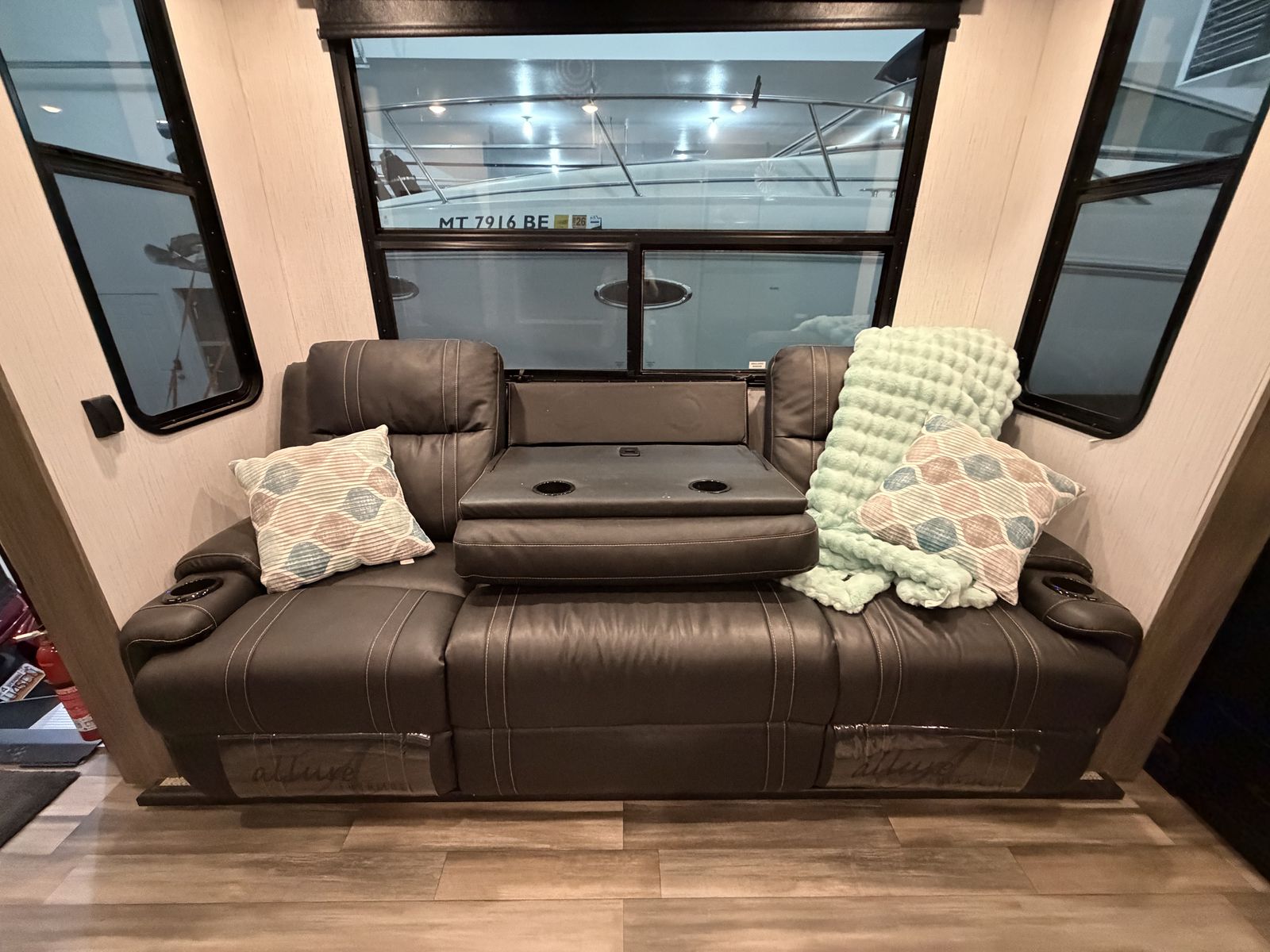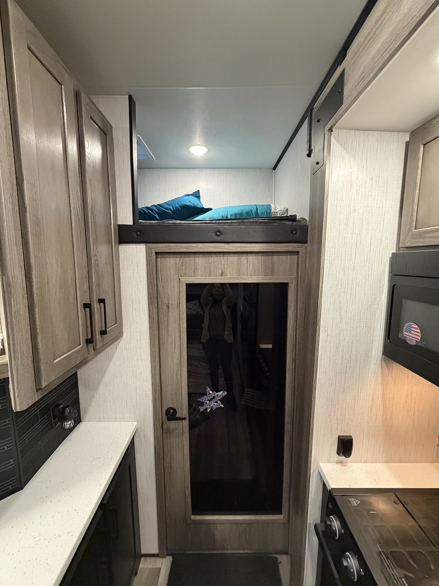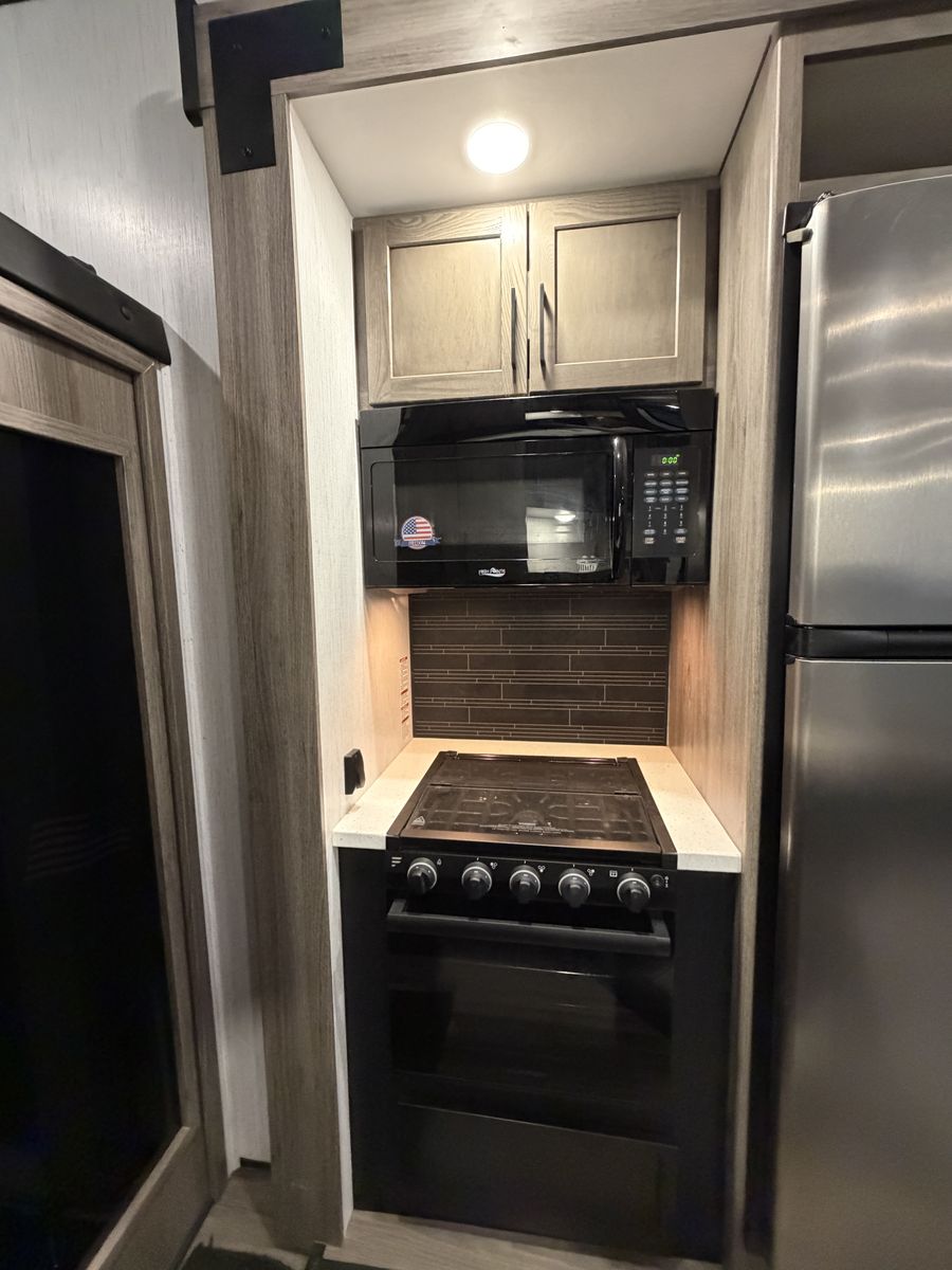 Living Area: Features a large slide-out with a large reclining sofa w/charging station, an additional reclining sofa we/charging station cup holders. An opposing kitchen slide, and a loft area above the kitchen/garage hallway for addition sleeping or storage. Large TV, amazing sound/speaker system for inside and out! Cozy fire place. Large floor space.