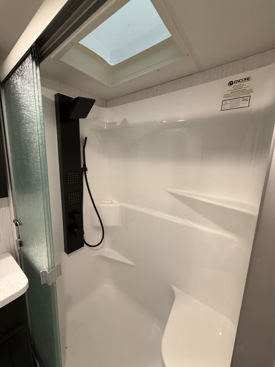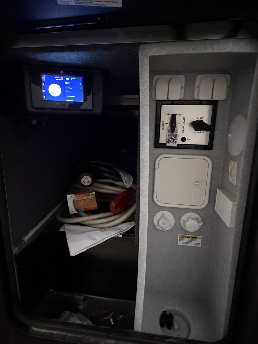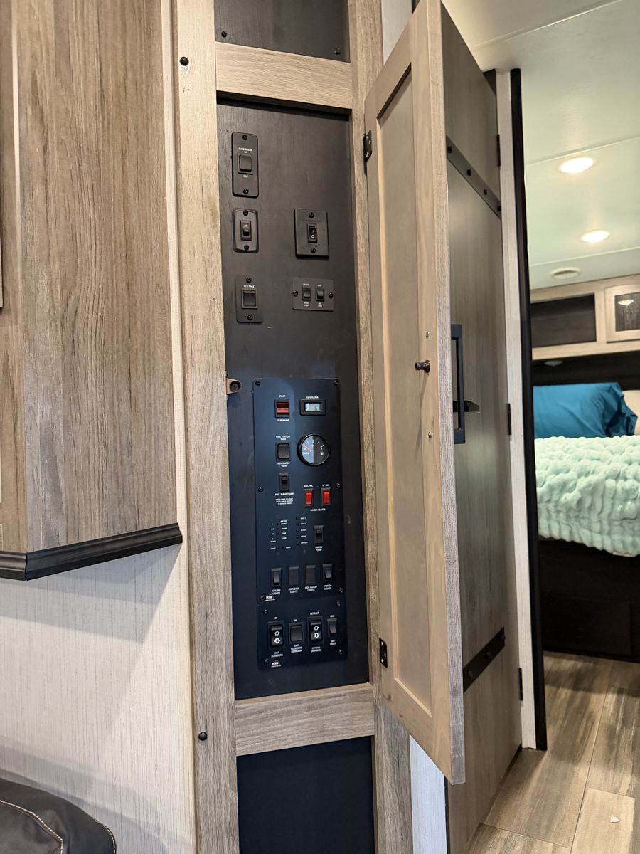 Exterior: Includes a 30-gallon fuel station, a 6-point hydraulic auto-leveling system, and a ramp door that converts into a patio. LED exterior lighting and plenty of awnings. Onan generator, original solar power, etc.