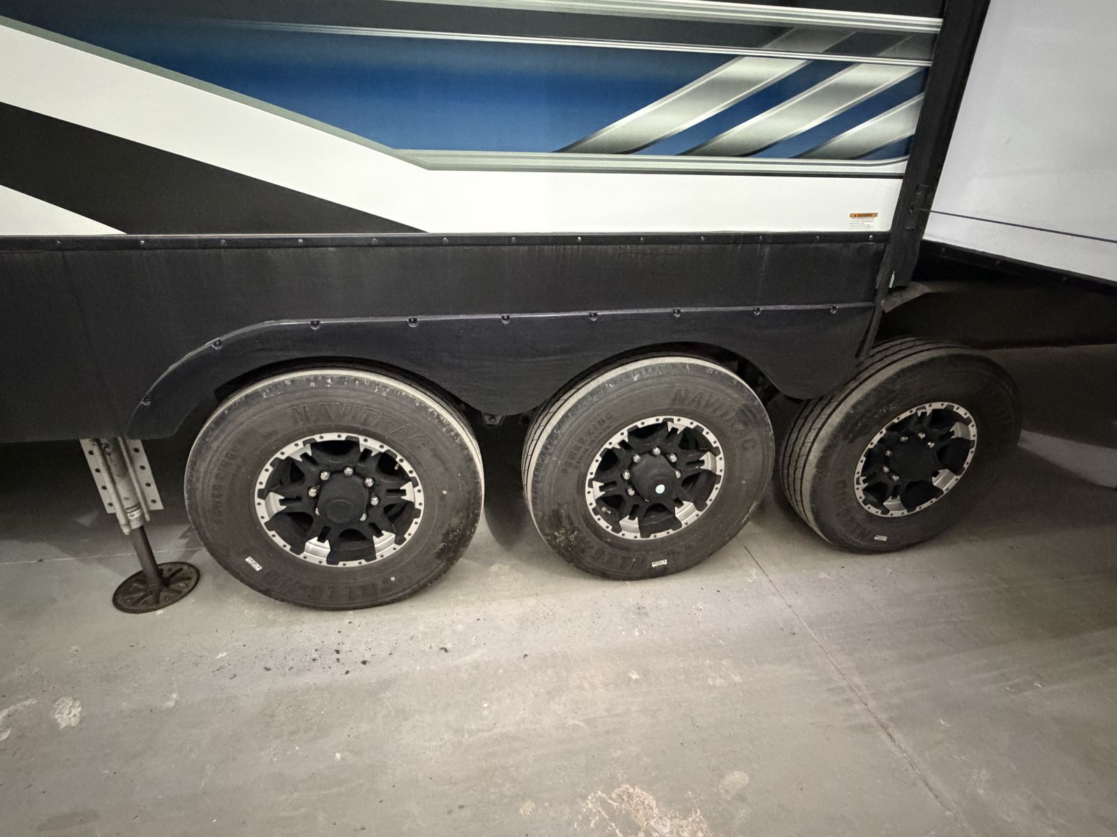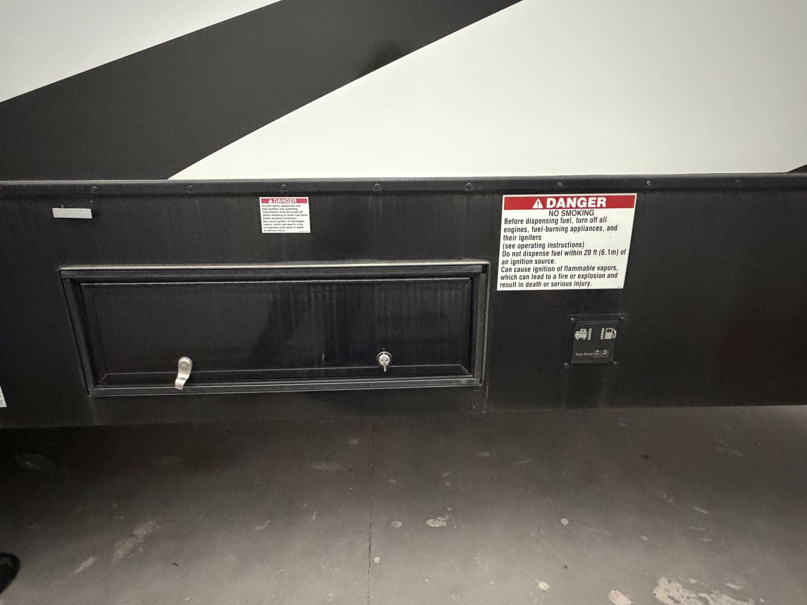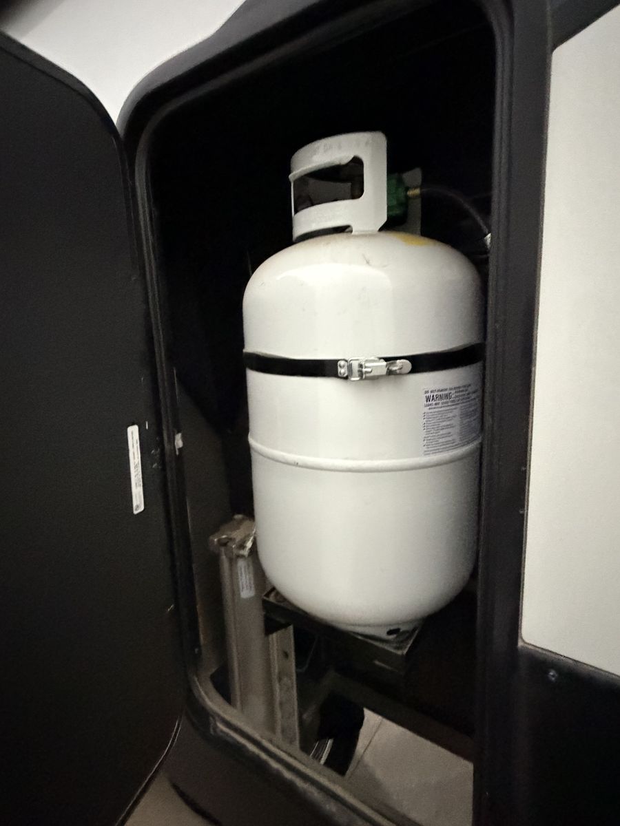 Exterior: Includes a 30-gallon fuel station, a 6-point hydraulic auto-leveling system, and a ramp door that converts into a patio. LED exterior lighting and plenty of awnings. Onan generator, original solar power, etc.