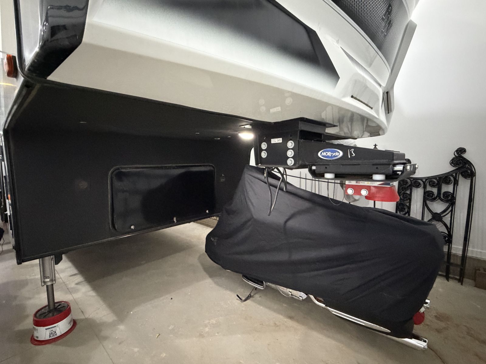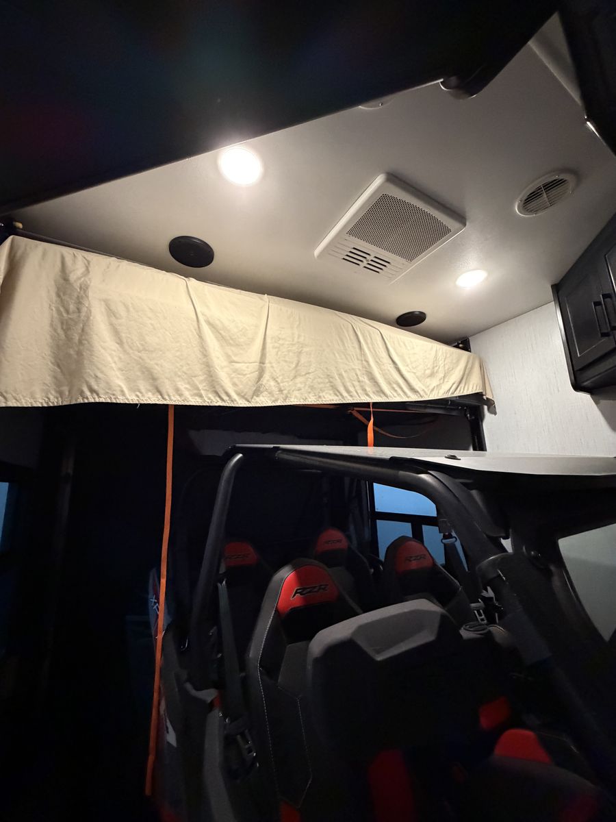 Garage: 13-foot garage with tie-downs, a half-bath, an electric queen bed and a split bench/seats that convert to an additional bed. Washer/Dryer hookups, TV, back opens up for patio seating w/awning coverage.