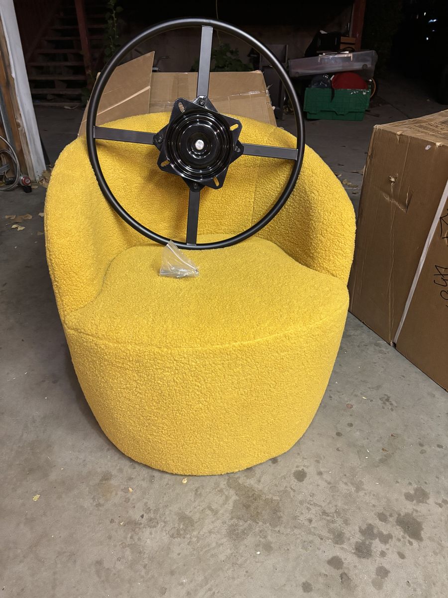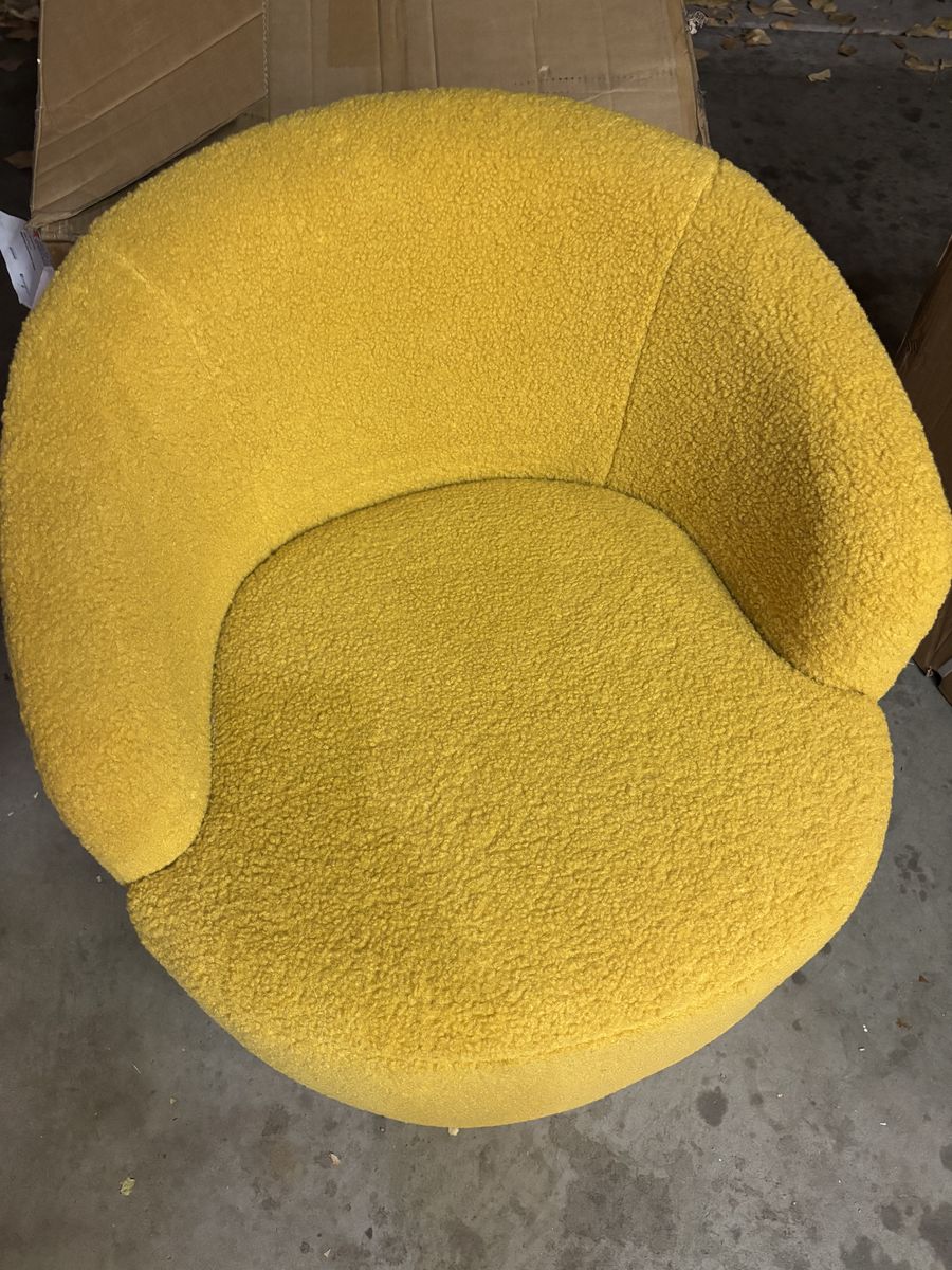 ZelleSwivel barrel-style accent chair upholstered in yellow plush fabric.