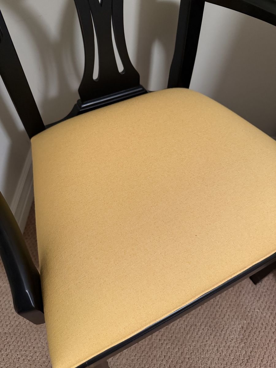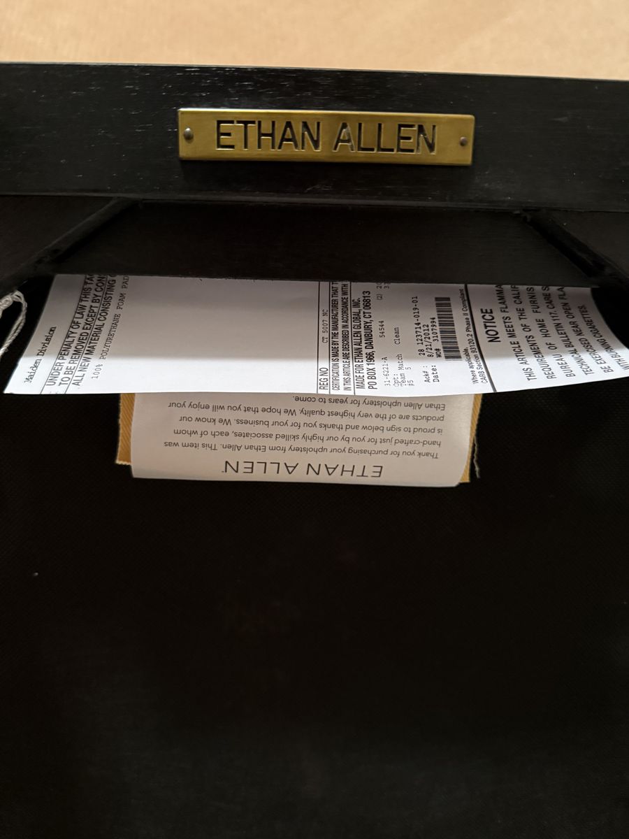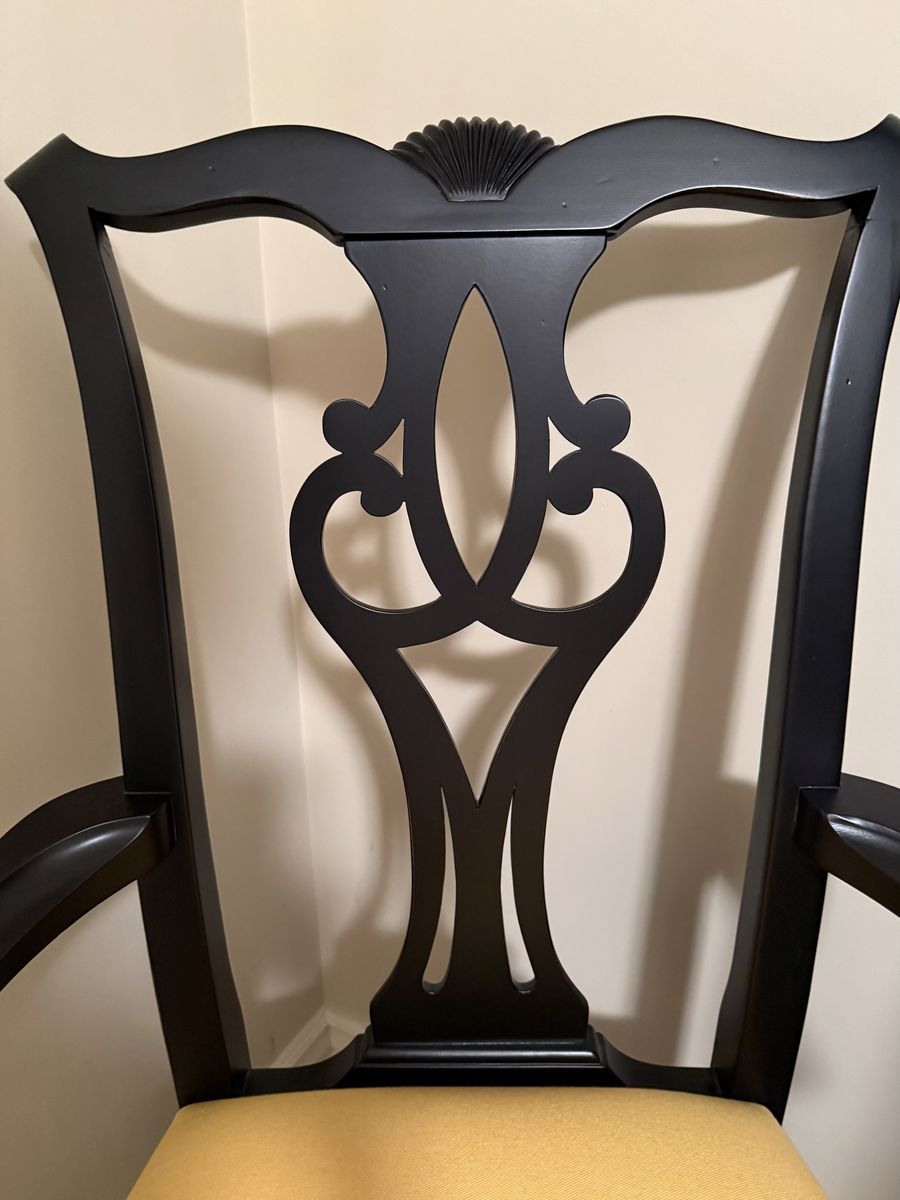 VenmoThis is a classic Ethan Allen accent arm chair with a dark espresso (blank satin) finish over hardwood. The chair has its original upholstery in lemon yellow. Just a little darling and so fun! I literally never ended up using it and it has sat in a spare bedroom since 2012. When you see it you will agree it looks like it just came out of the box. The arms are scrolled with square legs and stretcher, the back is a Hepplewhite / Federal-style splat or lyre back. This chair came from Ethan Allen’s more formal collection not their budget line. So here’s your chance to get a “like” new, stunning little accent chair at very discounted price (paid over a $1000 for it). Act quickly this one will go fast.