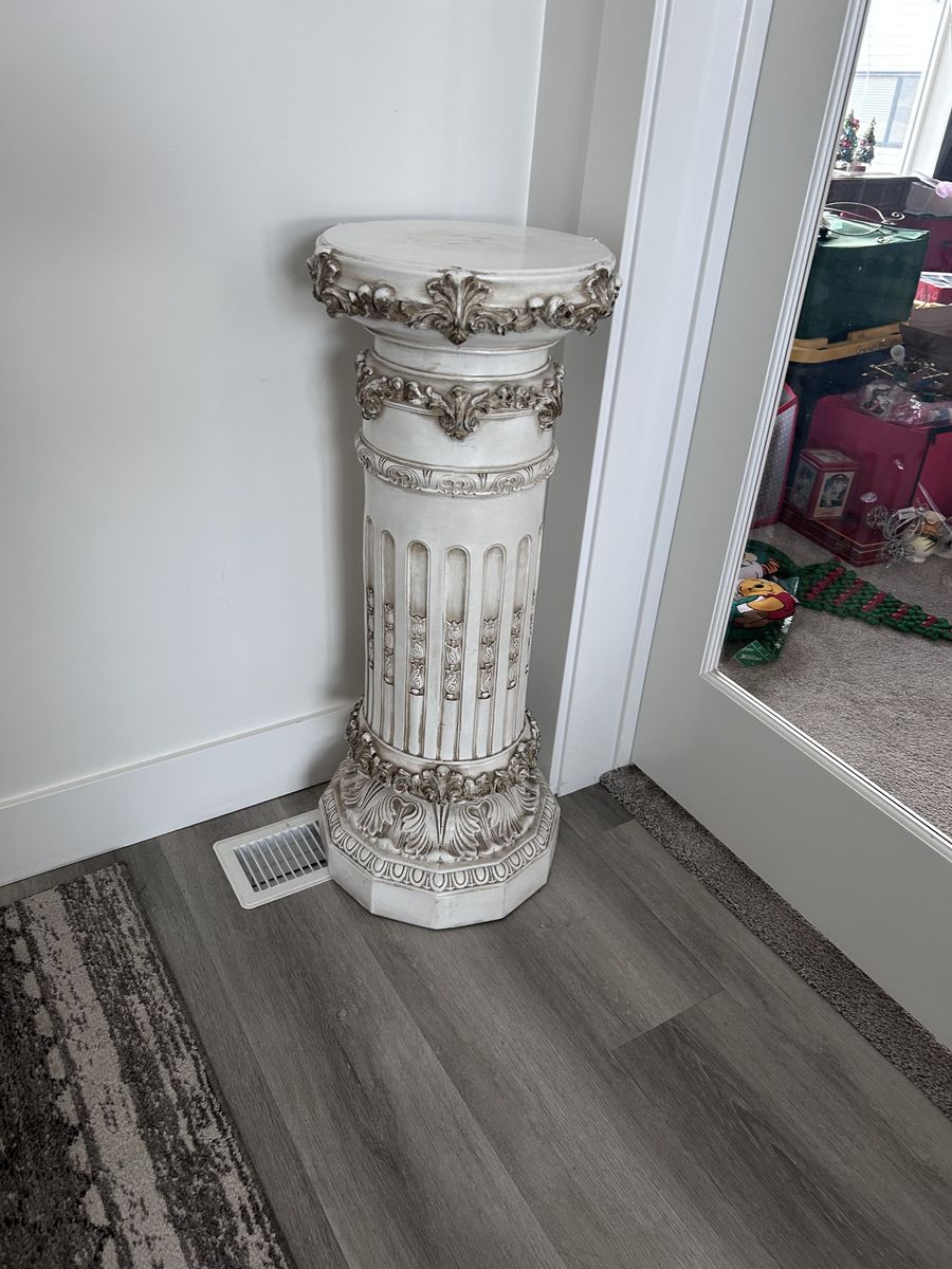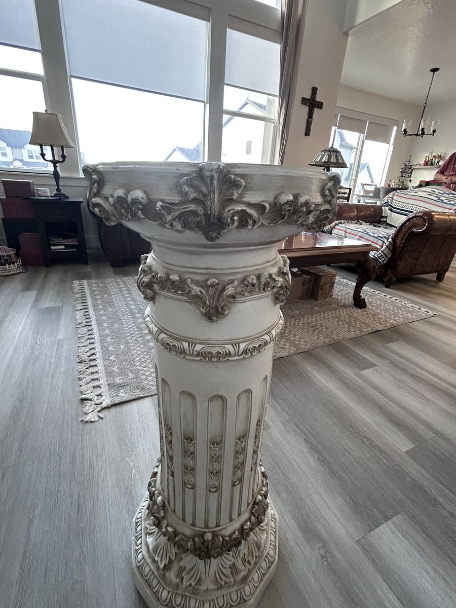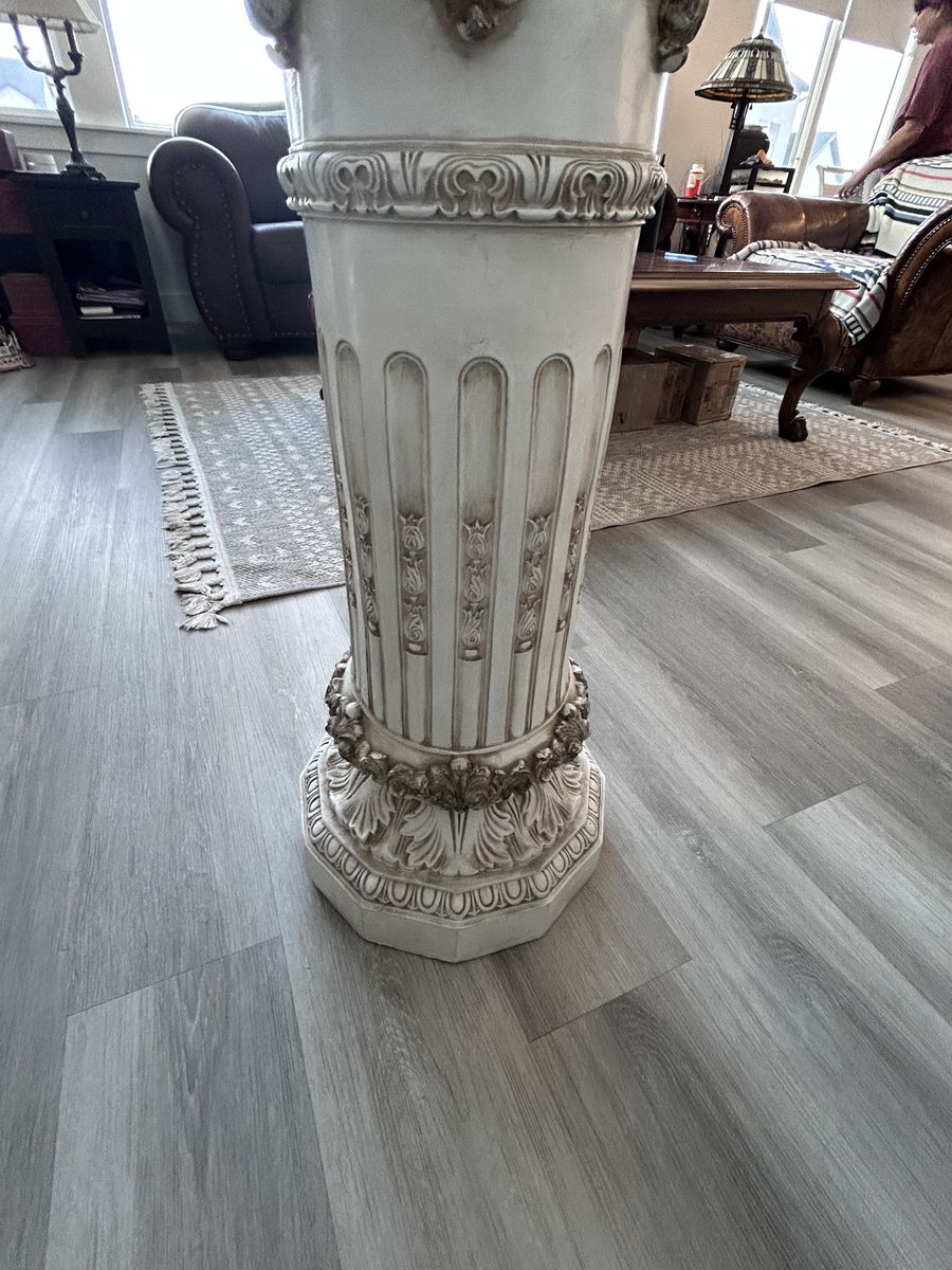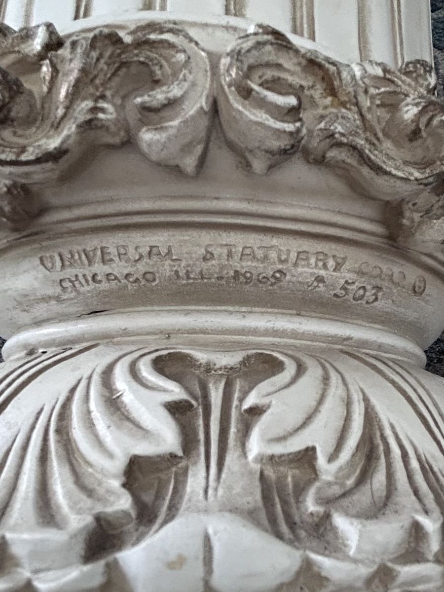 PayPalUniversal Statuary Corp. pedestal, a decorative piece likely made of a durable resin compound or chalkware. These pieces were popular in the 1960s and 70s for their ornate, neoclassical designs, often finished in antiqued ivory and gold. This Pedestal was made in 1969 by Universal Statuary Co in Chicago Illinois. See photos for more details. In very good condition. Very heavy piece. 32” tall 13” base