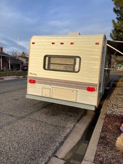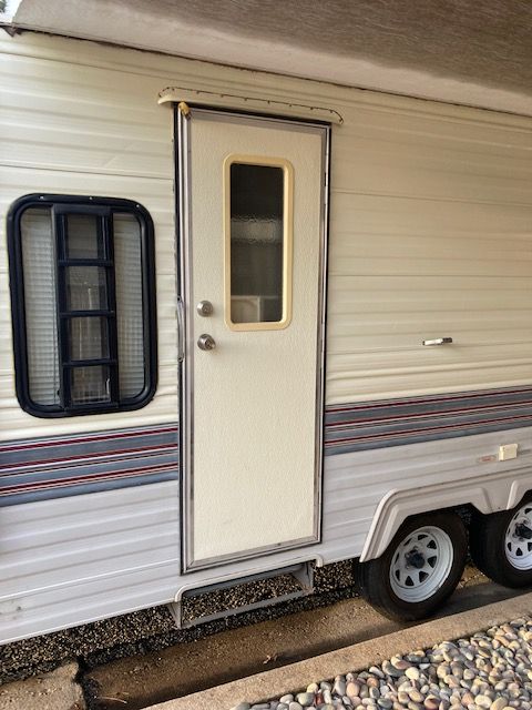1992 Kit Monterey 27PT travel trailer. Clean and good condition (second owners). Two entry doors, rear queen bed, table and couch beds, shower, bathroom toilet and sink, A/C, furnice, micorwave, 4 burner stove, oven, frig/freezer, dual kitchen sink. New water heater, lots of storage, no water damage. New power awning, dual propane tanks, dual 12 volt batteries, good tires, trailer equalizer hitch, Easy pull with half ton truck, no problem. Title in hand. Thanks for looking