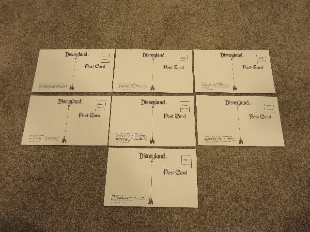 As the pictures show, I am selling; as a single lot of 7 for a single price; a lot of seven vintage Disneyland Postcards that were bought on the Main St. Shop in 1983.