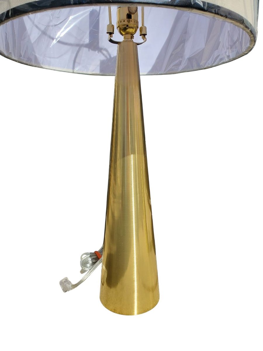 new Thomasville linen drum shades that are a cream with navy blue trim. the plastic is still on these to ensure the light linen remains protected