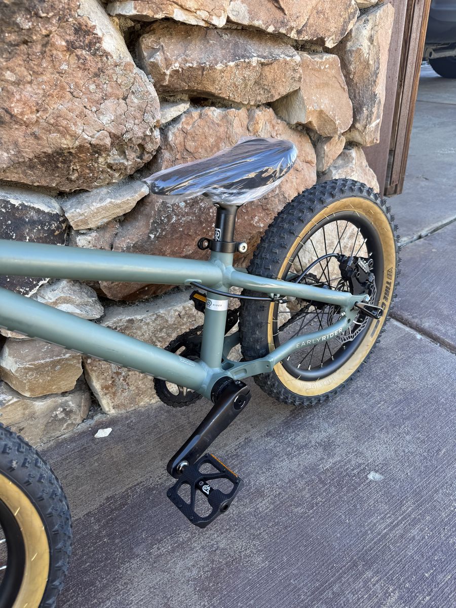16" Early Rider Hellion kids bike. Green & Black. Purchased in May 2025 for $900 before tax/shipping. One of the lightest serious kids bikes on the market. Hydraulic discs/thru-axel.