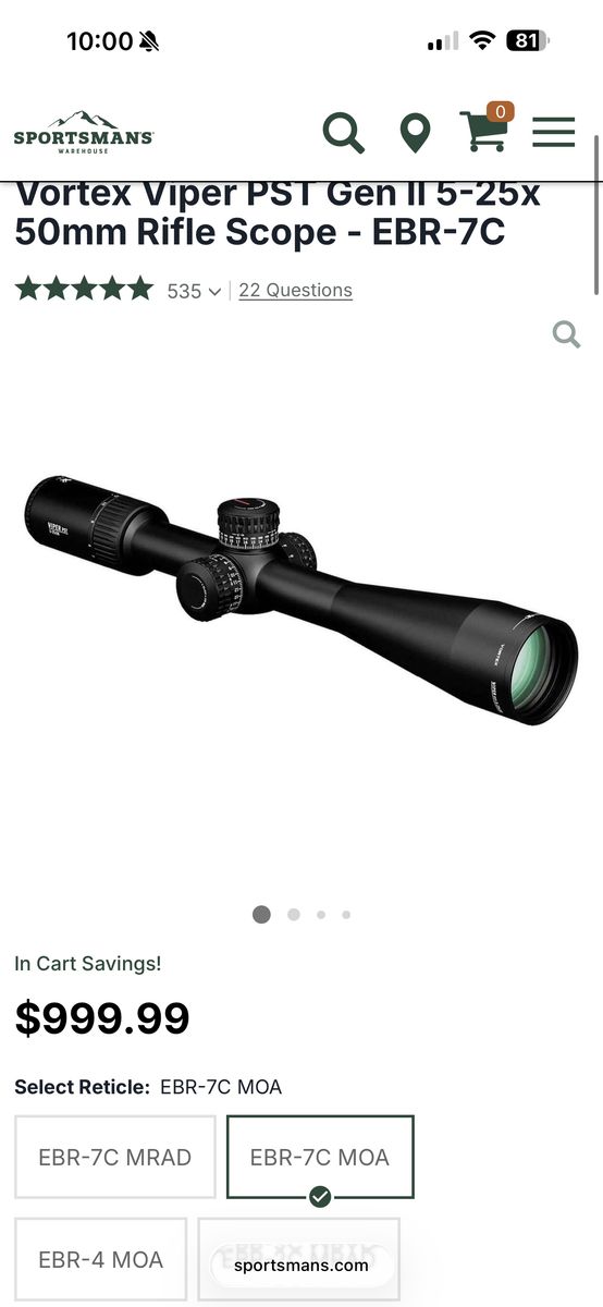 VenmoBrand new Viper PST Gen 2 5-25 x 50 FFP MOA. I bought a razor to replace it and never used this one. Asking $750.