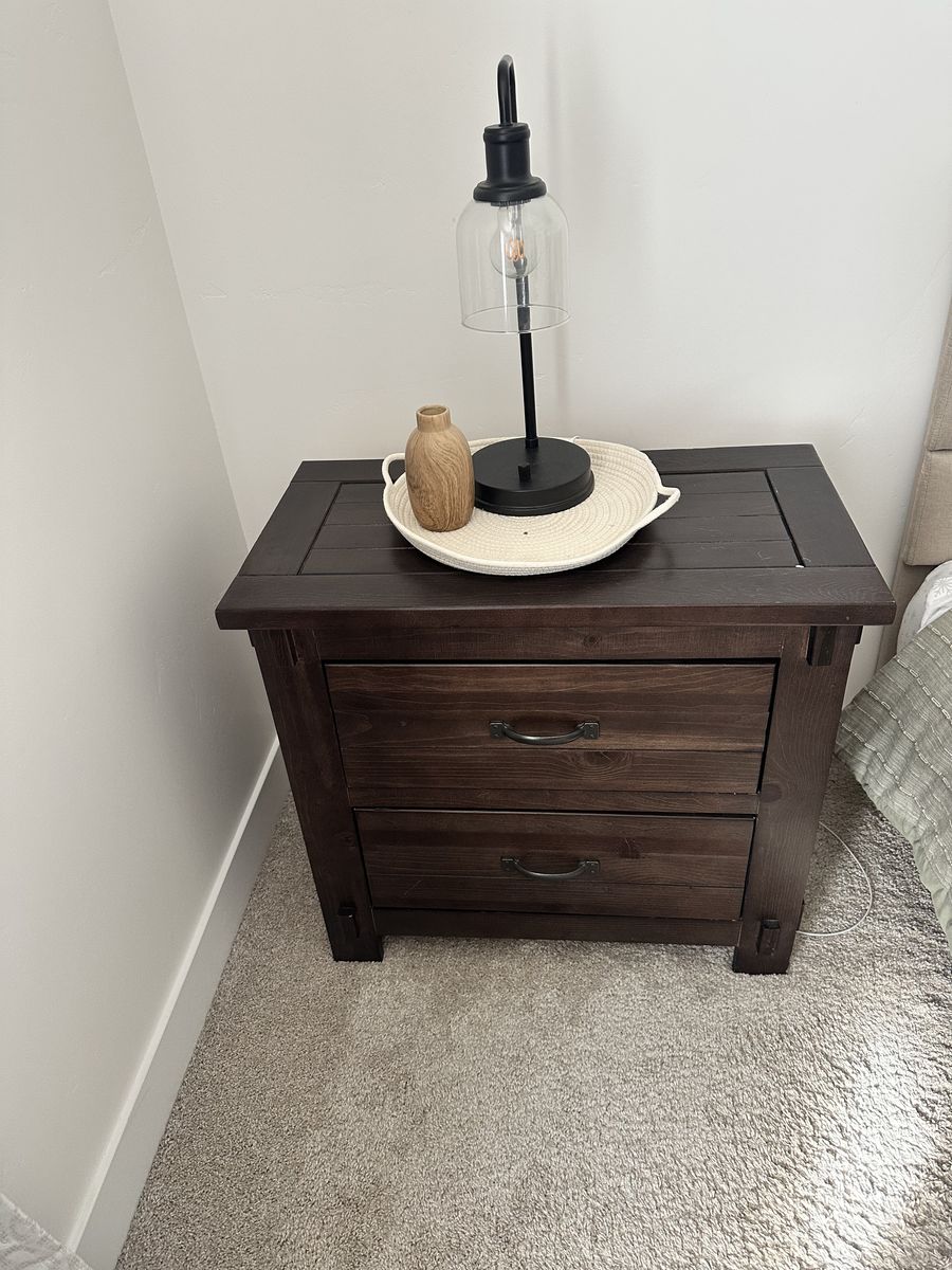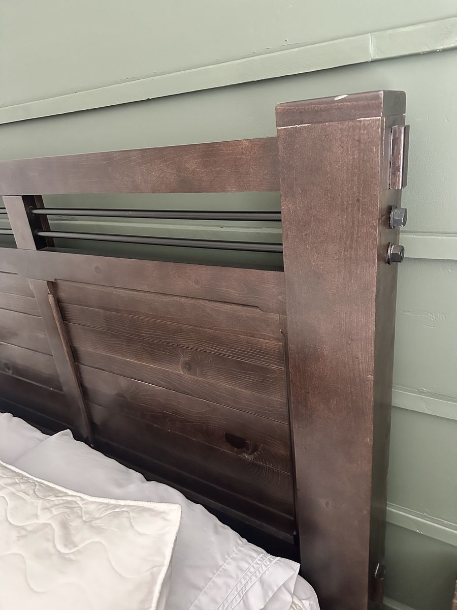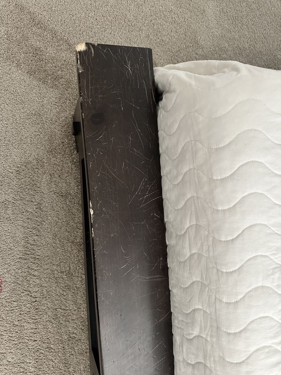 PayPalQueenside wood bed set with a long dresser and 2 night stands. Bed has iron rods in headboard. The foot board does have some damage, as shown in photo. The rest of the set is in gently used condition. This is a beautiful set, I am sad to see it go.