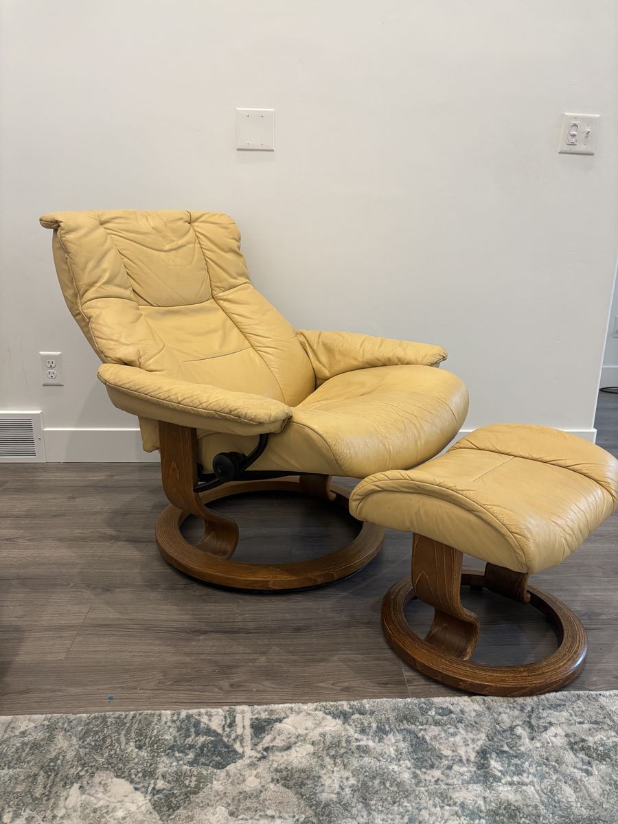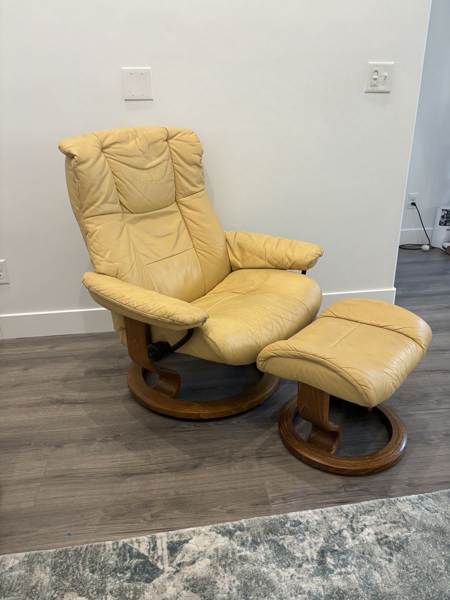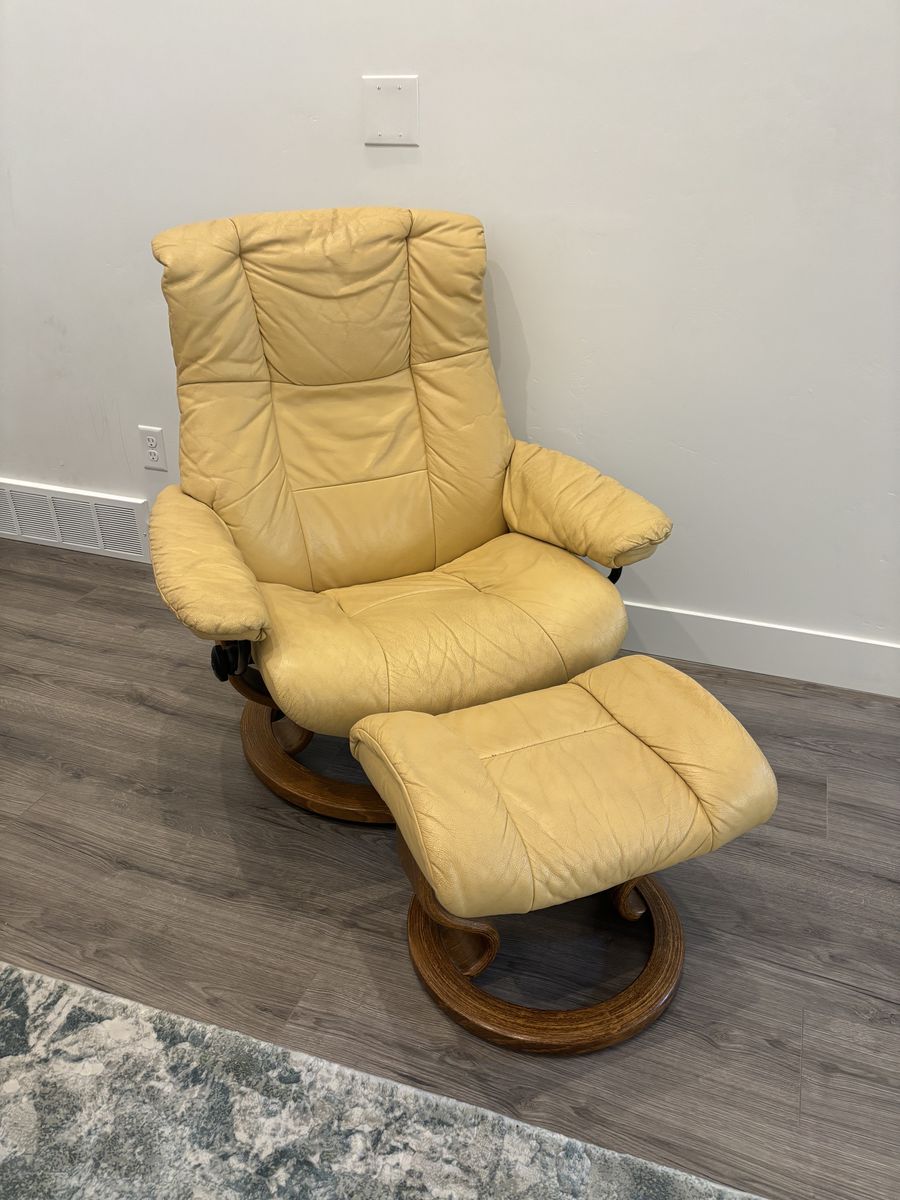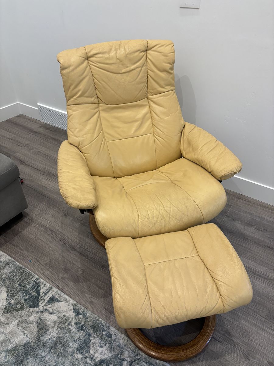 ApplePayJust needs a good leather cleaning. It’s in very good condition other than that. The Stressless® Mayfair Large Recliner and Ottoman combine style and comfort for a large personalized fit that easily adjusts to provide maximum comfort with the Glide system following your body’s slightest movements. Featuring a two-stem base made from European Beech available in a variety of finishes, while providing maximum mobility with a swivel action that lets your easily turn 360 degrees, along with pillow arms providing perfect support.
