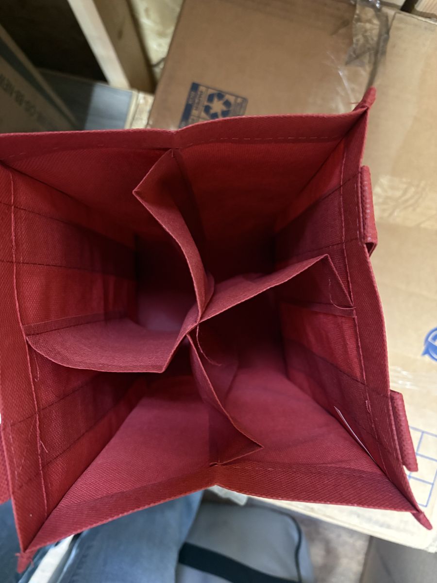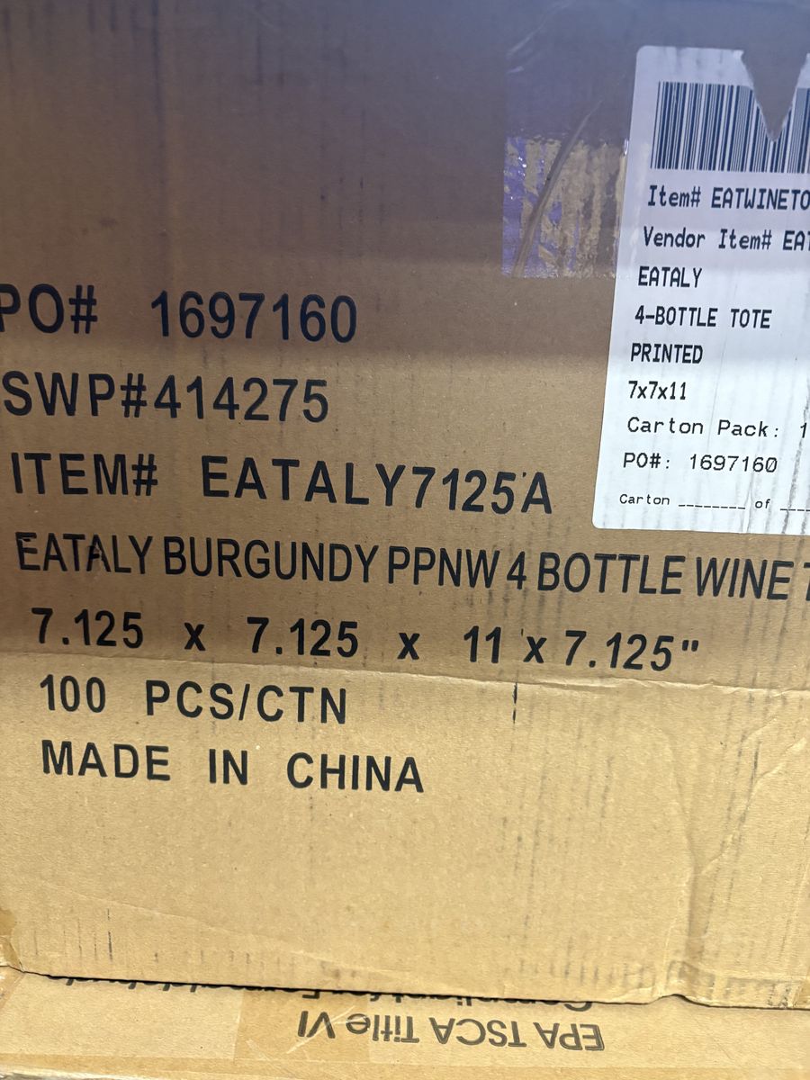 Here is a a box of 100 reusable bags designed to carry 4 wine bottles in each bag. Each bag says Eataly on it.