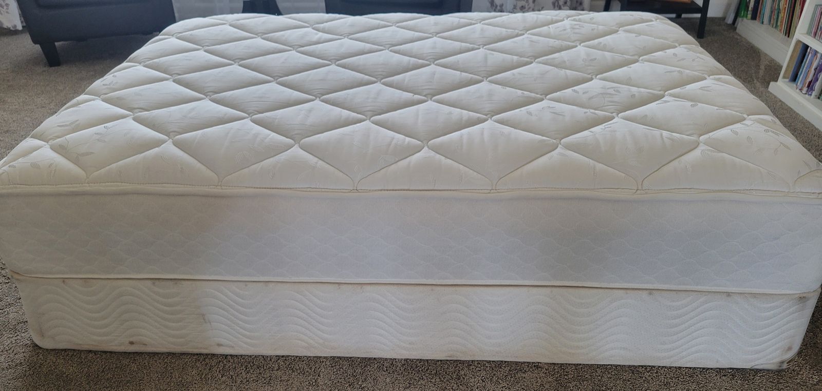 The mattress has not been used much, was in a guest room. No stains. $20 for both the mattress and box spring. The Laura Ashley comforter, 2 pillow shams and dust ruffle shown can also be purchased for an additional $25. OR will take $40 for all.