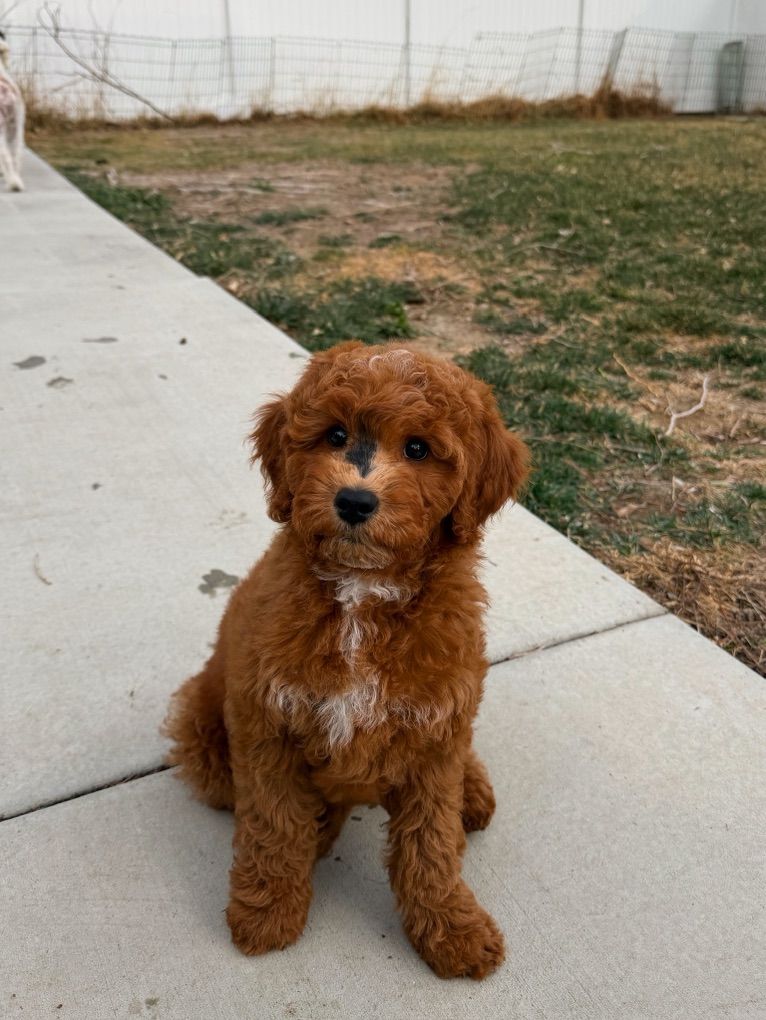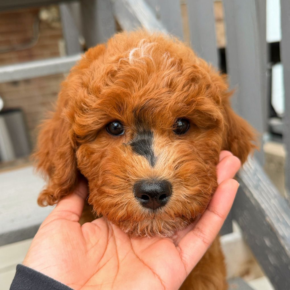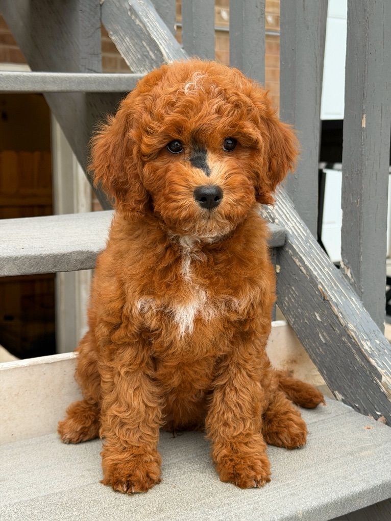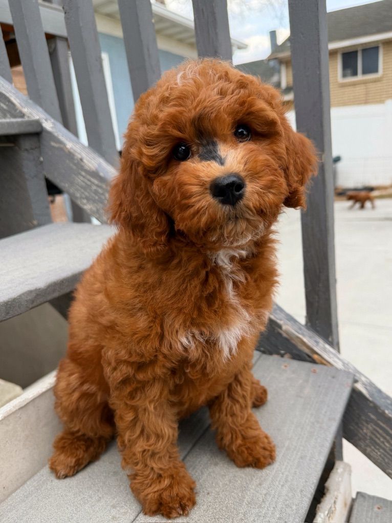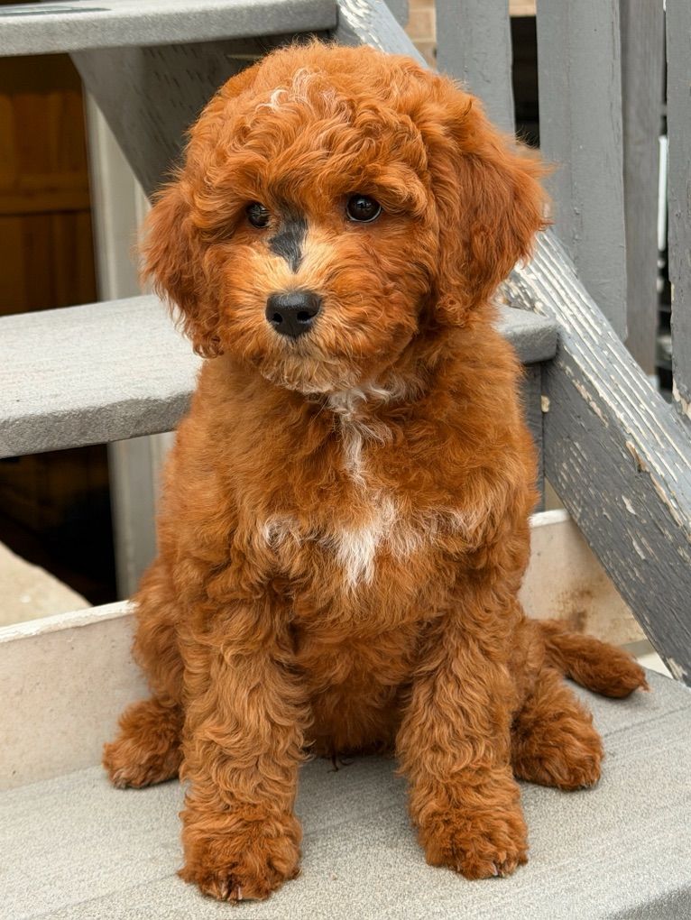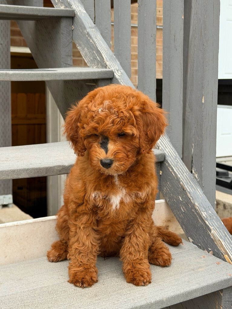 They will not shed at all! Both parents have beautiful temperaments and health tested! One female has the coolest black stripe on her face! It is a black pigment like a birthmark that makes her stand out! She is so unique and beautiful! She will turn heads. In all my years of breeding I’ve never seen a marking like this on a deep red Goldendoodle! They were raised around kids, big dogs and cats and are very socialized and confident. They are doggy door trained to use the bathroom outside. They were dewormed at 2,4,6, and 8 weeks and first and second set of shots given. We have 2 girls and 1 boy left.