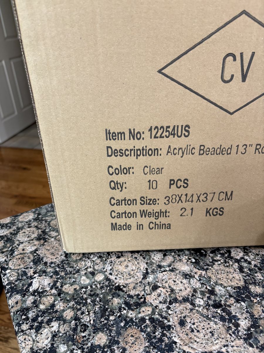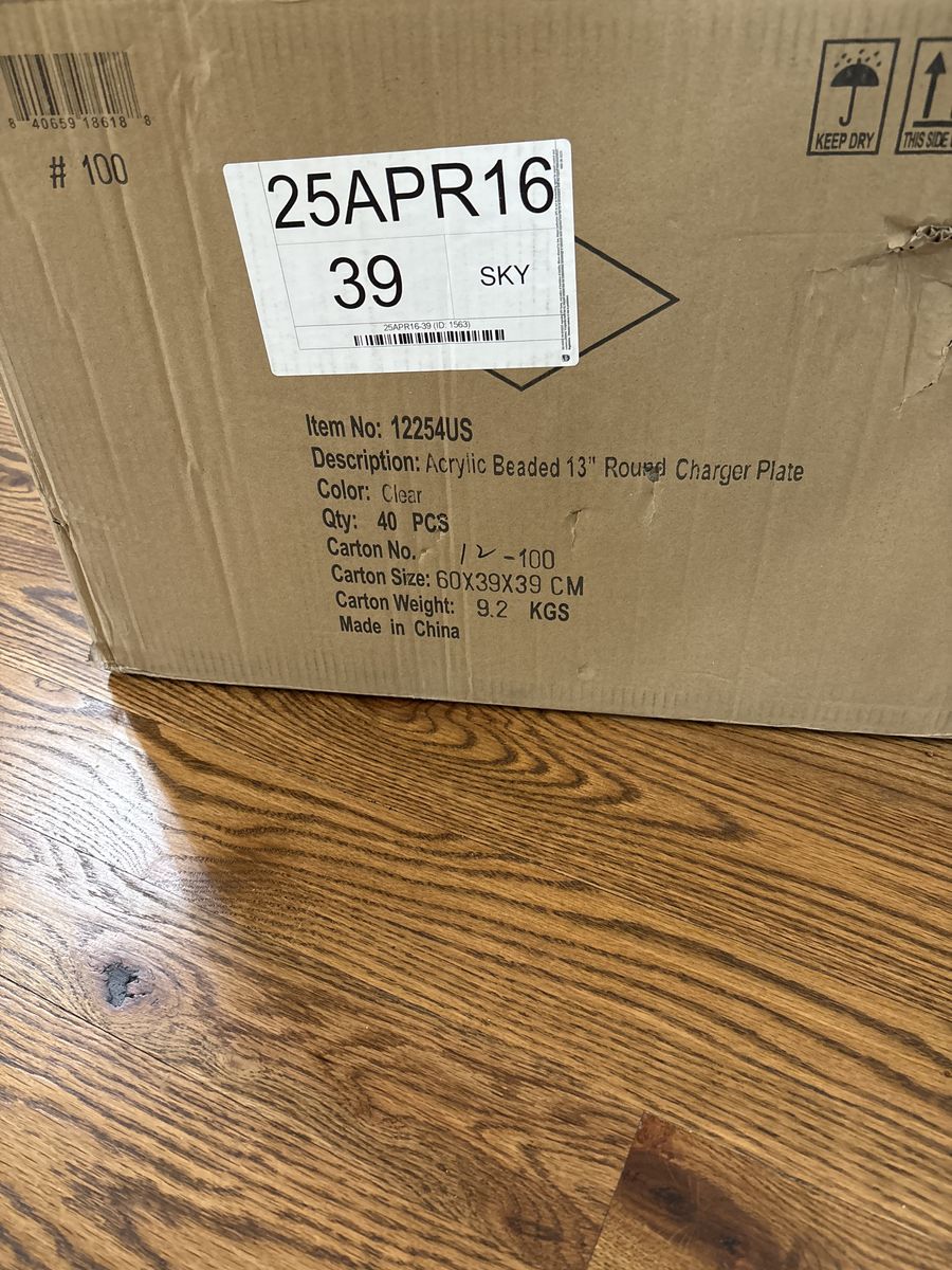 Used once for a wedding. Great for all events- weddings - quinceañera’s- Engagement parties - formal dinners or just for fun! Excellent condition in boxes with covers We have 300 chargers total. These acrylic chargers not thin plastic. $700.00