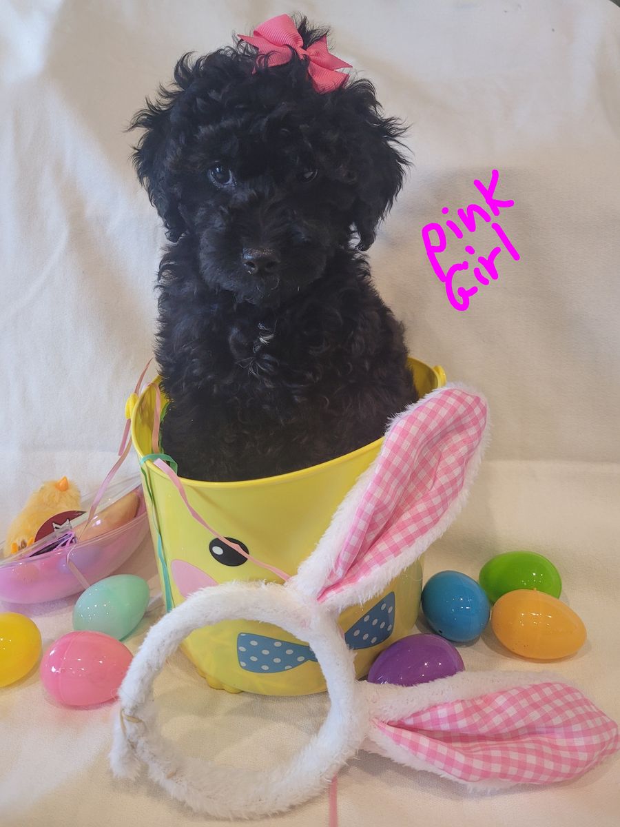 Girl #1- (Pink bow)-She is very sweet, affectionate, and playful. She loves to sleep in your lap, and will cuddle upside down on her back in your arms. She would be a great emotional support puppy! She also get along great with other dogs, and loves kids! She is the perfect Easter present!