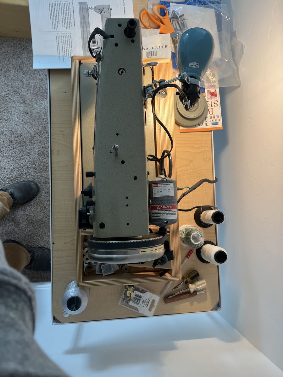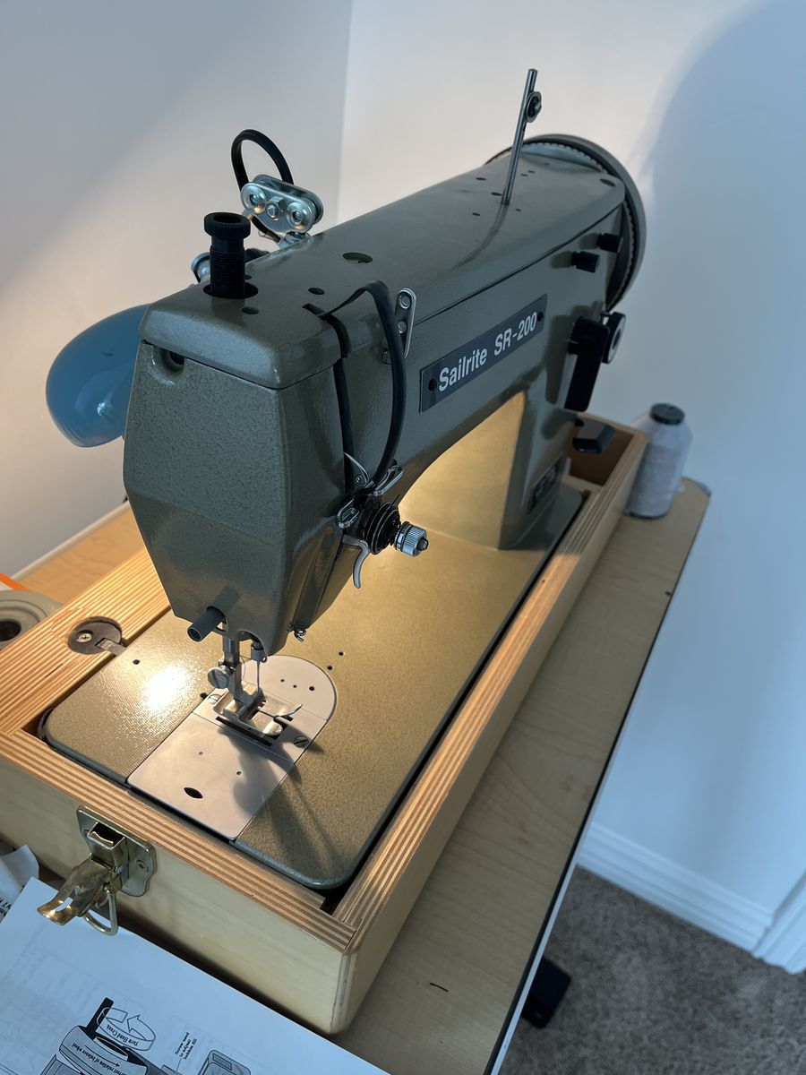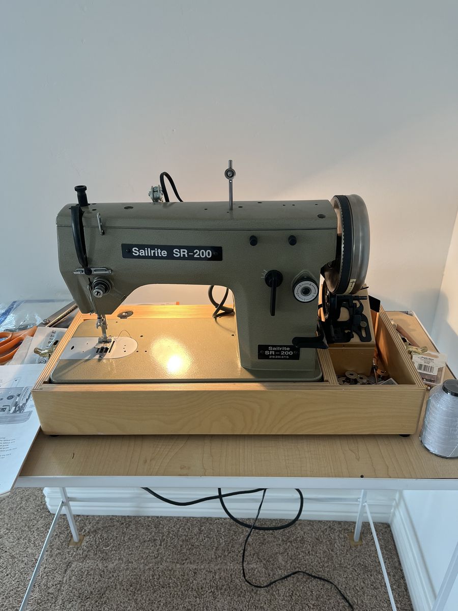 PayPalThe Sailrite SR-200 is a robust, 73.4 lb sewing machine designed for sails and upholstery, featuring a 12mm zigzag width. It uses a walking foot for consistent material feeding.