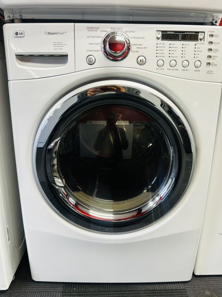 Lg steam dryer electric ultra capacity quiet operation stainless steel drum heavy duty normal cotton towels steam fresh delicate speed dry air dry reduce static easy iron wrinkle care time dry anti bacterial etc..It works great, clean, 45 day warranty, delivery/installation available.