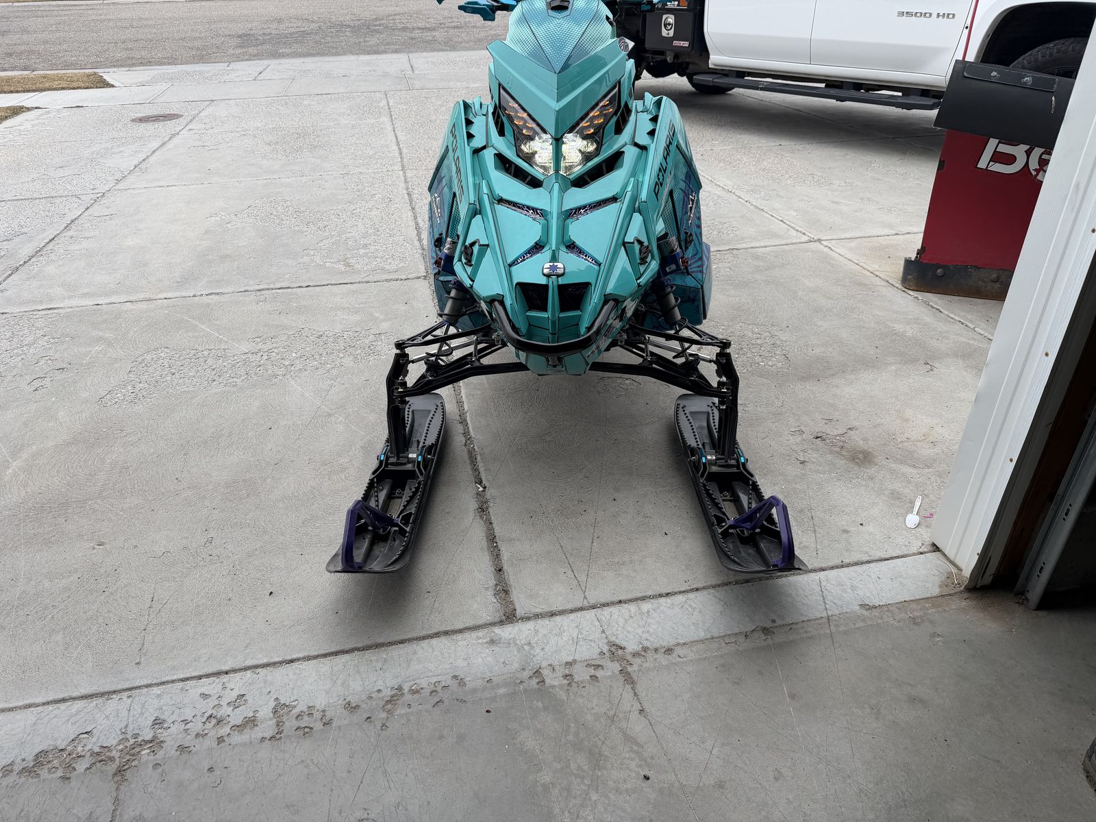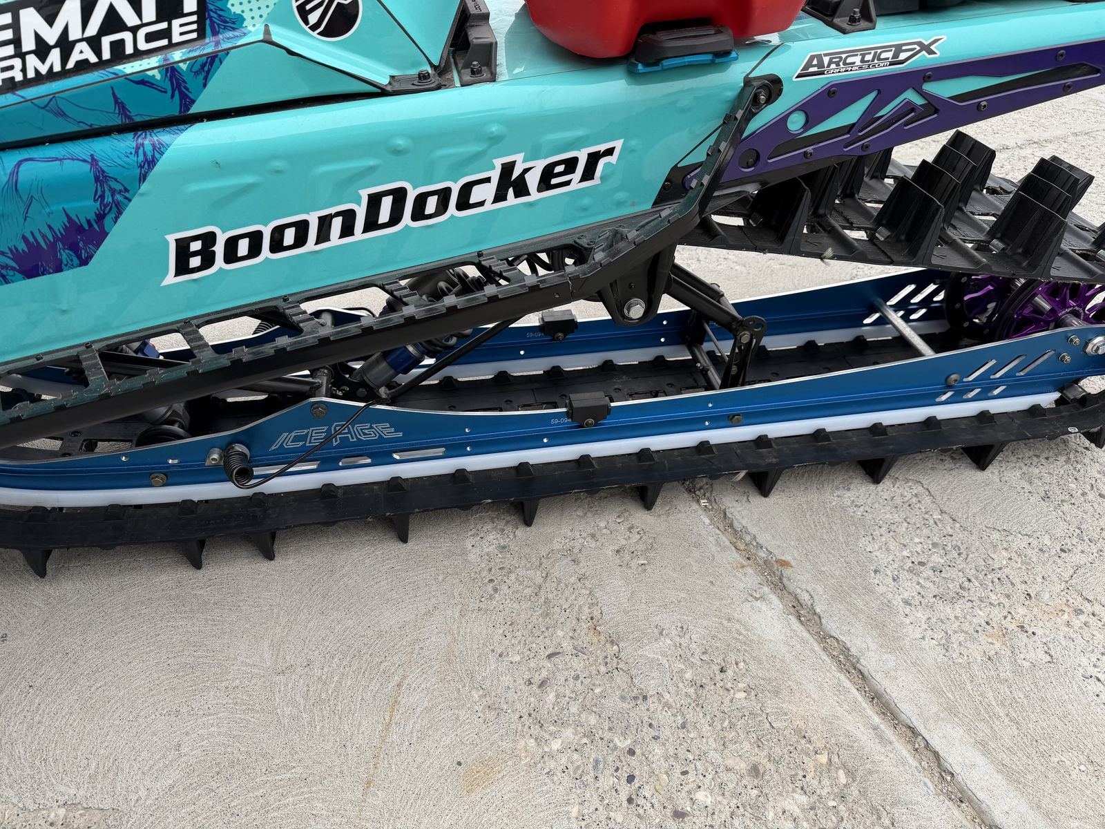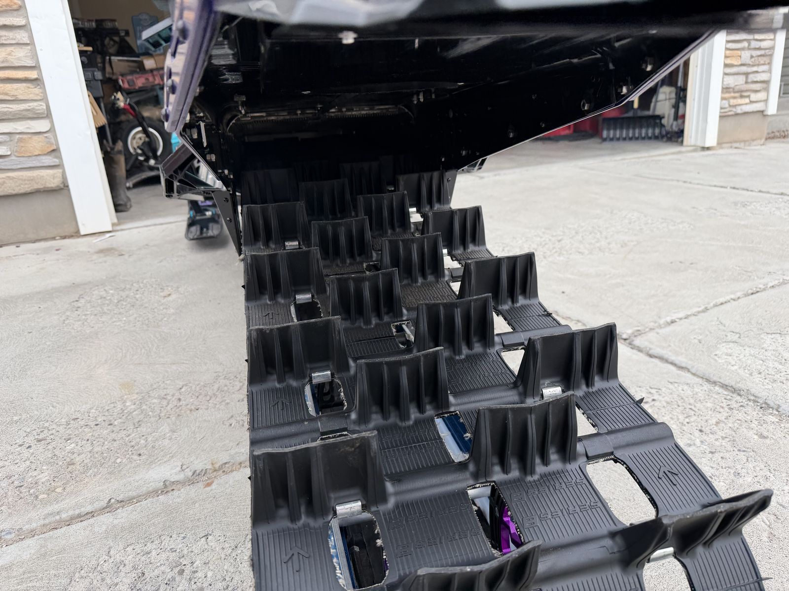 2.75 lug 165 in length on the track. the track is in good shape. Boondocker tunnel dump exhaust, iceage A-Arms and spindles, iceage bomber rails, iceage big wheel kit, Kyber handle bar set up with Kyber finger throttl. this sled runs great.