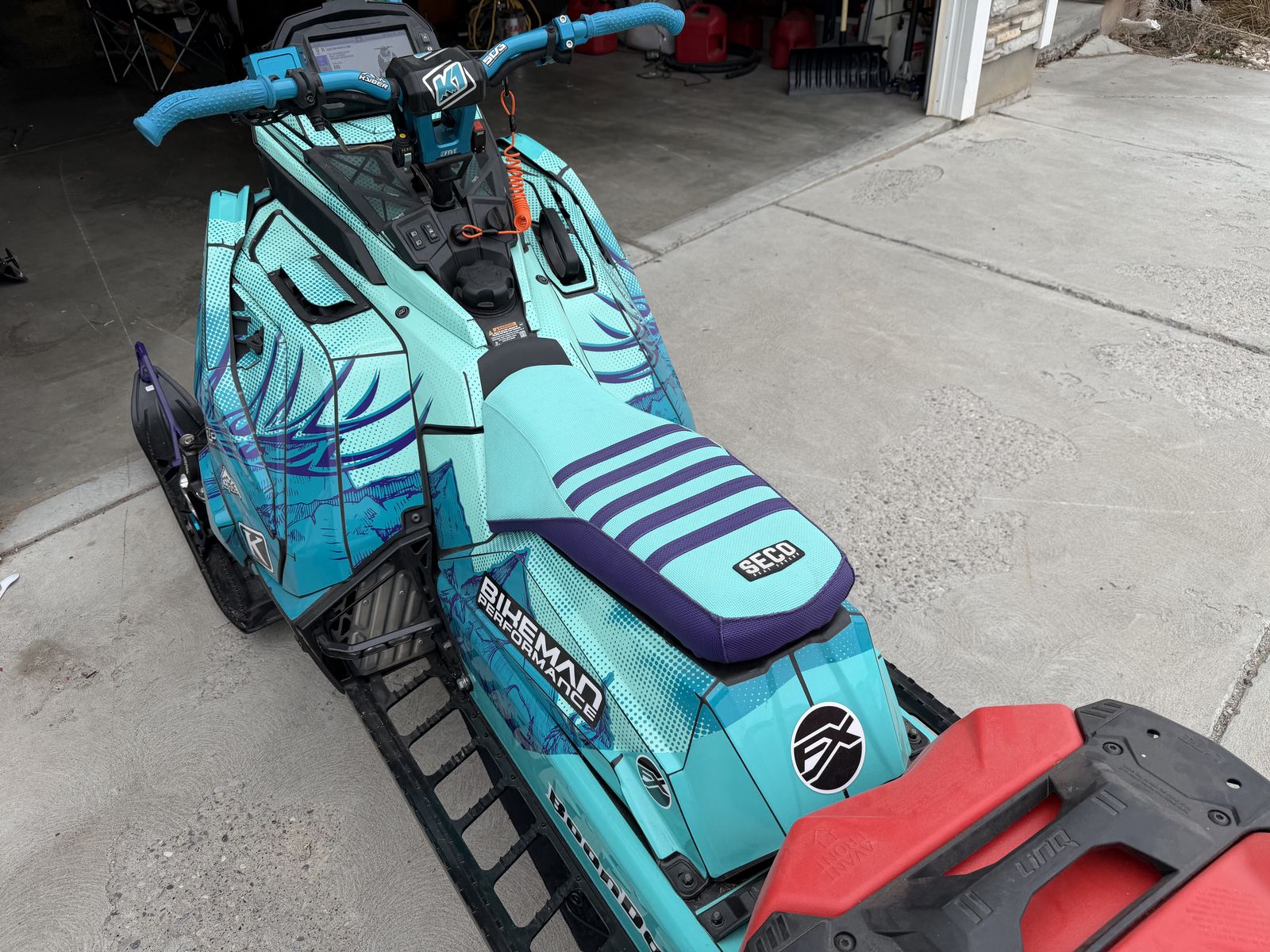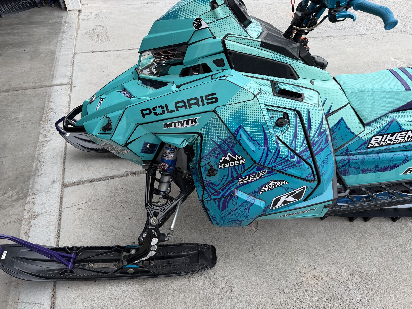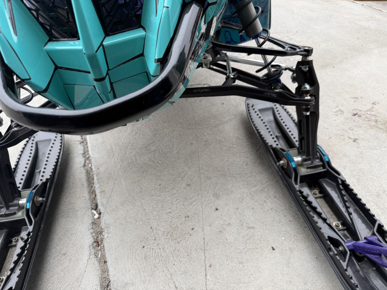 2.75 lug 165 in length on the track. the track is in good shape. Boondocker tunnel dump exhaust, iceage A-Arms and spindles, iceage bomber rails, iceage big wheel kit, Kyber handle bar set up with Kyber finger throttl. this sled runs great.
