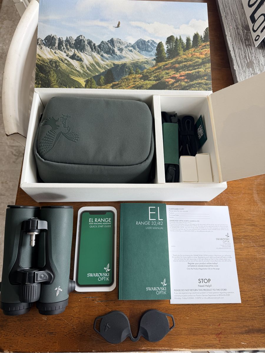 Venmo12x42 EL Range with Tracking Assistant with outdoorsman stud already installed. Excellent condition. I just bought these two months ago and have decided to put the money into a hunt in Sonora next year. Warranty card has not been filled out.