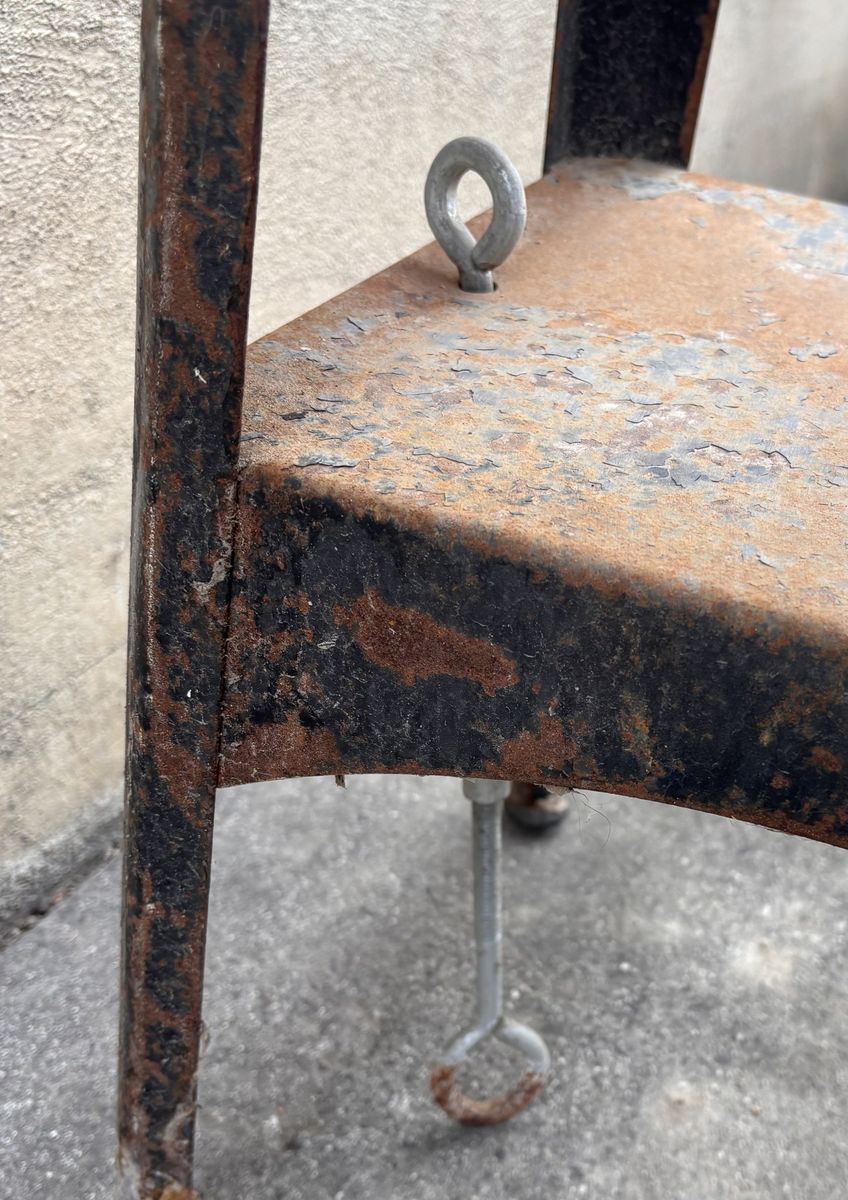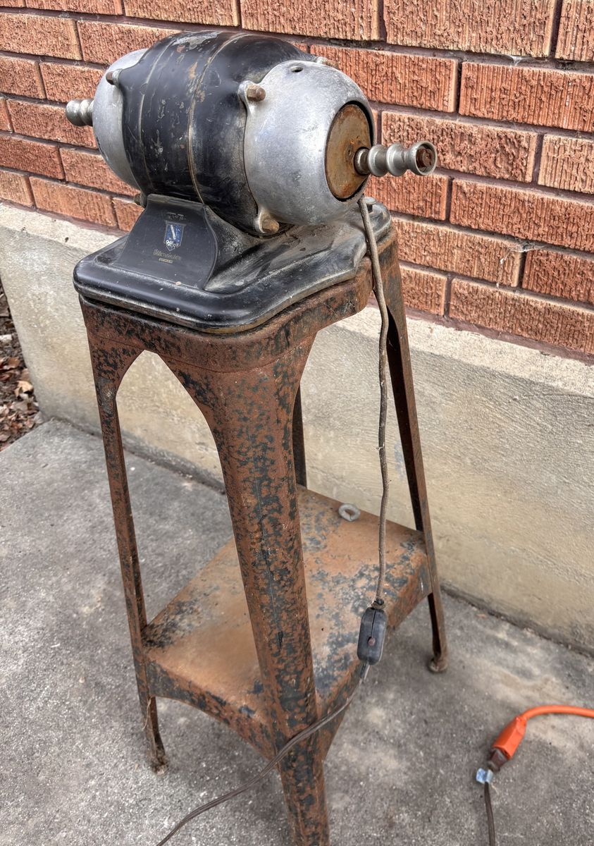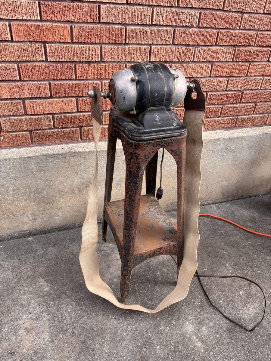 VenmoThis vintage 1920s Graybar Stimulator, belt massager and exercise machine was manufactured by General Electric. I picked it up maybe 40 years ago in upstate New York, where we had it mounted through a floor vent in an old farmhouse, out here in Utah we bolted down through a concrete floor vent, to keep it stabilized. We called it the “giggle machine,” and at birthday parties (before the piñata), kids would line up and get great joy as the belt shook the laughter out of them. The metal stand and a motor mounted on top, could use some paint restoration, and the cord could use replacement, but it works ! Historically used as a “therapeutic massager,” with some preposterous, advertising calling them a weight loss device... guess you can lose weight giggling. CONDITION: the frame and motor are in good warned chip paint condition, with a little surface rust, the belt is in good condition. The end of one of the amateurs is missing its stainless cap, but it was like that when I got it last century, so it doesn’t affect anything operational. Speaking of operational, this will need to be anchored someway, at one point I had it pinned to a half sheet of heavy plywood, so standing on it gave added stability. I also mentioned that I had it pinned to openings in the floor, a bit of that hardware is still attached (SEE PIC). Get this rigged correctly, and it will be a whole lot of fun. Similar models have been sold for approximately $200-400.