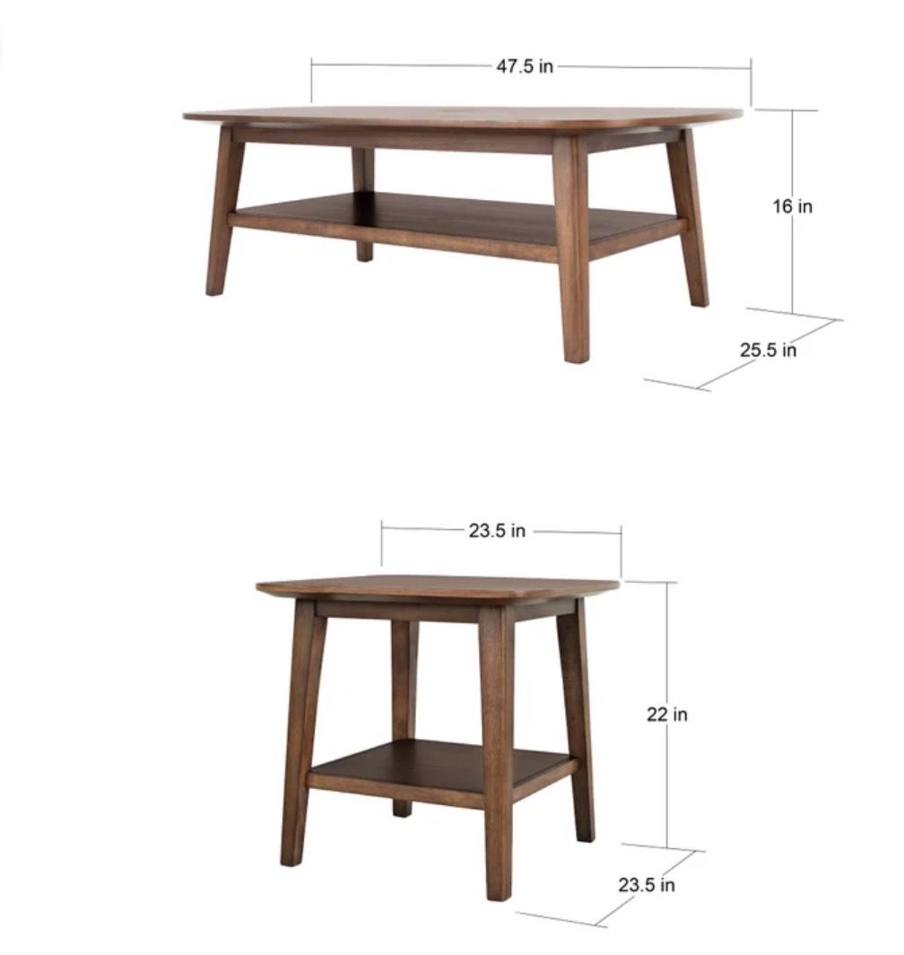 Coffee Table Dimensions 47.5W x 25.5D x 16H End Table Dimensions 23.5W x 23.5D x 22H Coffee Table Weight 41.34 lb. End Table Weight 25.79 lb. Model # P0392 Materials Rubberwood Solids And Walnut Veneers Type 3-Piece Occasional Set