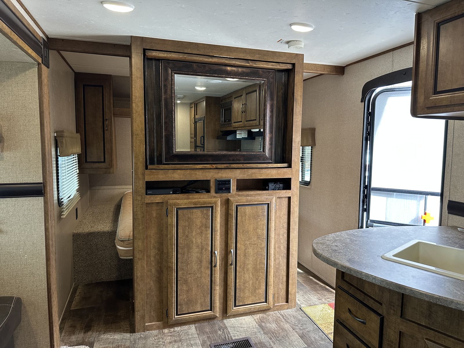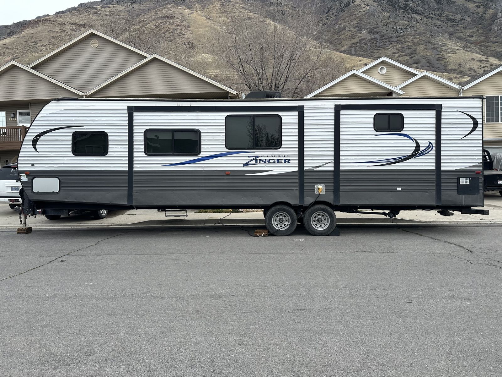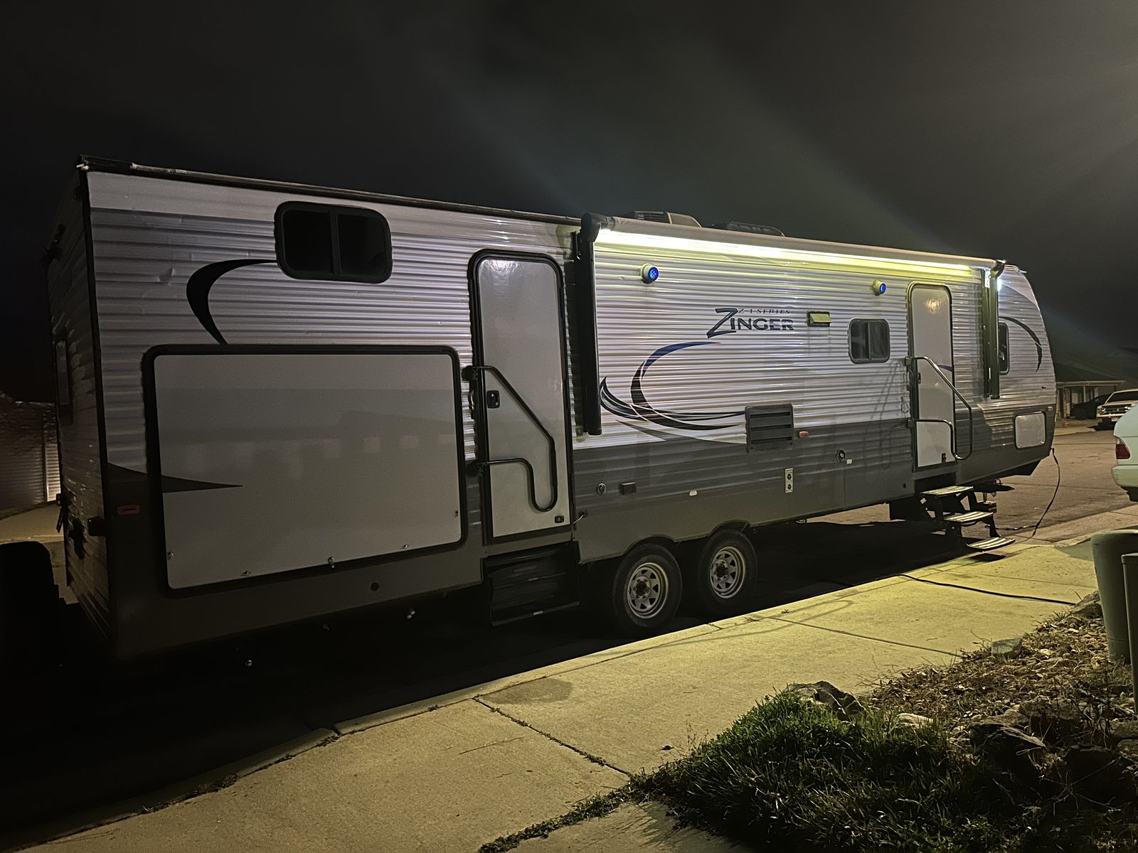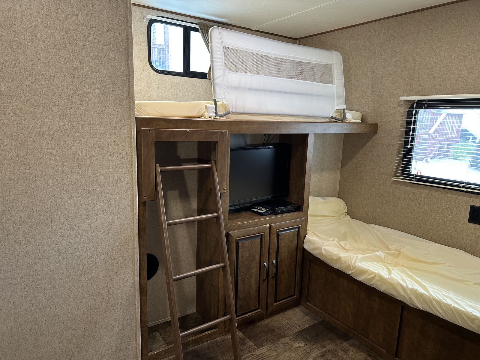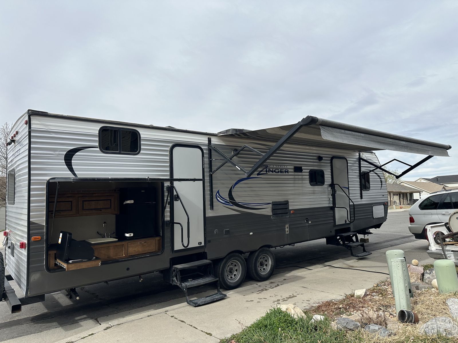 VenmoSleeps 10-12 people comfortably. Queen bed in front, doors going to each side of the bed for easy access. Couch turns into bed, with storage under couch. Cupboards above couch, table goes into bed, with storage under the benches. Kitchen has tons of cupboards, a large pantry. Closet for towels and other things. Bunk house in the back with a couch turning into bed, a pull out under couch, top bunk above couch, bunk above outdoor kitchen and smaller bed in the back. TV and DVD player in back room with storage under TV. Storage under back bed. Put in the TV that rotates so you can watch it in the bedroom or living area, mirror on reverse side. Outdoor kitchen with a quick connect on propane, cupboards above with storage going on top, outdoor fridge with storage below it. Awing is electric with no tears. Door leading to the bathroom so nobody walks through your trailer. Added a back up camera, added power switch to turn off the batteries so it won’t pull power when storing. Replaced and put a new electric jack in front. Put the grabber bars on both outside doors for kids to reach and get in. Put handle on inside door to close easier. Packed bearings this last year. Tires are two years old, with spare tire on back. Outdoor shower. Large cubby in front. This is a 36 1/2 Ft trailer, planning on selling the sway bar with trailer. It’s a beautiful must see trailer.