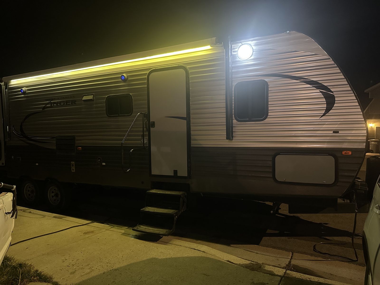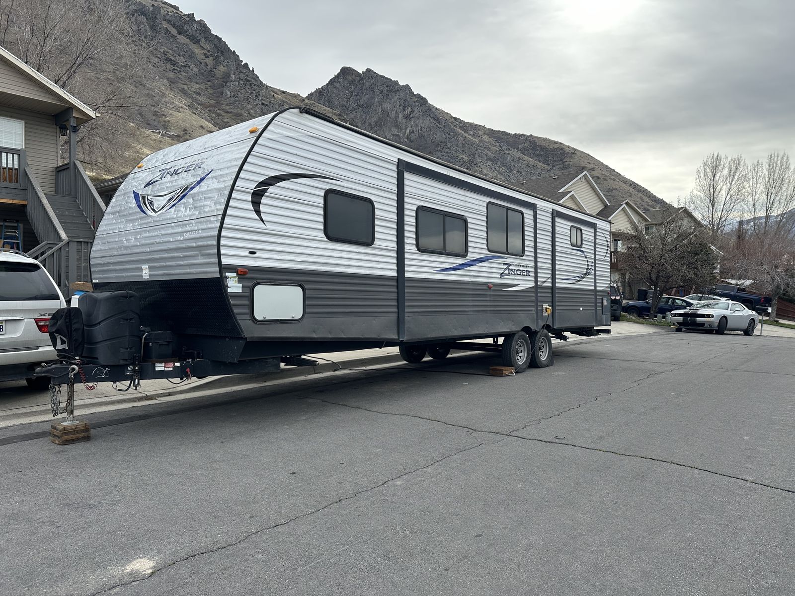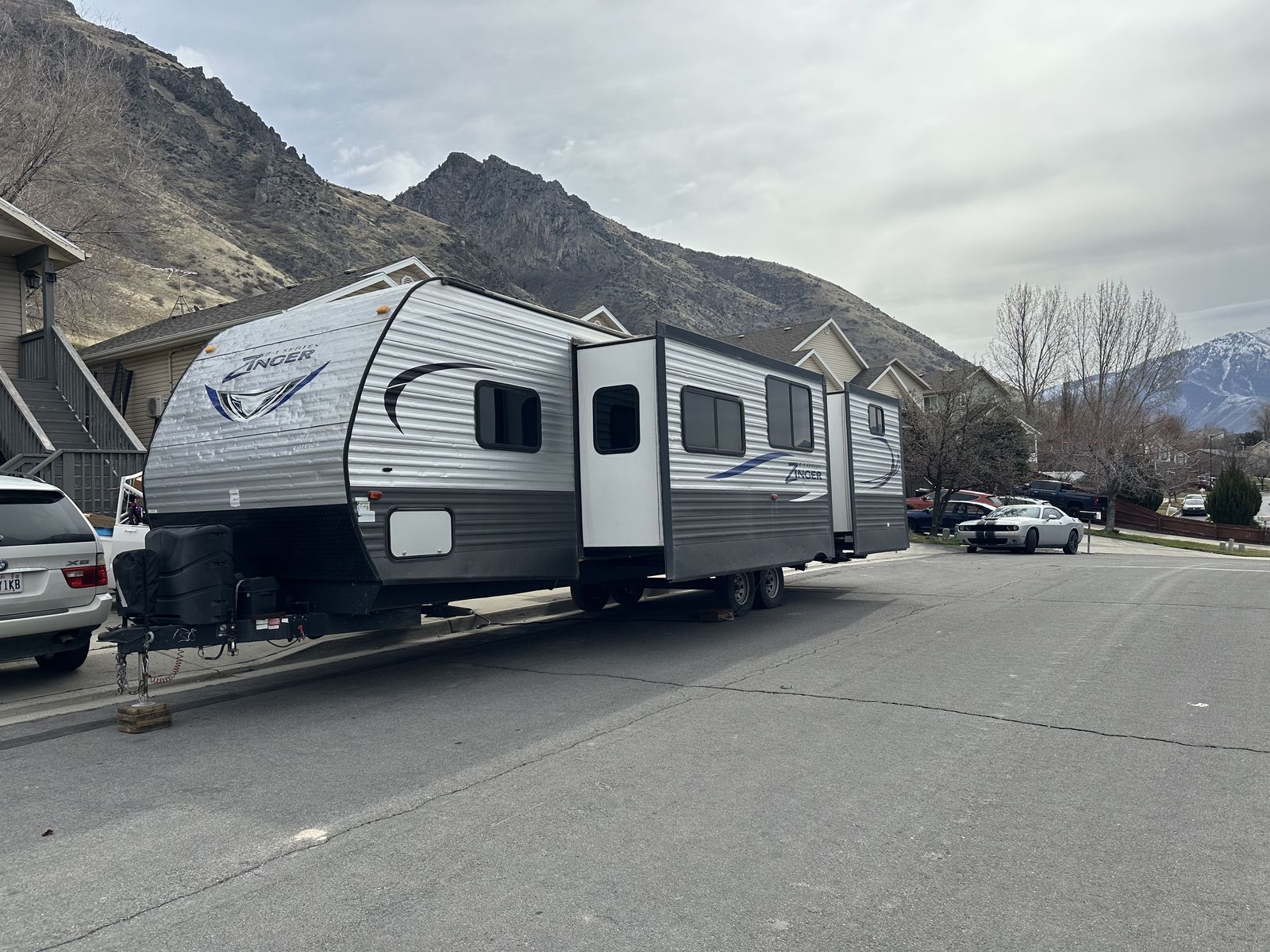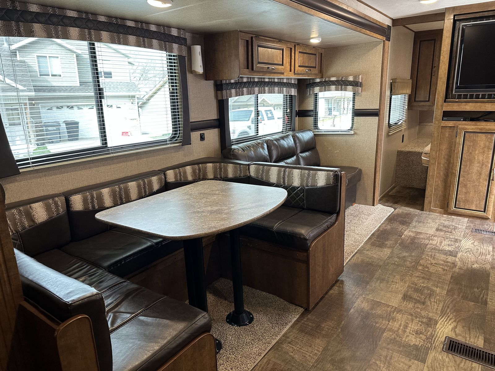 VenmoSleeps 10-12 people comfortably. Queen bed in front, doors going to each side of the bed for easy access. Couch turns into bed, with storage under couch. Cupboards above couch, table goes into bed, with storage under the benches. Kitchen has tons of cupboards, a large pantry. Closet for towels and other things. Bunk house in the back with a couch turning into bed, a pull out under couch, top bunk above couch, bunk above outdoor kitchen and smaller bed in the back. TV and DVD player in back room with storage under TV. Storage under back bed. Put in the TV that rotates so you can watch it in the bedroom or living area, mirror on reverse side. Outdoor kitchen with a quick connect on propane, cupboards above with storage going on top, outdoor fridge with storage below it. Awing is electric with no tears. Door leading to the bathroom so nobody walks through your trailer. Added a back up camera, added power switch to turn off the batteries so it won’t pull power when storing. Replaced and put a new electric jack in front. Put the grabber bars on both outside doors for kids to reach and get in. Put handle on inside door to close easier. Packed bearings this last year. Tires are two years old, with spare tire on back. Outdoor shower. Large cubby in front. This is a 36 1/2 Ft trailer, planning on selling the sway bar with trailer. It’s a beautiful must see trailer.