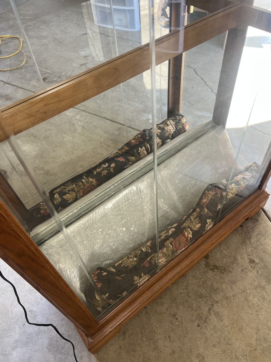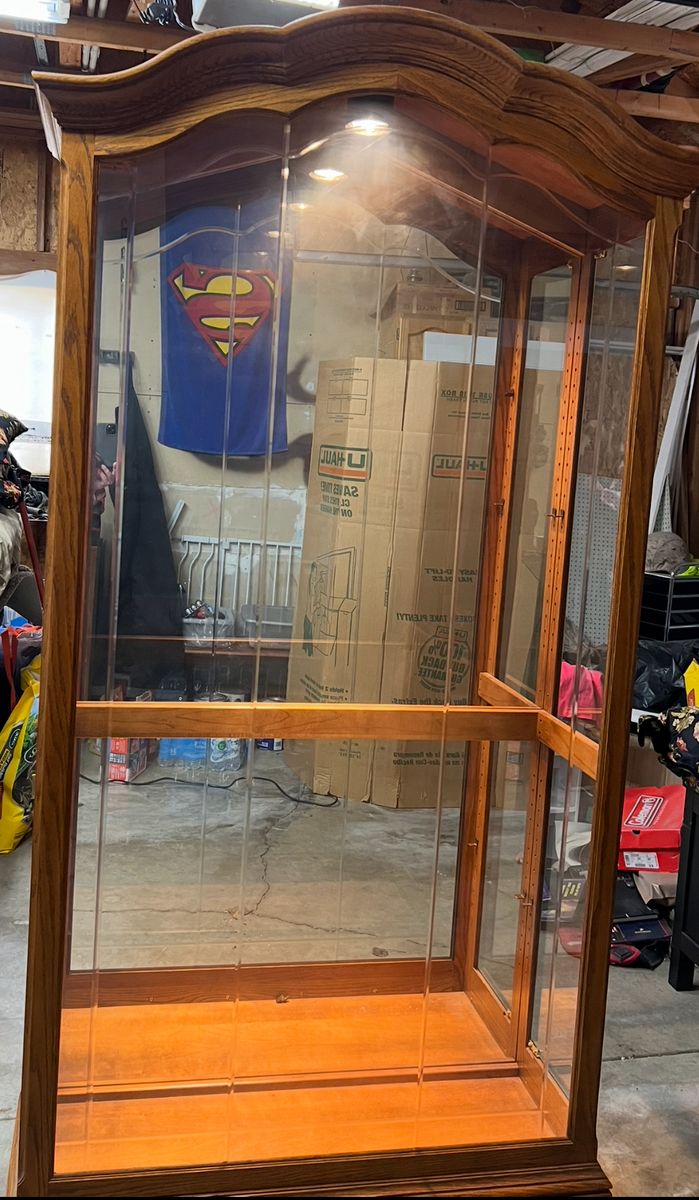 VenmoGlass china cabinet with 4 shelves and single center light. Small scuffs and bottom but overall in very good condition. 82” high and 42” wide.