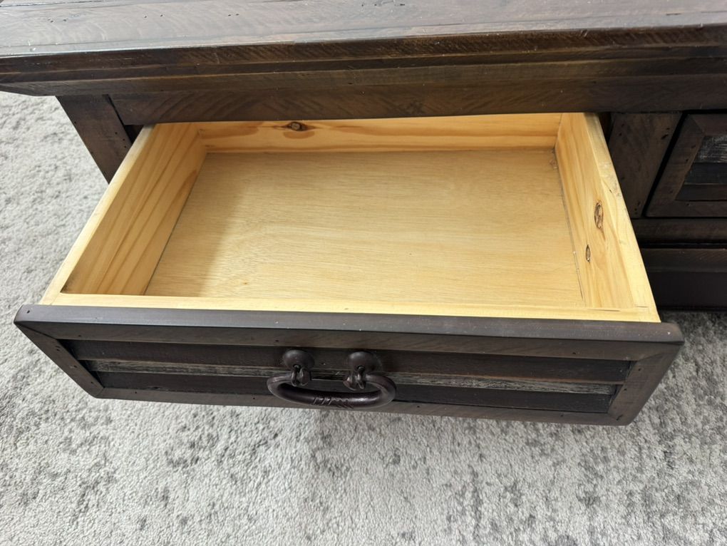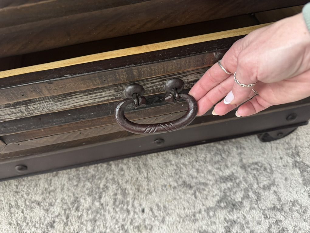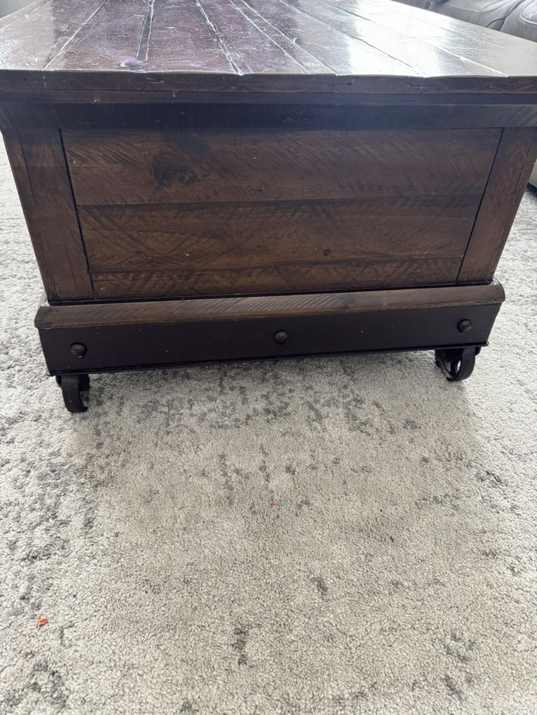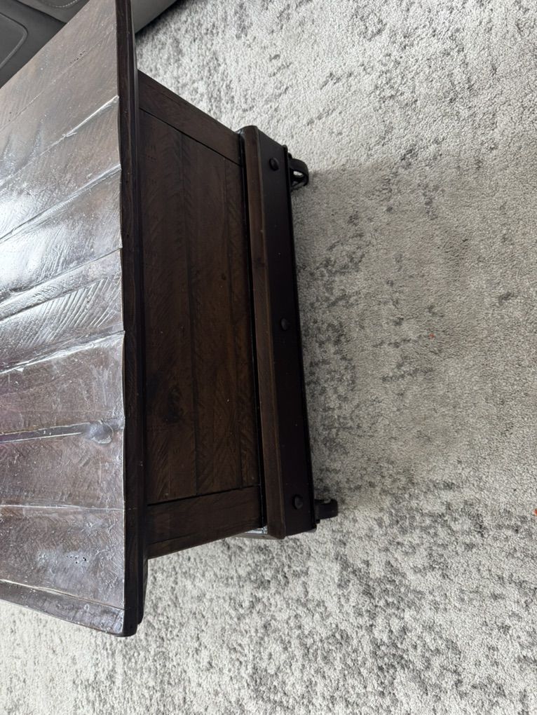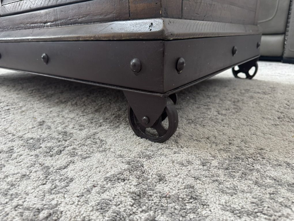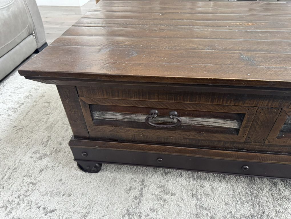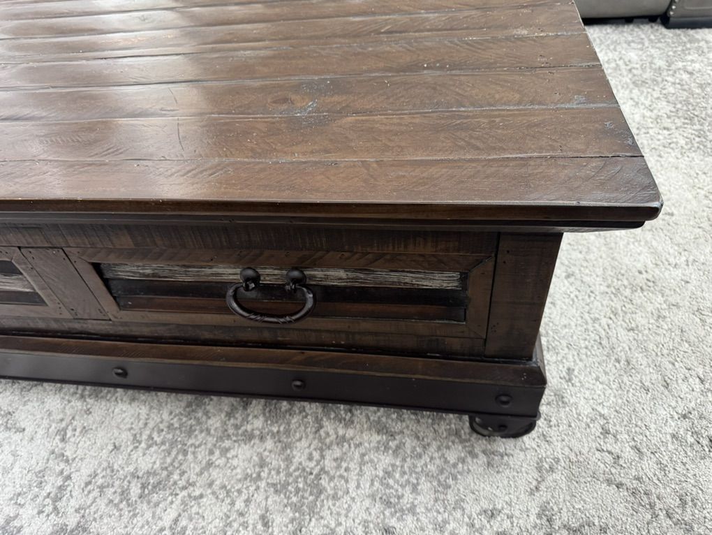 ApplePayThis beautiful $849 Ashley Furniture coffee table has a solid wood plank top, two large storage drawers, distressed wood drawer fronts, iron hardware, and riveted metal accents along the base. The table sits on industrial-style caster wheels which gives it a great farmhouse / loft look.