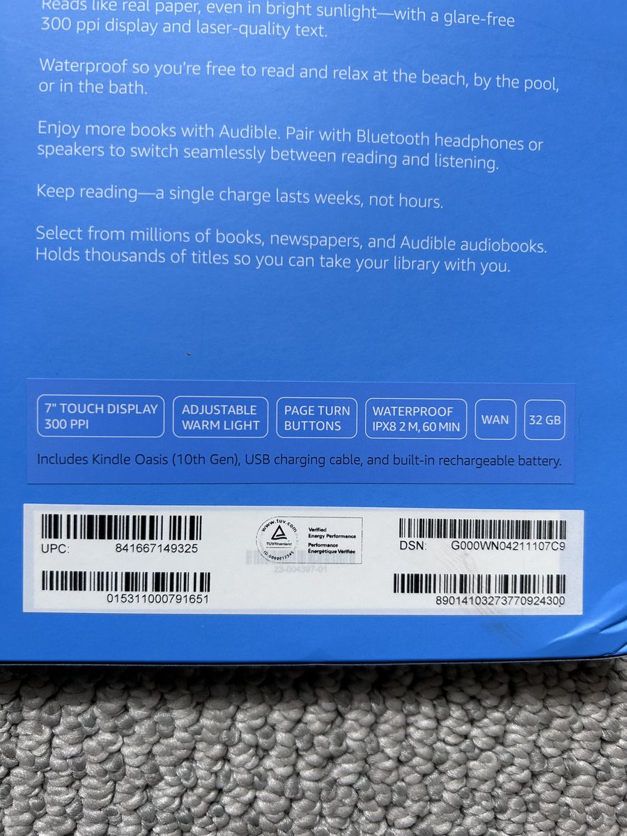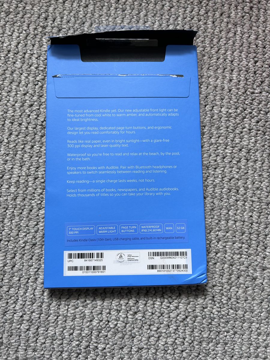 ApplePayNew in box 10th Generation Kindle Oasis. Graphite. 32Gb 7 inch touch display. The box is open at the top but it has not ever been taken out of the box. $200