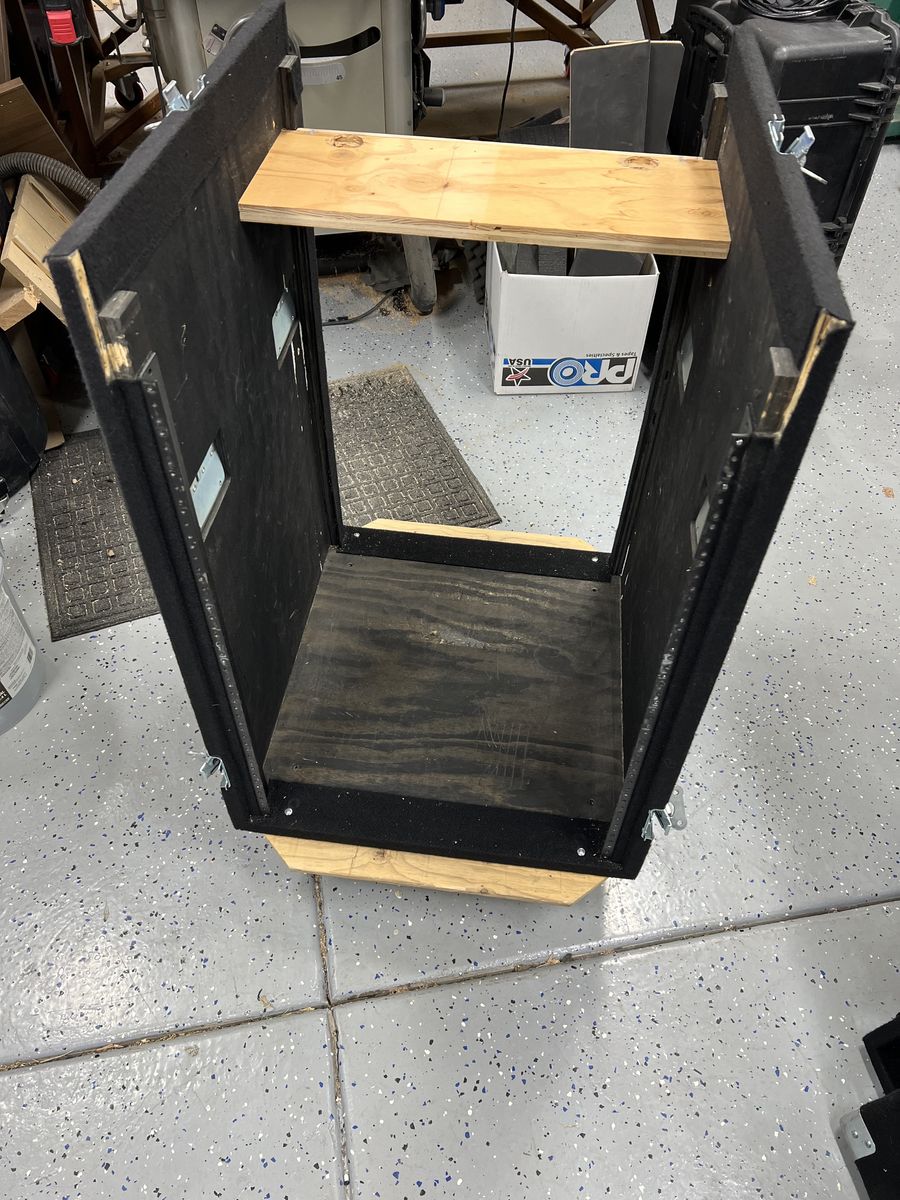 CashAppThis is a carpeted, rolling, 16 space rack. The top was modified a little bit to for a mixer to sit in while still being able to close the lid. It is a bit wobbly when it’s empty, but as soon as it’s full of racked gear it’s good and solid.
