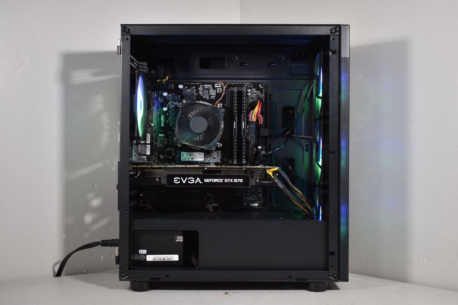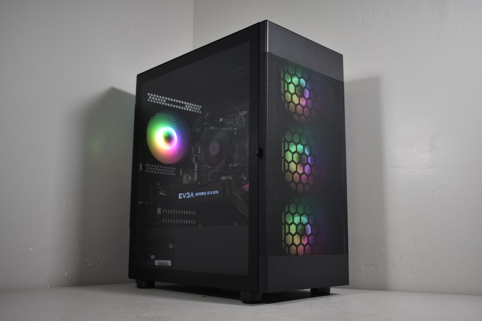 Case: DIYPC Black Tempered Glass! This case has amazing airflow! It comes equipped with 4x ARGB Fans! All ARGB is synced and controlled with a button on the case and has many many different lighting modes!