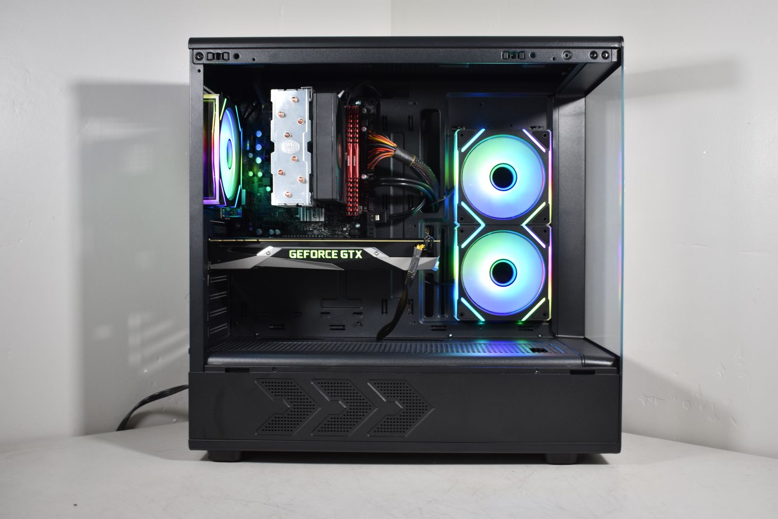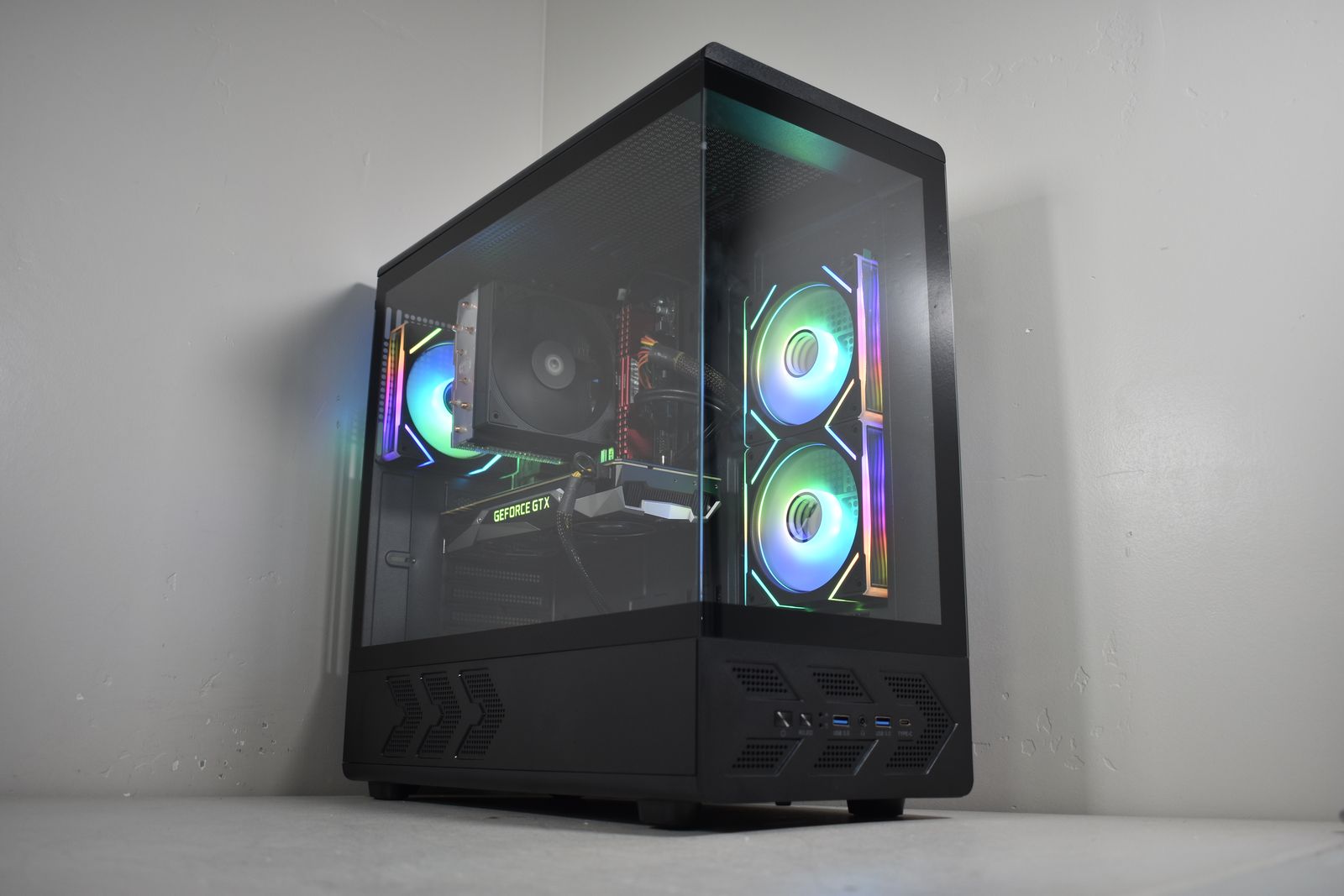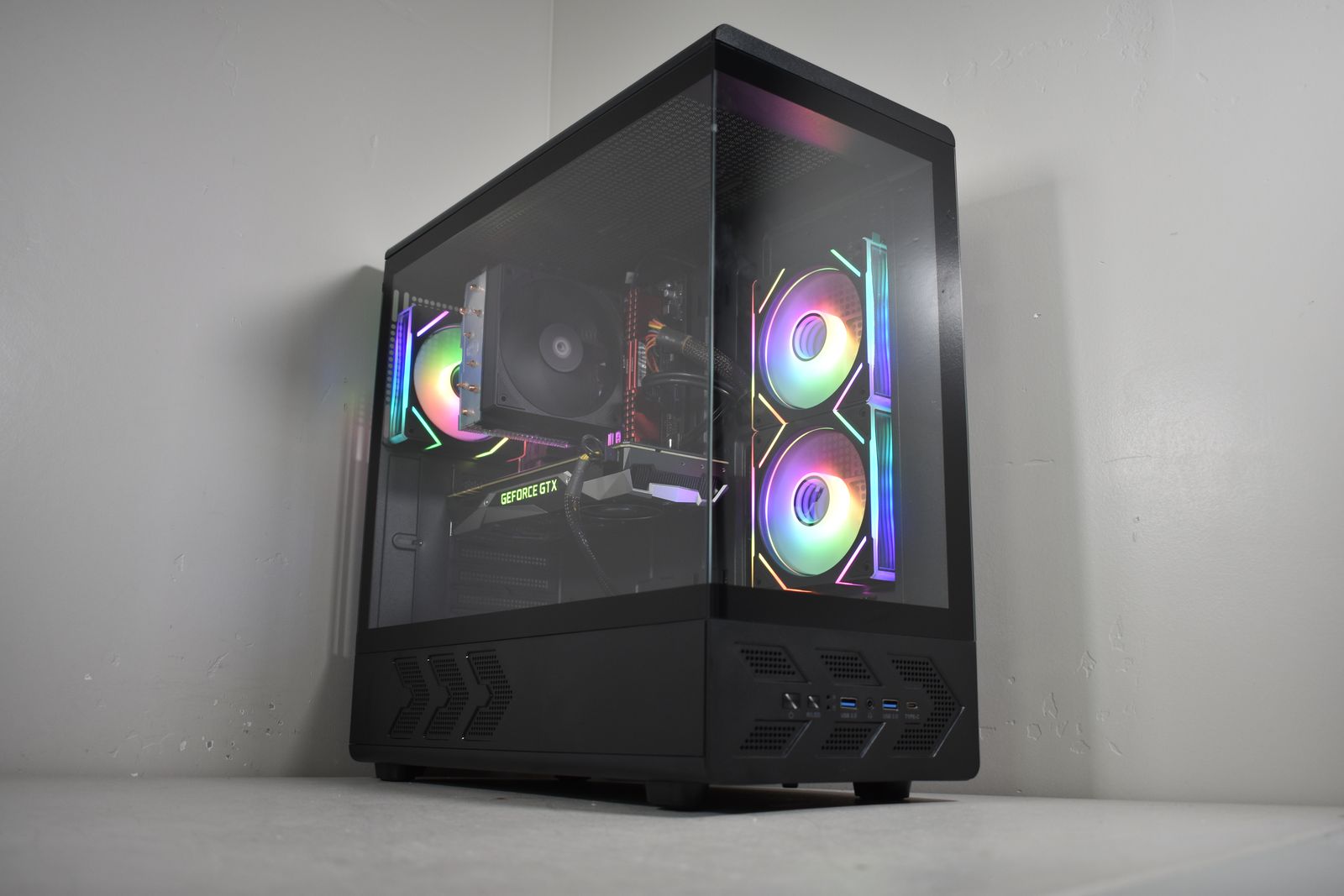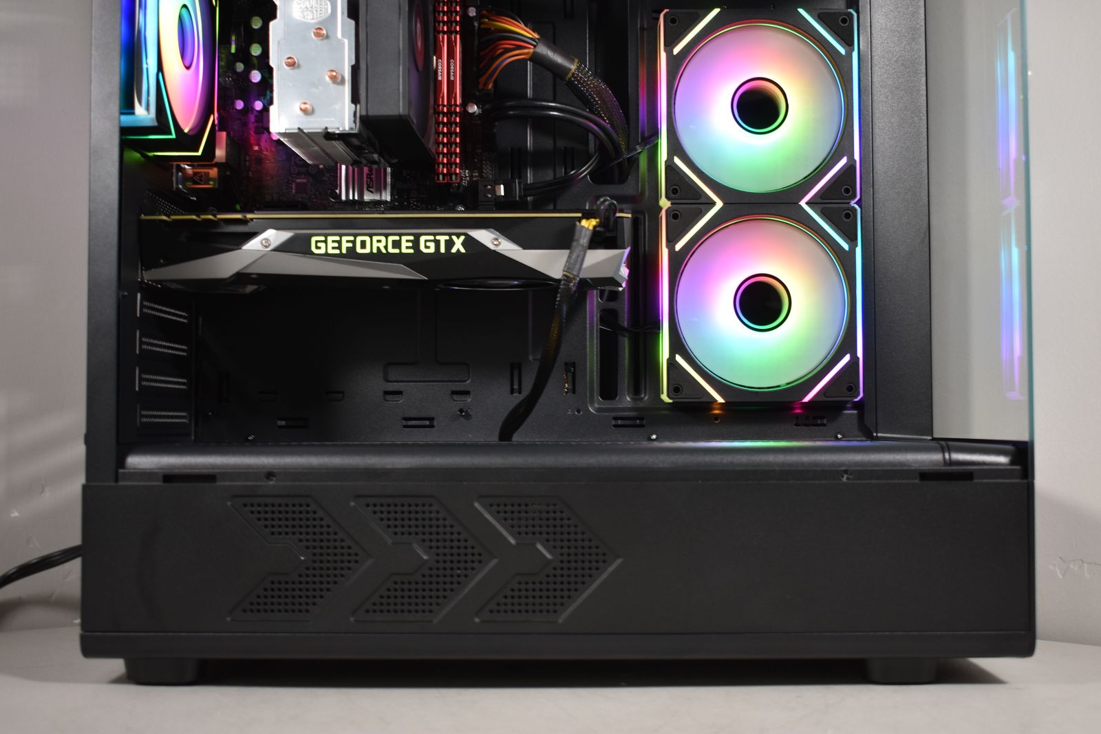 Case: DIYPC Black Tempered Glass! This case has amazing airflow! It comes equipped with 3x ARGB Fans! All ARGB is synced and controlled with a button on the case and has many many different lighting modes!