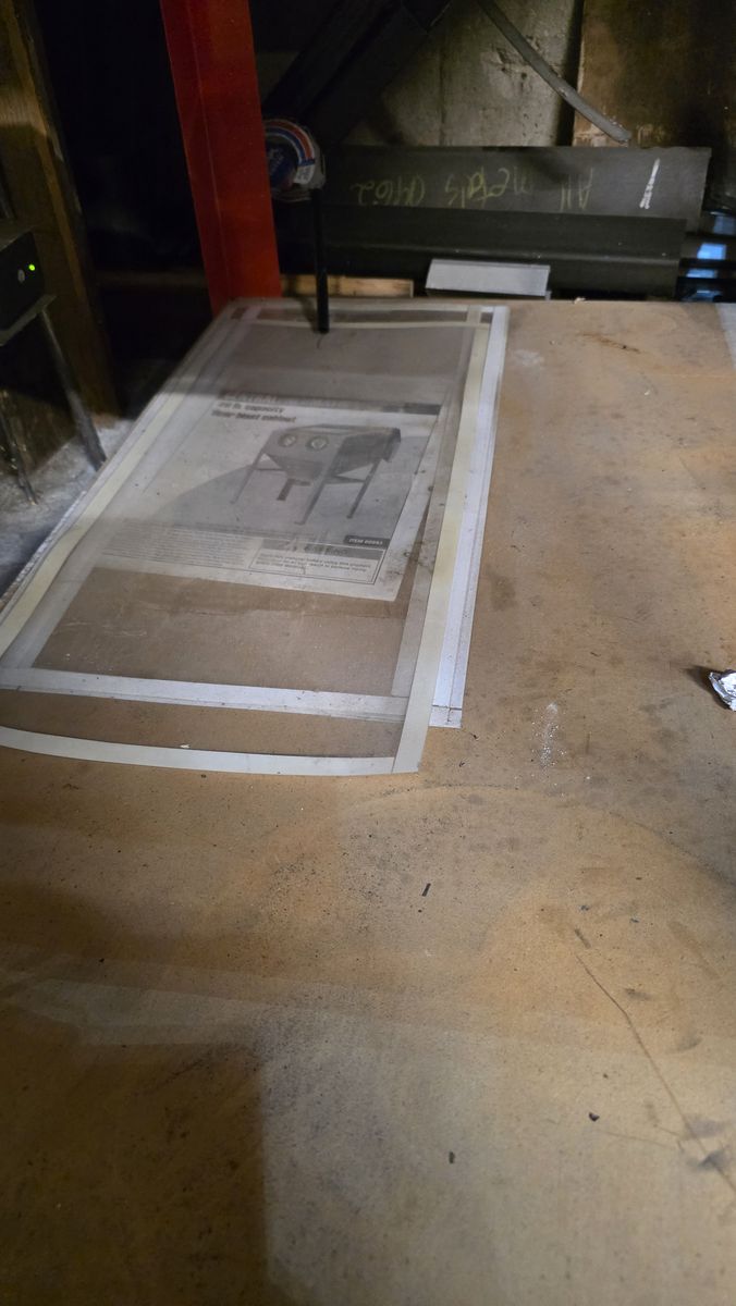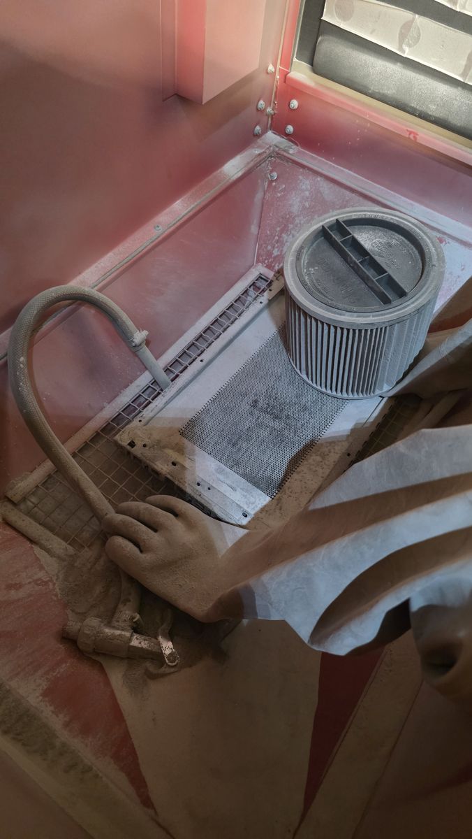 Modified harborfreight blast cabinet. It was a side load, I modified the top to open and cut the floor grill down for ease of use and increased capacity. I placed a 3/4" MDF base on for storage and rigidity and added casters on the bottom to be able to move it around. There is good glass media in it currently. I have all the original screen protectors, never needed to change one yet. Lighting could be improved. Otherwise works great. I just don't use it anymore.