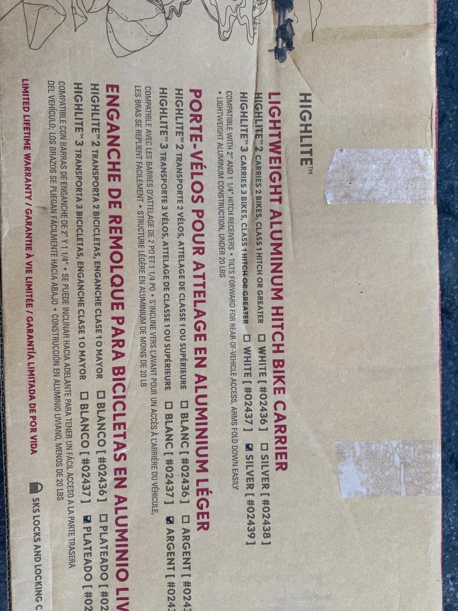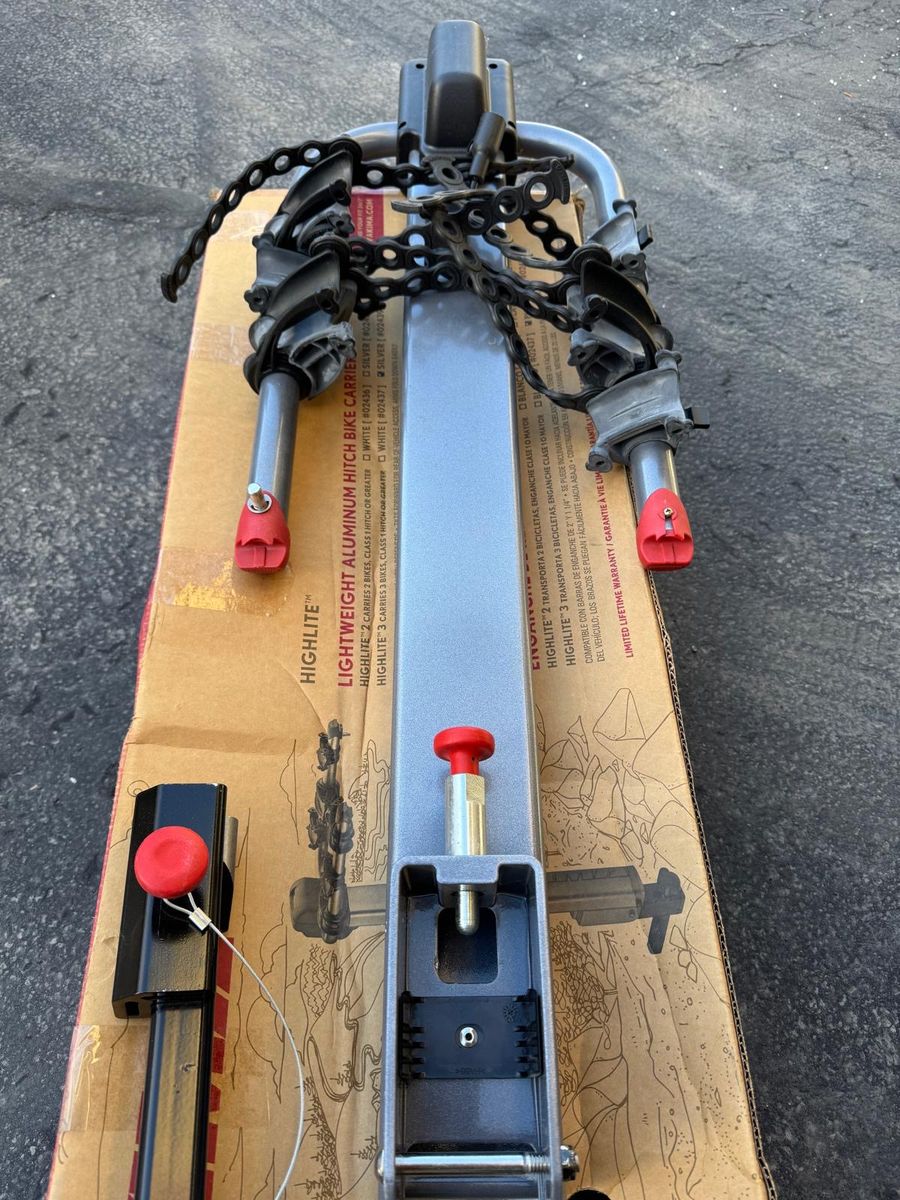 Like new, virtually unused, as pictures show. Carries up to 3 bikes. Lightweight aluminum construction makes the Yakima Highlite 3 Bike Hitch Carrier easy to lift and attach to your vehicle. Can tilt backwards to allow access to the rear of the vehicle.