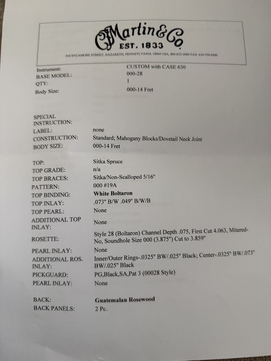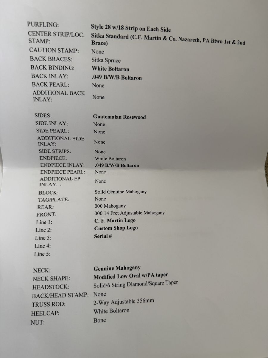VenmoThis is a stellar guitar from the Martin Custom Shop! Mint condition. Made with an awesome set of Guatemalan rosewood. Guatemalan has quickly become the wood used for Martin's most special (and expensive!) guitars. Search for guatemalan rosewood Martins and you'll see what I mean - they'll all be more expensive than this one. Beautiful sweet sounds out of this guitar. The size is 000. This guitar will surely continue to appreciate in value as Guatemalan Rosewood becomes harder to get and more expensive. No trades, please.