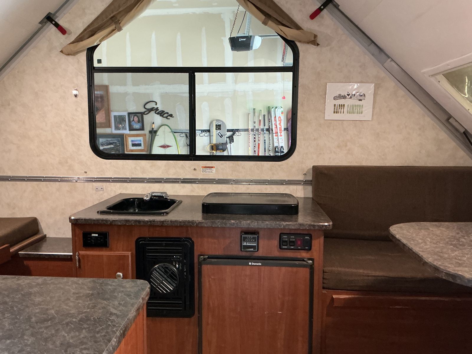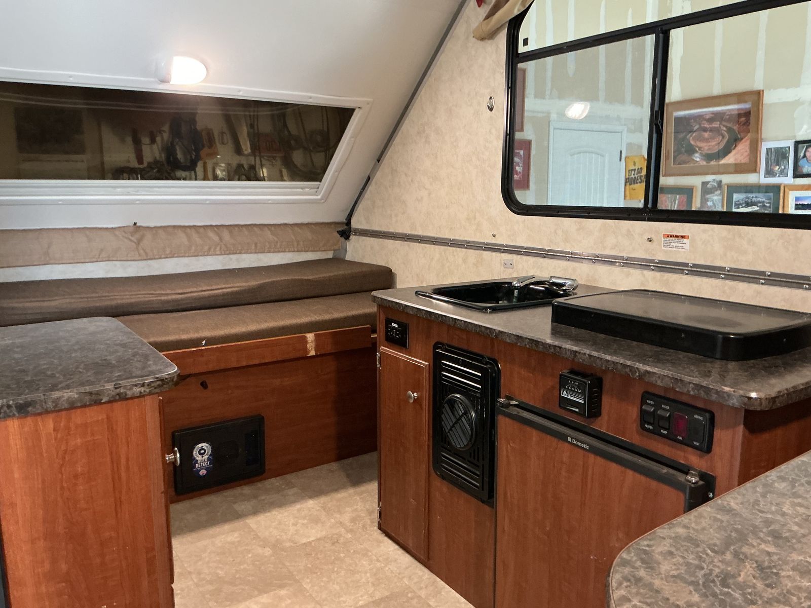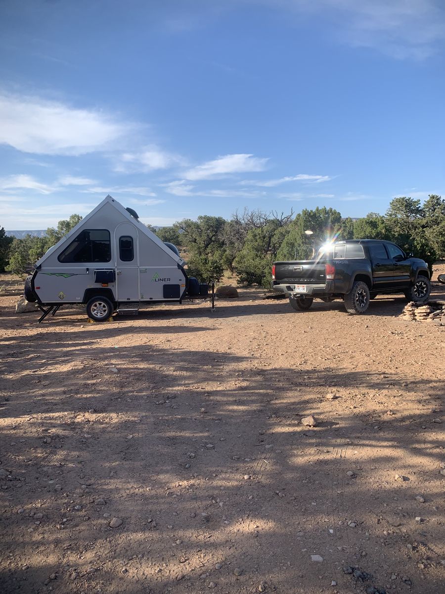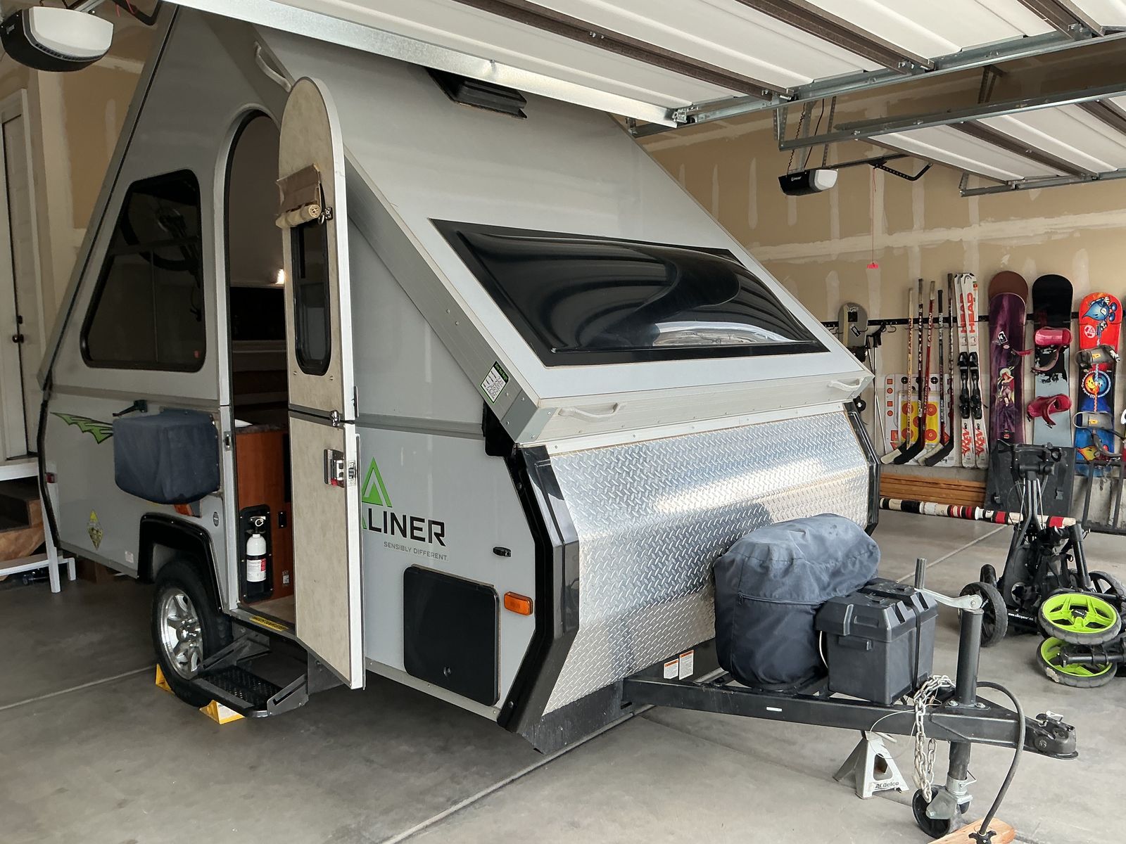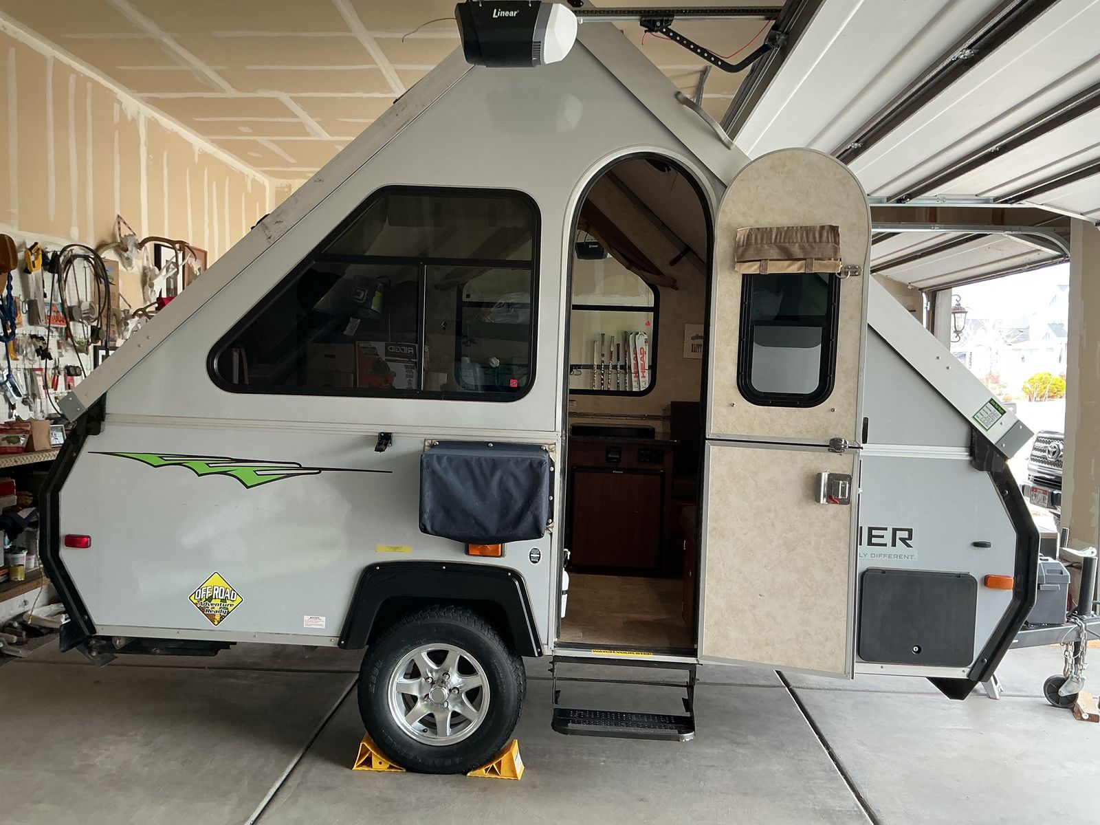 PayPalThis Aliner 12 is off road equipped, lightweight, flat top when traveling, hard side when fully erected. It can be towed by most SUV's, crossovers, or a midsize pickup truck. (weight 1626 lbs) It's compact A frame is easy for one person to set up. The design allows for efficient use of space, comfortable sleeping for four people. Includes 2 burner stove, refrigerator, furnace, air conditioning, 11 gallon fresh water tank, 6 gallon water heater tank, kitchen sink, outdoor shower, water pump, 12 volt battery, and 2 propane tanks. I have kept it in my garage the three years I have owned it.