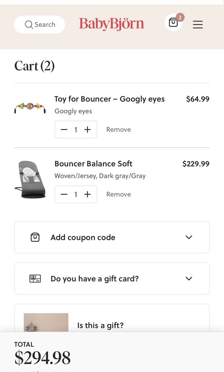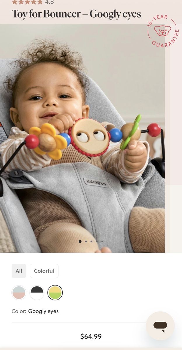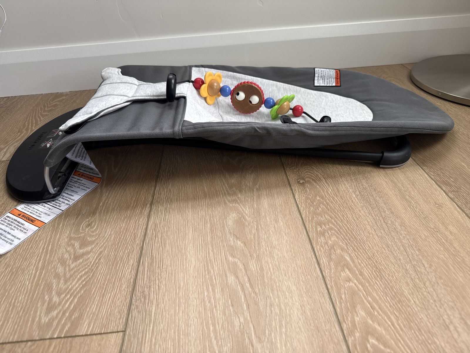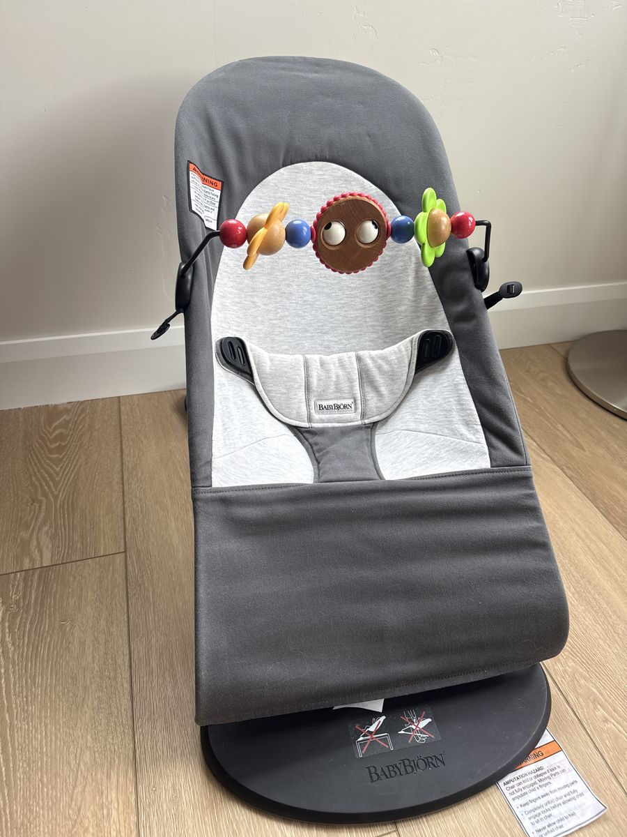 VenmoBabybjorn baby Bouncer Balance Soft with googly eyes toy.