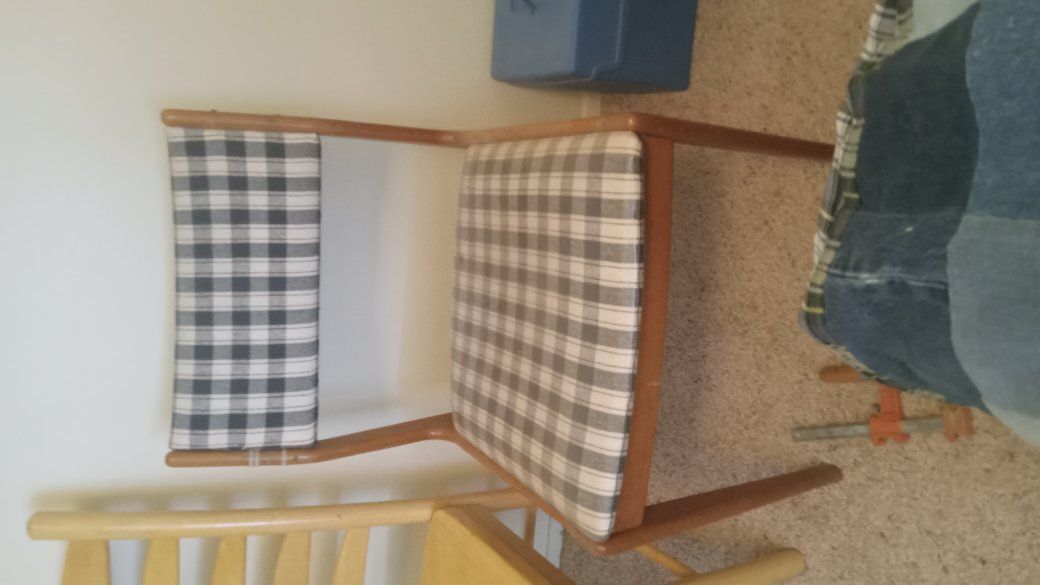 4 free chairs. 3 are checkered one is all wood.
